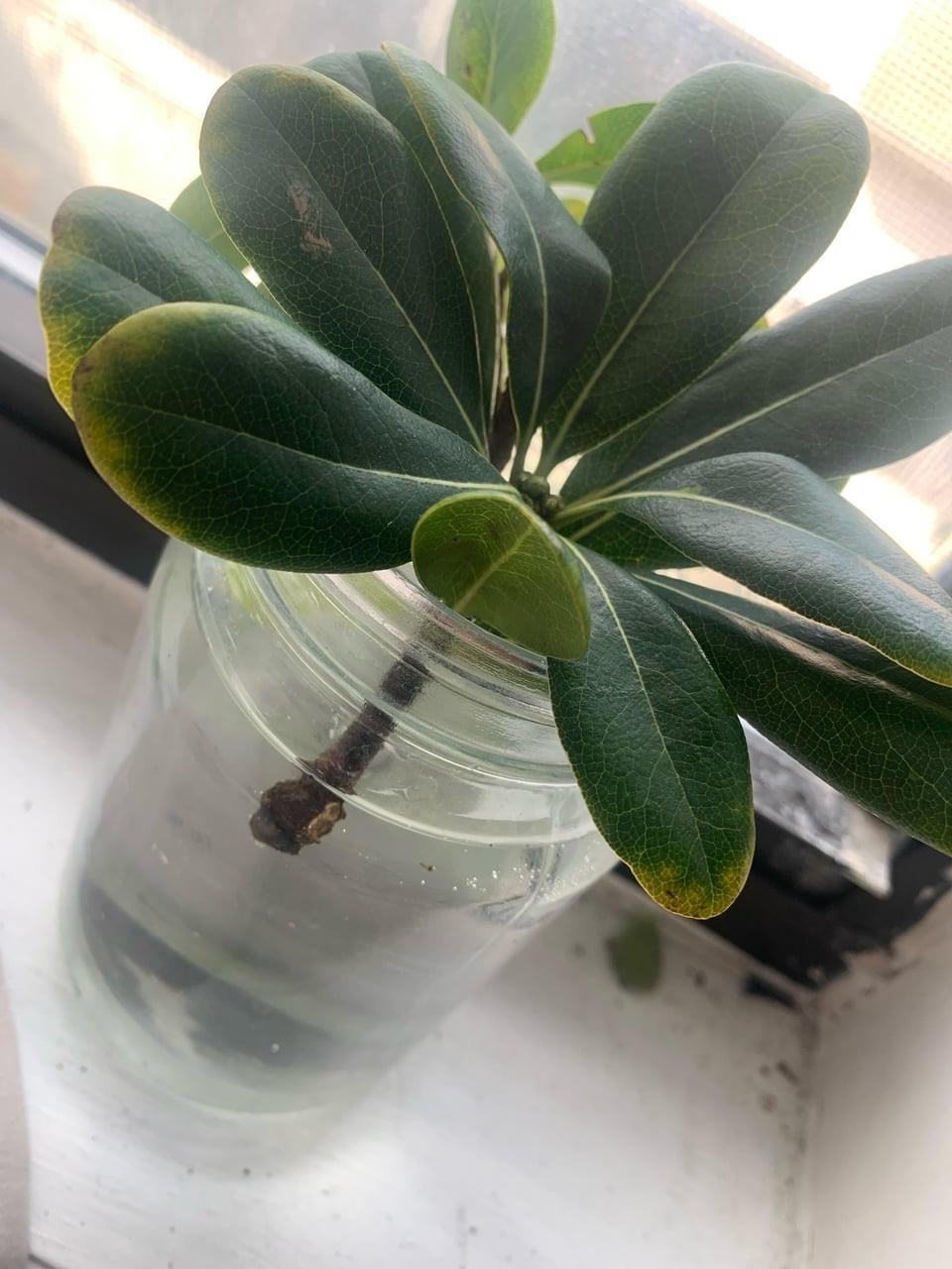 Rhododendron, evergreen shrub that produces huge sets of flowers in the spring. The buds at the top are flower buds. They wont bloom though after being severed from the plant. You can possibly propagate that, if you get it to root, grow it outside in a part-shade area. Eventually (years and years later) you can put it in the ground as a shrub