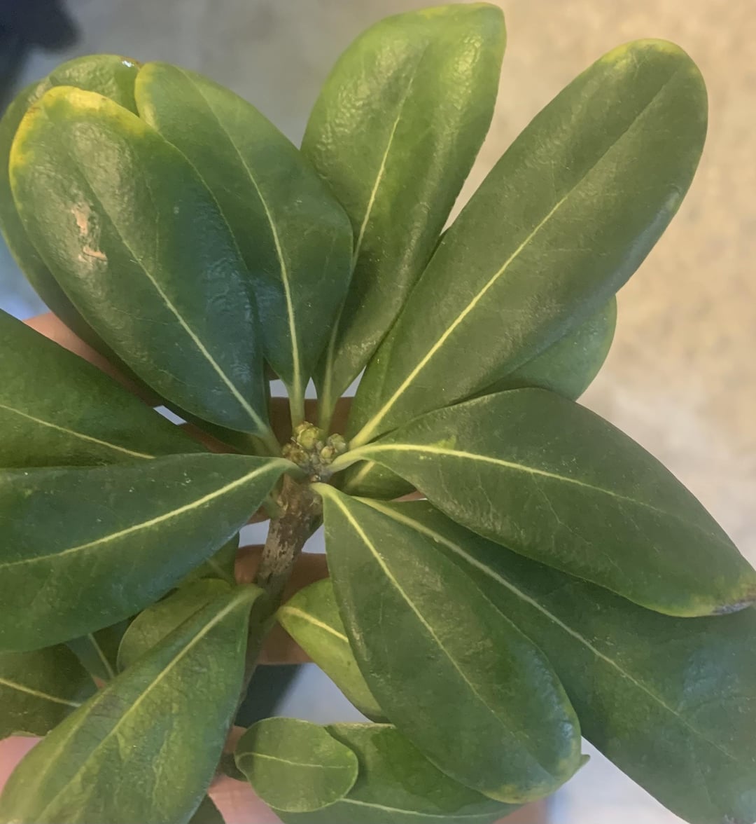 Looks like it could be a trinette. I know people are saying rhododendron but it honestly looks like an arboricola trinette to me.