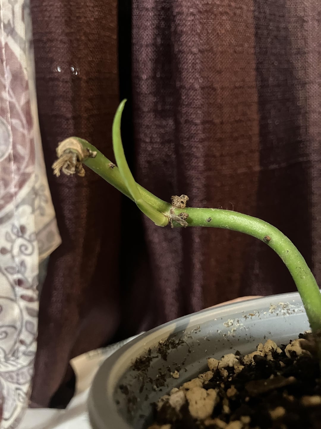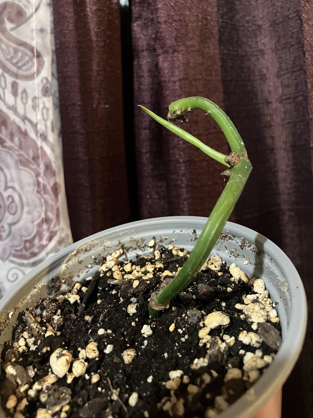 Ich musste dieses Stück Pothos vor dem zu Tode von meiner (geschäftigen) Mutter zu Tode ignoriert haben, war nur ein verwurzelter Zweig, als ich nachließ und rettete. Das Wasser war böse grün die Wurzeln, wo soooo überwuchs. Ich war ehrlich gesagt besorgt, dass es im Übergang von Wasser zu Boden nicht geschafft wird, wobei alle Wurzeln aufgewachsen sind. Ich bin absolut begeistert zu sagen, dass sie nach ungefähr einem Monat, in dem ich meinen Atem angehalten und über sie bewertet habe, mir bei Grooooooowth dankt !!!! Ich fragte meine Mutter, ob wir wüssten, was es ist, aber sie erinnert sich nicht mehr (nicht wirklich überrascht, wenn man bedenkt, dass diese arme Pflanze über ein Jahr lang an der Fensterbrettung wartet). Ehrlich gesagt, ich freue mich darauf, diese Reise zu unternehmen und zusammen mit meiner kleinen Pflanze herauszufinden!