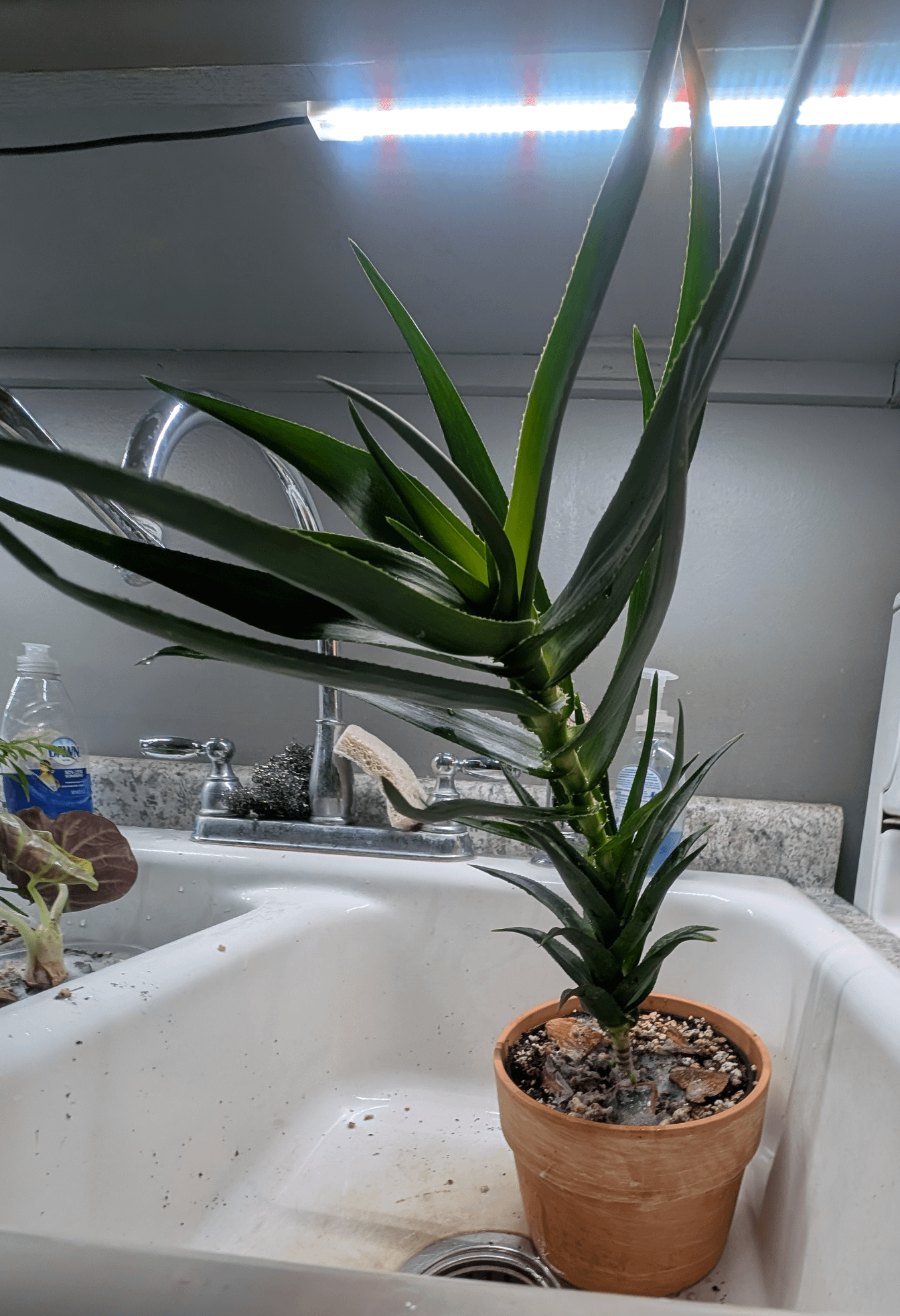 Wie Sie sehen können, erstreckte sich diese langbeinige Aloe -Pflanze bis zu der kleinen LED, unter der es war, und begann dann größer nach oben … ein bisschen peinlich, aber ich glaube, ich weiß, was es jetzt braucht.