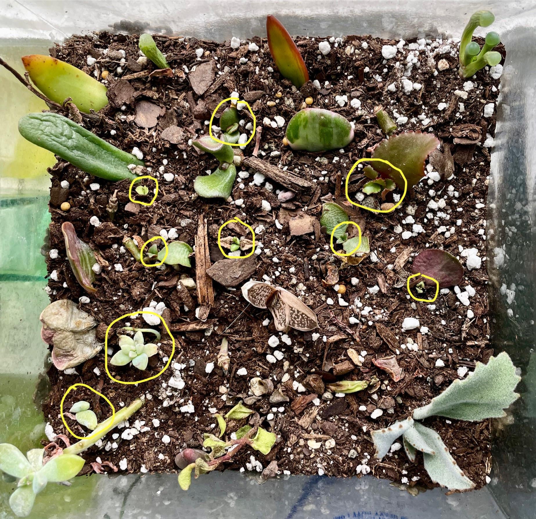 Facebook Twitter LinkedIn Pinterest Bluesky Threads Begann dieses Glas zufälliger Sukkulenten -Requisiten vor Monaten und bekam schließlich einige frische grüne Sprossen auf eine Reihe von ihnen! Von: Neverwasalwaysam