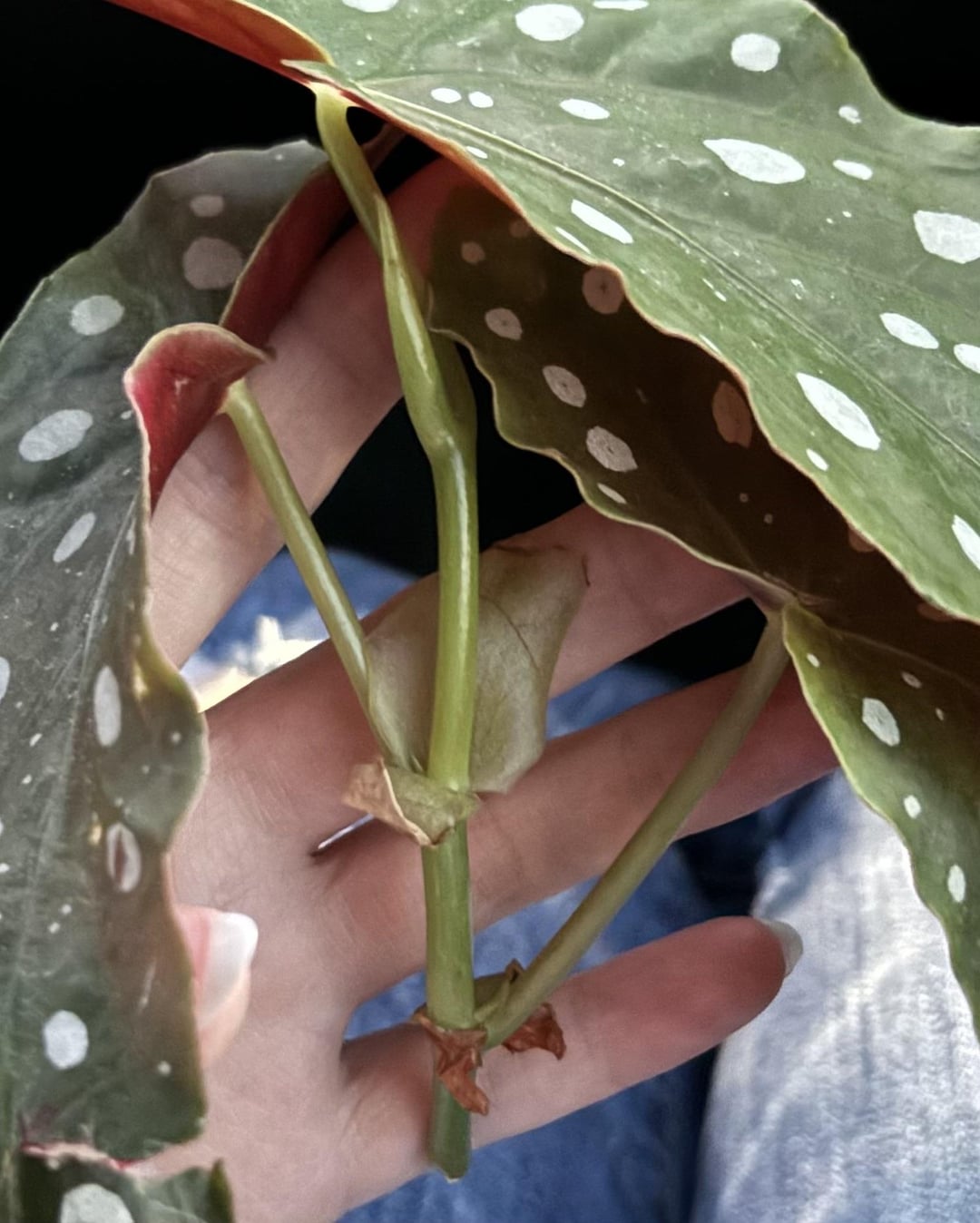 Facebook Twitter LinkedIn Pinterest Bluesky Threads Wo soll ich diese Polkadot -Begonie trimmen, um sie zu verbreiten? Ich habe vor, es in Wasser zu stecken. Von: Ok-Patience-7327