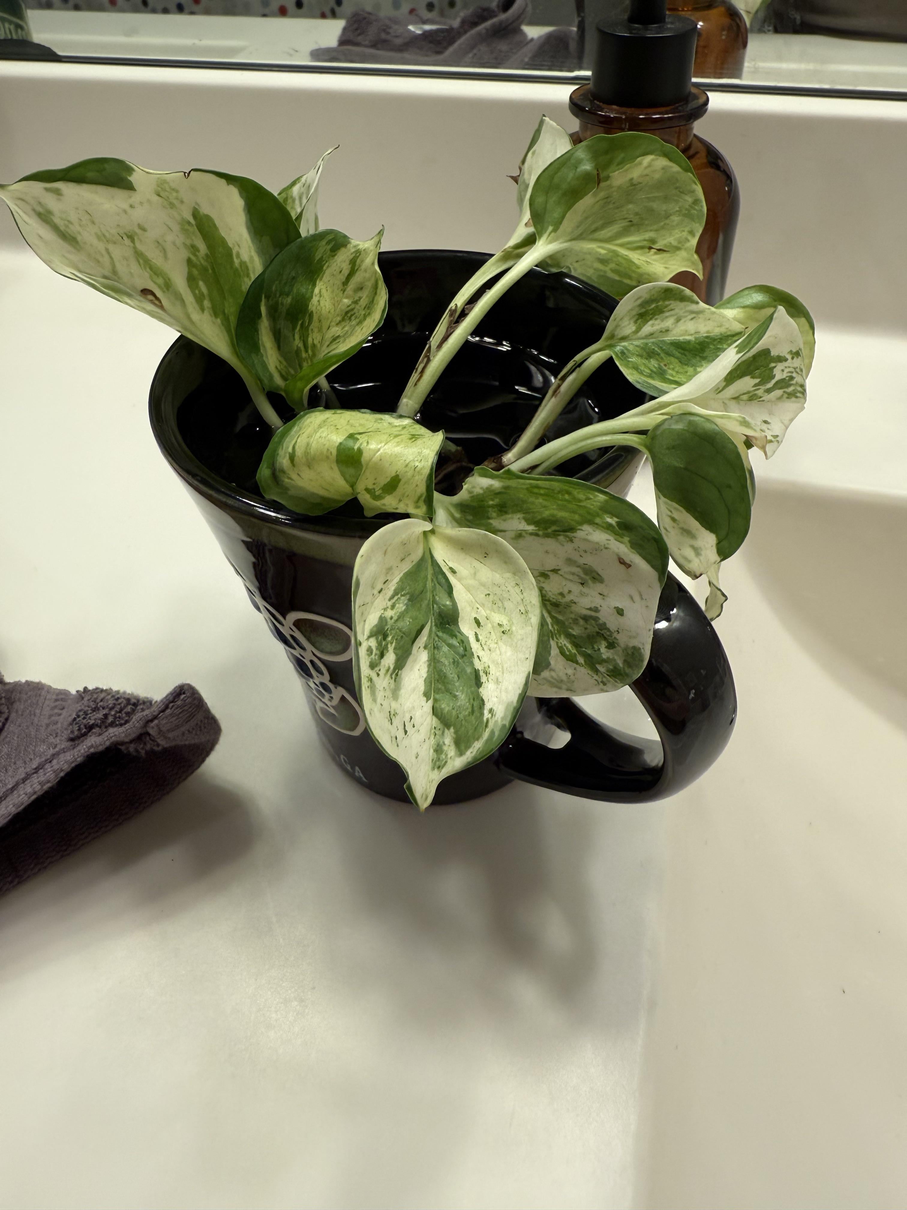 War im beliebten blauen Laden aller und sie hatten diese schönen Pothos in einem Topf mit Orchideen, die markiert waren. Die Orchidee war tot, der Boden war ziemlich trocken und angesichts des grünen Lichts nahm ich die Pothos -Abschnitte. Sie sind gerade im Wasser, aber ich habe vor, in einen kleinen klaren Topf mit dem Boden zu stecken. Die meisten von ihnen haben kleine Wurzeln.