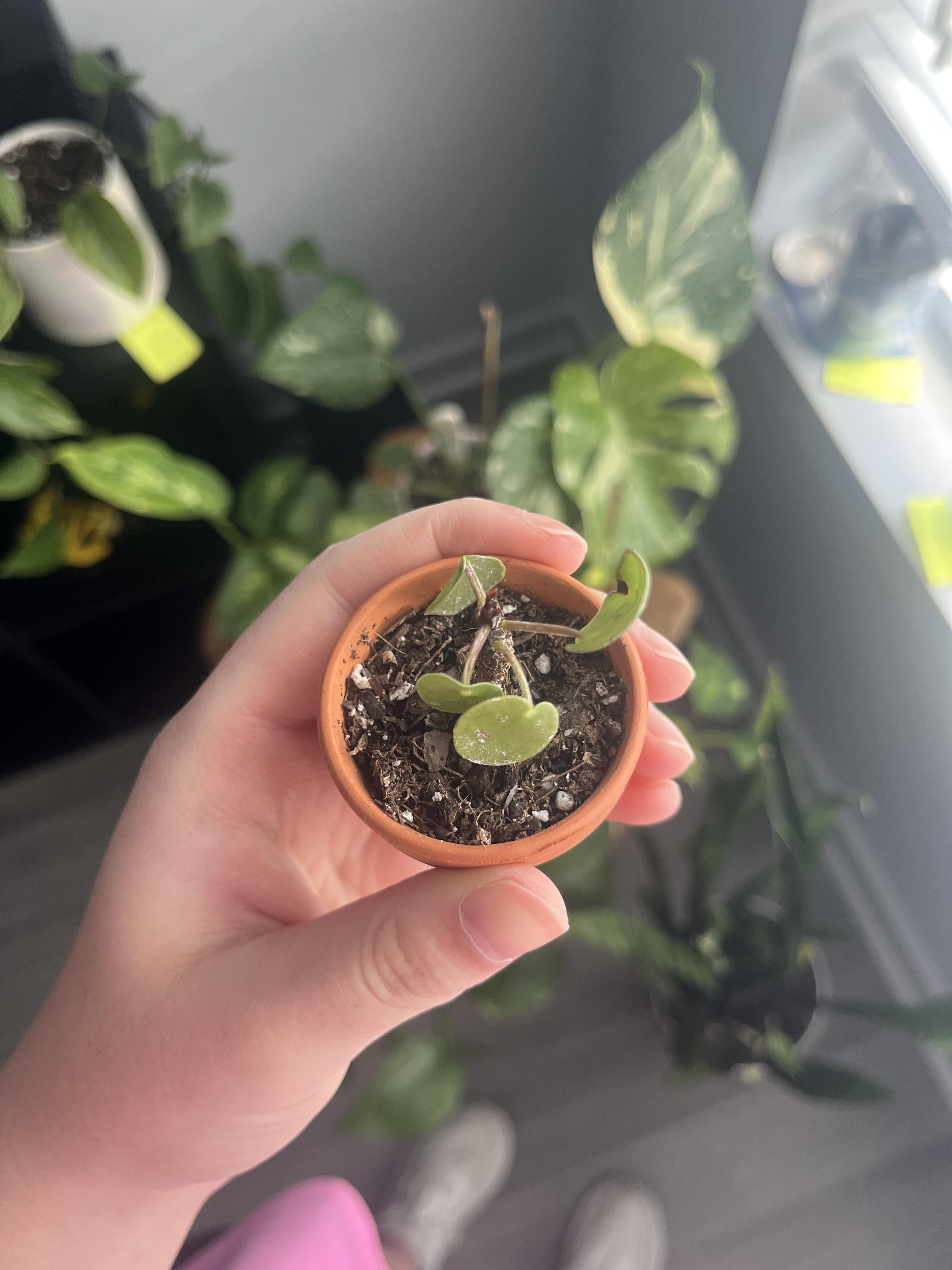 4. I used a shot glass of water with cling wrap over it and a slit for the Pilea.. then when it has roots you’re going to want a larger pot.. mine has grown so fast and already has about 9 babies coming off of it in the maybe 7 months that I’ve had it.