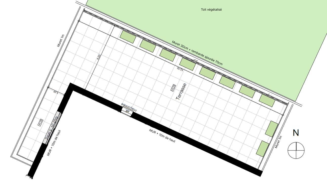 Ich möchte eine große, relativ hohe Terrasse und einen kleinen Weg auf dem Dach anordnen. Es ist hauptsächlich nach Norden ausgerichtet. Mit einer völlig klaren Sicht auf den Norden, Osten und teilweise Westseite (ein weiteres Gebäude blockiert die Sonne im Nordwesten weiter). Auf der Südseite ist es der Rest des Gebäudes, der ziemlich hoch steigt und alles Licht blockiert.