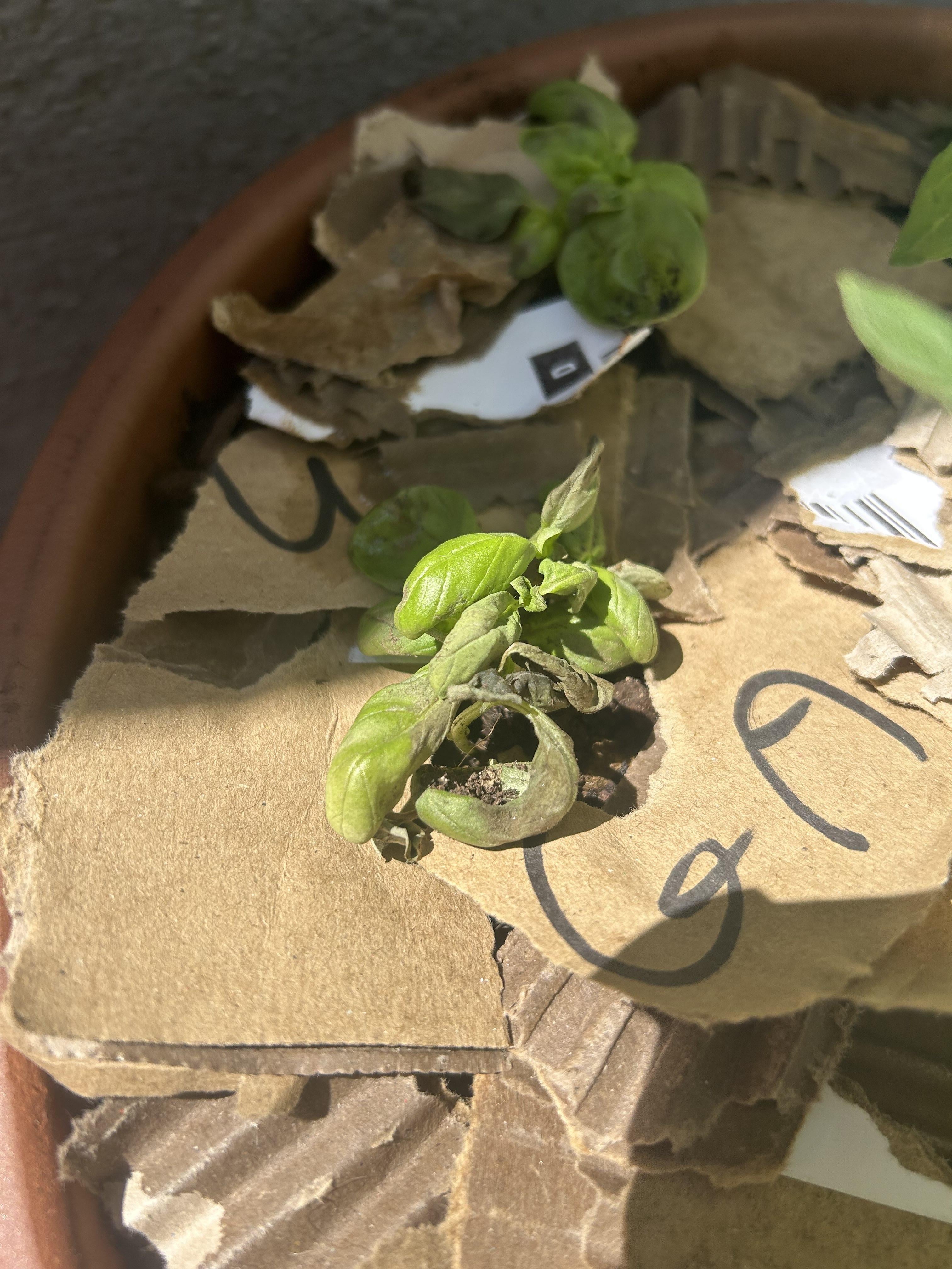 Ich werde einen Job gemacht, weil ich bemerkt habe, dass ich keine Informationen gegeben hatte. Also habe ich meinen Basilikum mit Tomaten in einem Terrakotta -Topf gepflanzt, der in meinem Balkon ist. Ich habe sie vor 3-4 Tagen gekauft und direkt transplantiert. Ich dachte, sie wären schlecht wegen seines kleinen Topfes und ich könnte aufholen, aber seit meinem Kauf sind sie fast so (das ist schlimmer). Ich habe heute versucht, mit Karton zu mulch, weil ich gesehen habe, dass es dauerte, um Feuchtigkeit zu halten. Was kann ich tun?