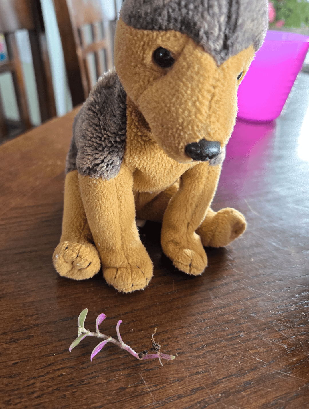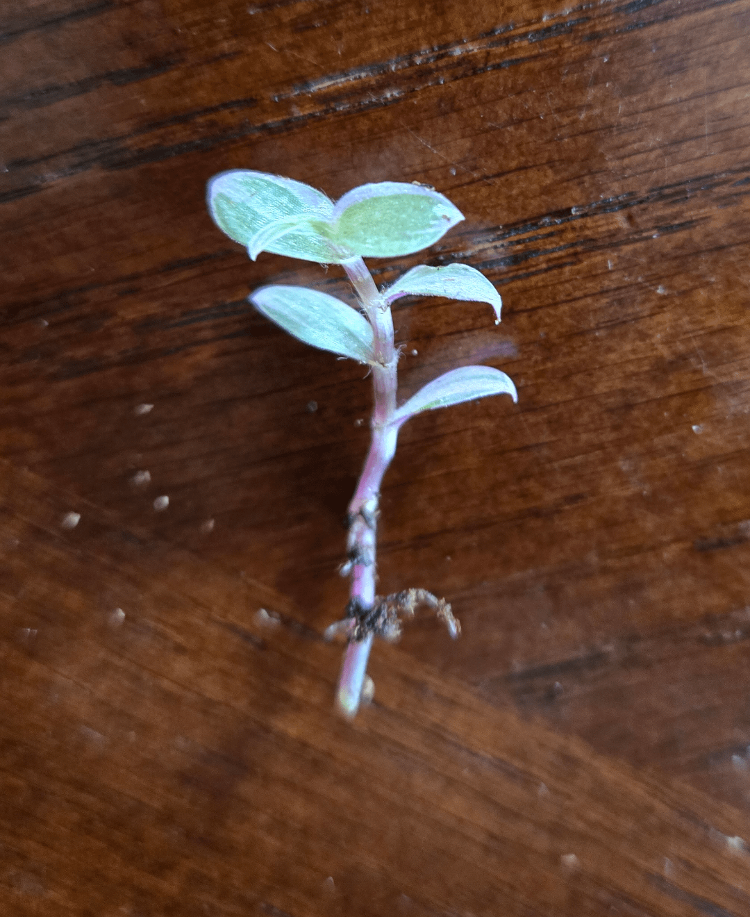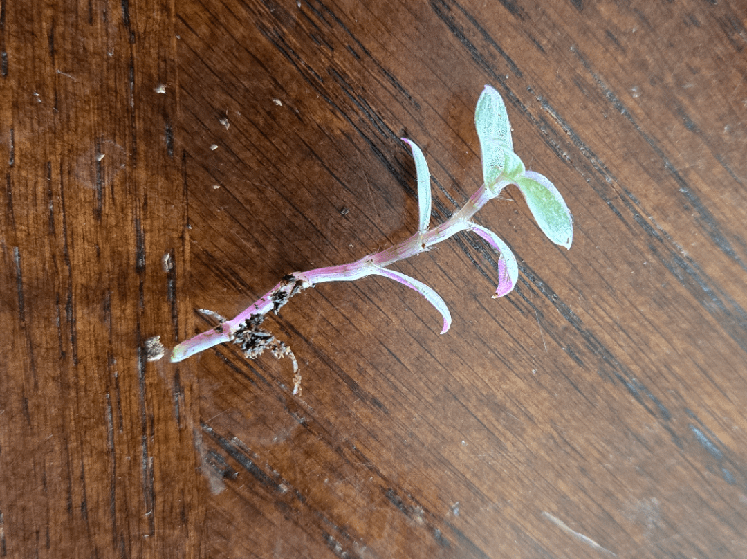 Ich habe diese Pflanzentrümmer gefunden, als ich ein Geranium repottierte, das ich diese Woche gekauft habe, und als ich es abholte, wurde mir klar, dass es bereits kleine Wurzeln wuchs. Es sieht aus wie ein Miniatur -Tradeskantia nanouk. Irgendeine Idee, was genau es ist? Mütze Baby für Skala im letzten Bild (hatte keine Banane, sorry).