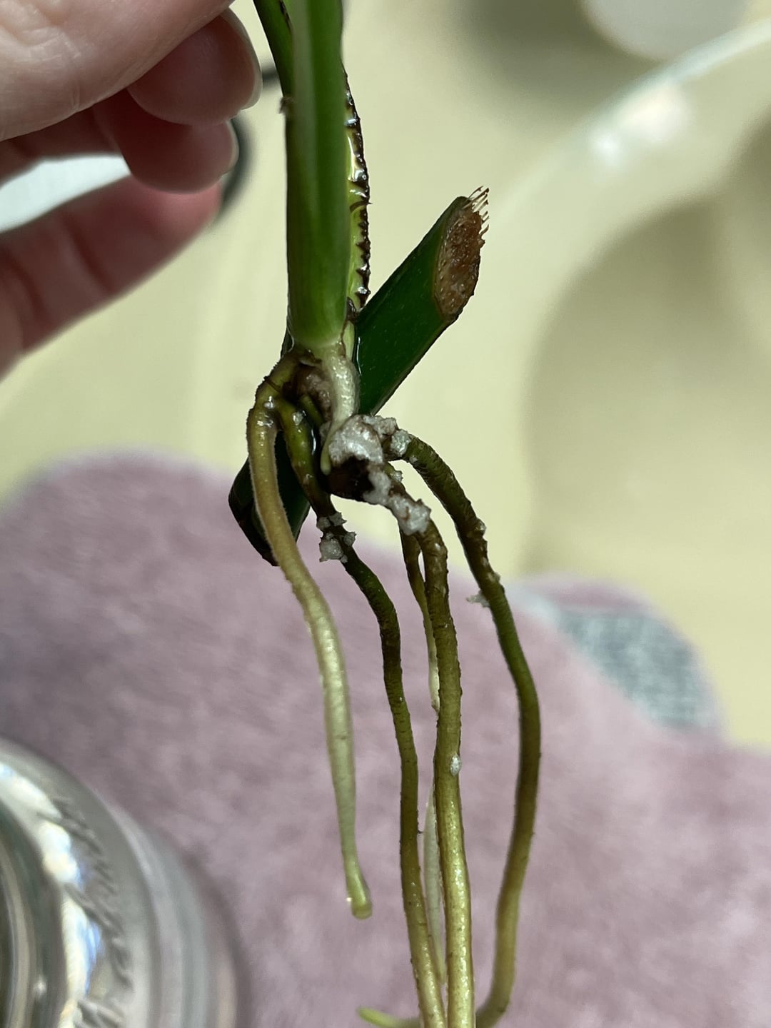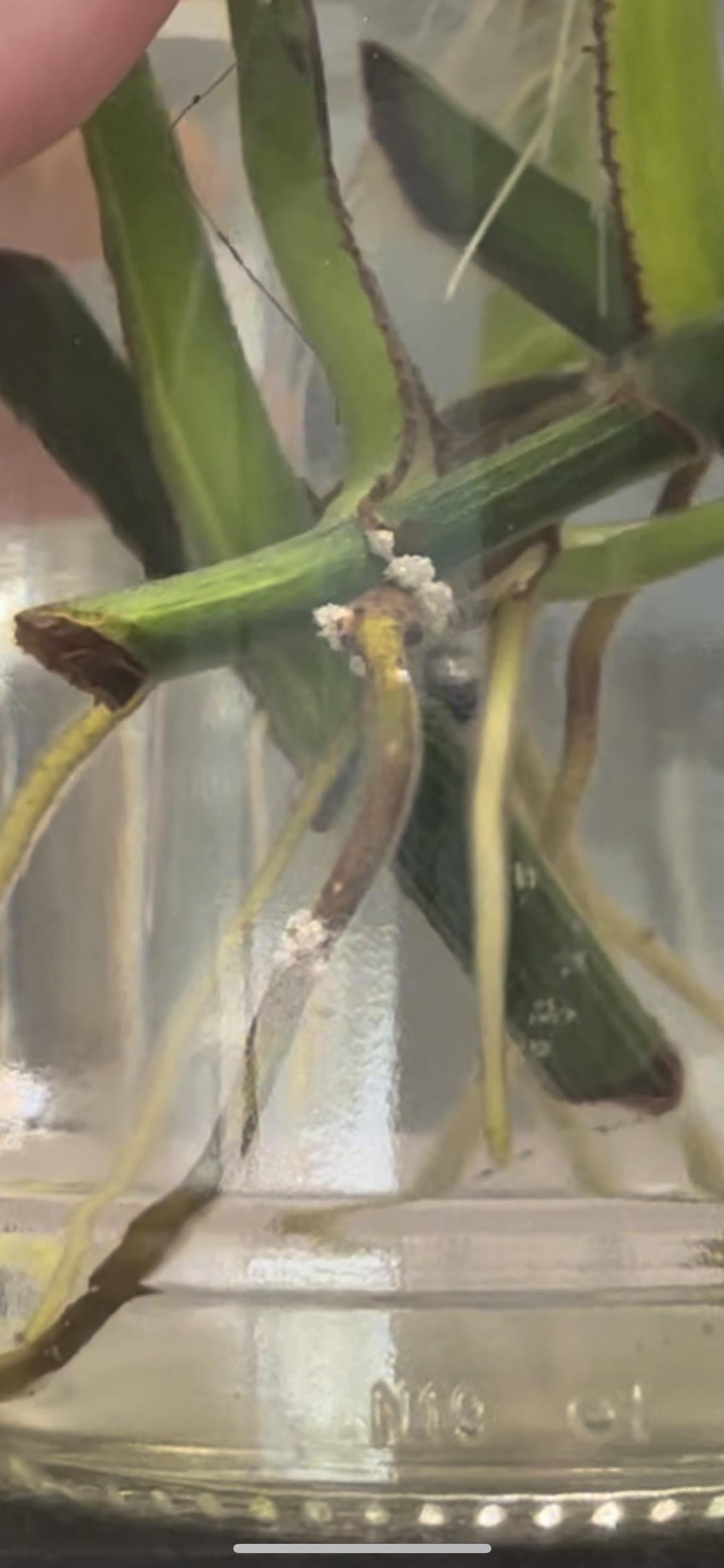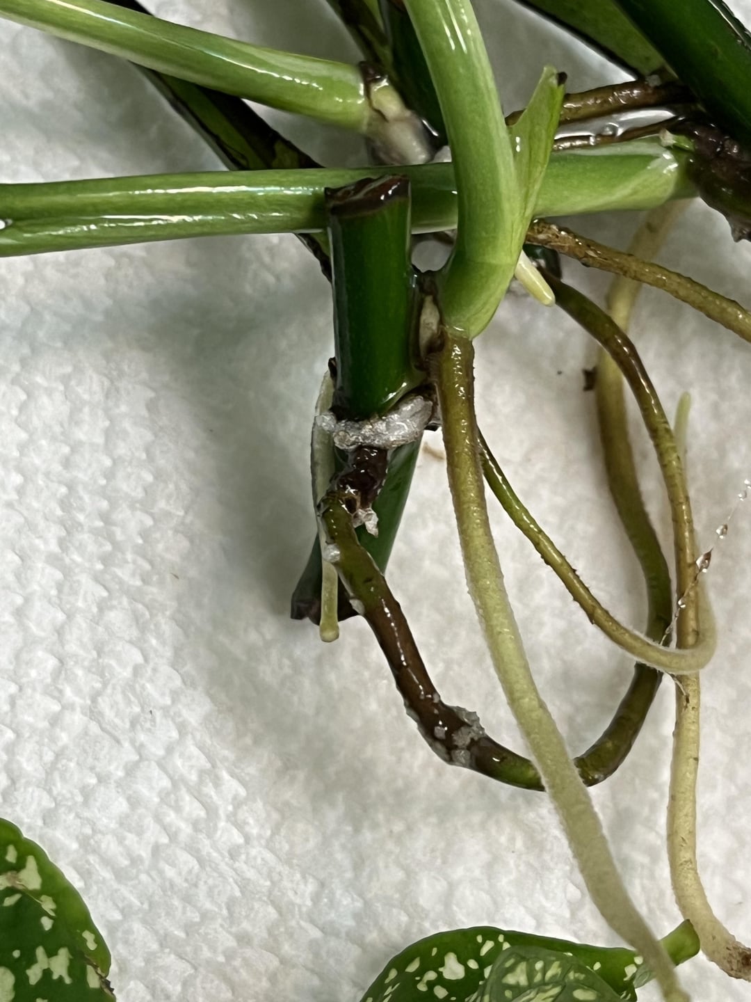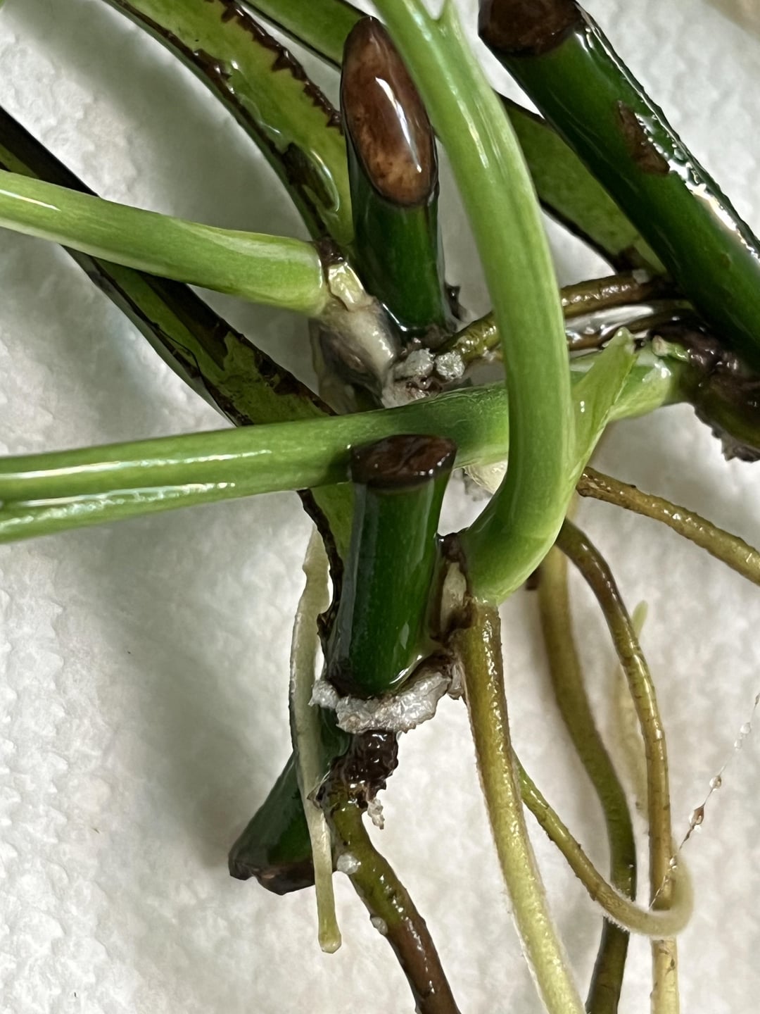 Wirkte Wasser meine Pothos zusammen mit 4 Polkadot -Stecklingen und einem Zz -Schnitt für ein paar. Was sind diese auf den Wurzeln? Sie sind irgendwie fest. Sind diese neuen Taschen für Wurzeln, die auftauchen? Oder eine Form?