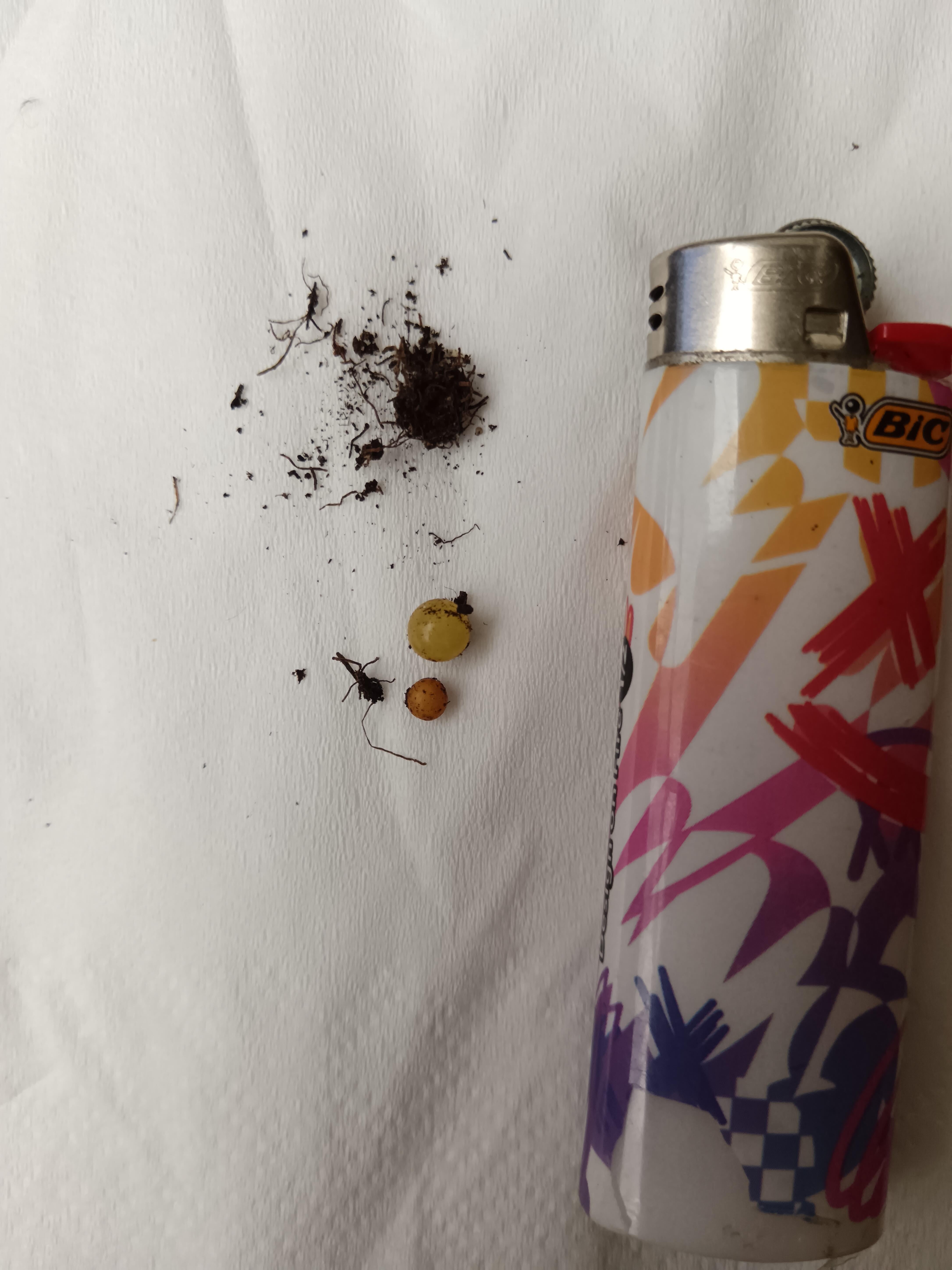 Ich finde mich zum zweiten Mal, diese kleinen gelben Kugeln in meinen Pflanzen zu finden. Das erste Mal, dass es in einem Rosenbusch war, ist es in meinen wilden Blumen. Ich weiß überhaupt nicht, was es ist. Es ist ziemlich transparent, von verschiedenen Größen und platzt, wenn ich es drücke.