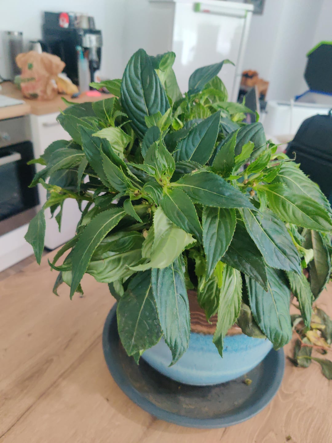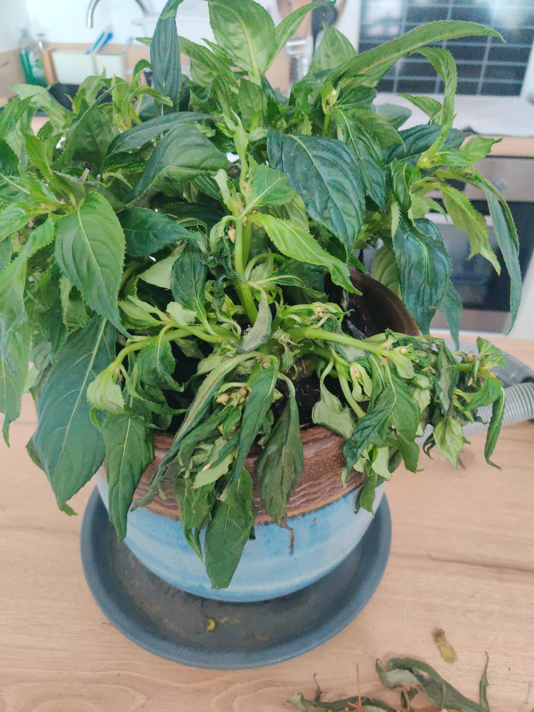 Ich komme diese Pflanze nur an, wenn sie Anzeichen von Wassermangel aufweist (es ist sehr ausdrucksstark). Andererseits war es die Pflanze, die an eine Wand geklebt wurde. Ich habe das Gefühl, dass es keine Luft hatte.