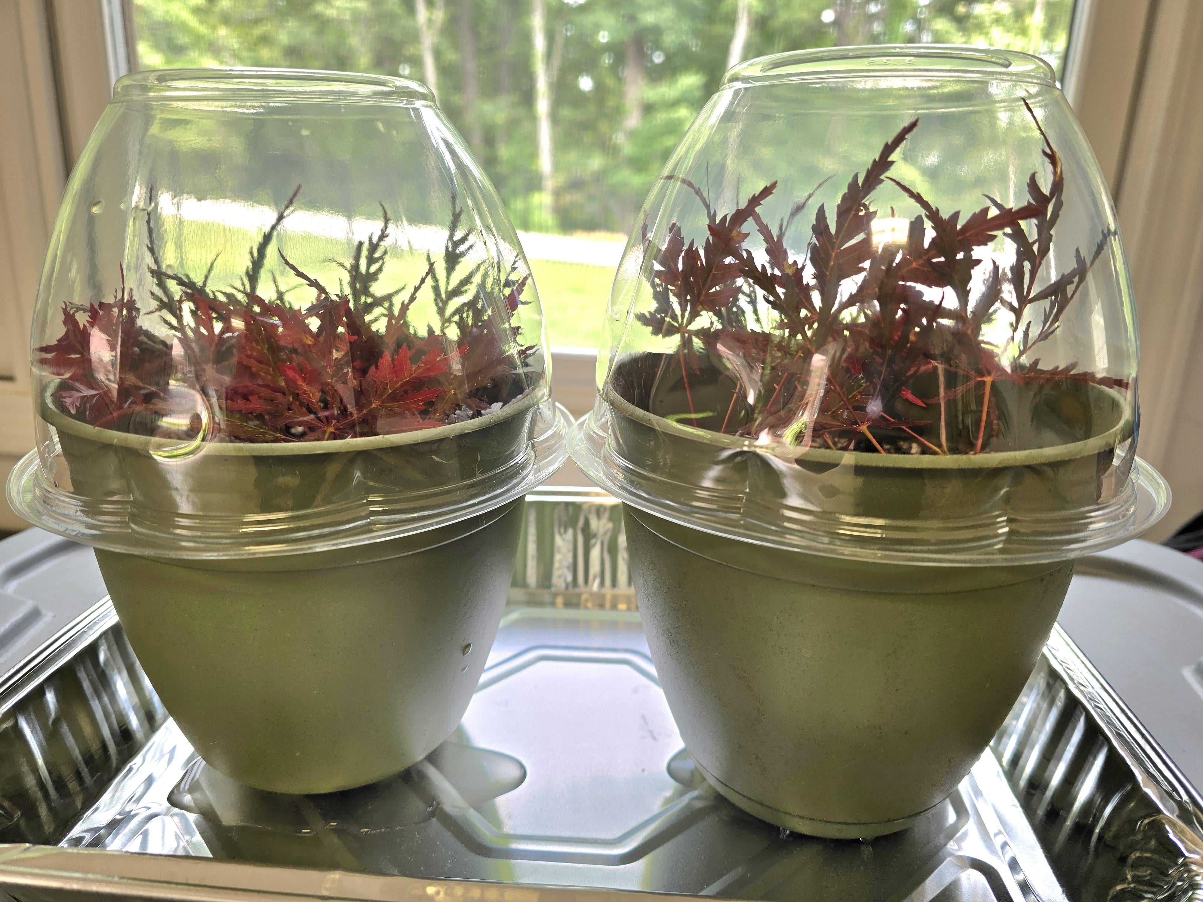 Dies sind meine japanischen Ahornschnitte für zukünftige Bonsai. Die Einweg -Salatschalen passen perfekt auf die Töpfe, es gibt jedoch keine Luftzirkulation. Irgendeine Idee, wie man sie modifiziert?