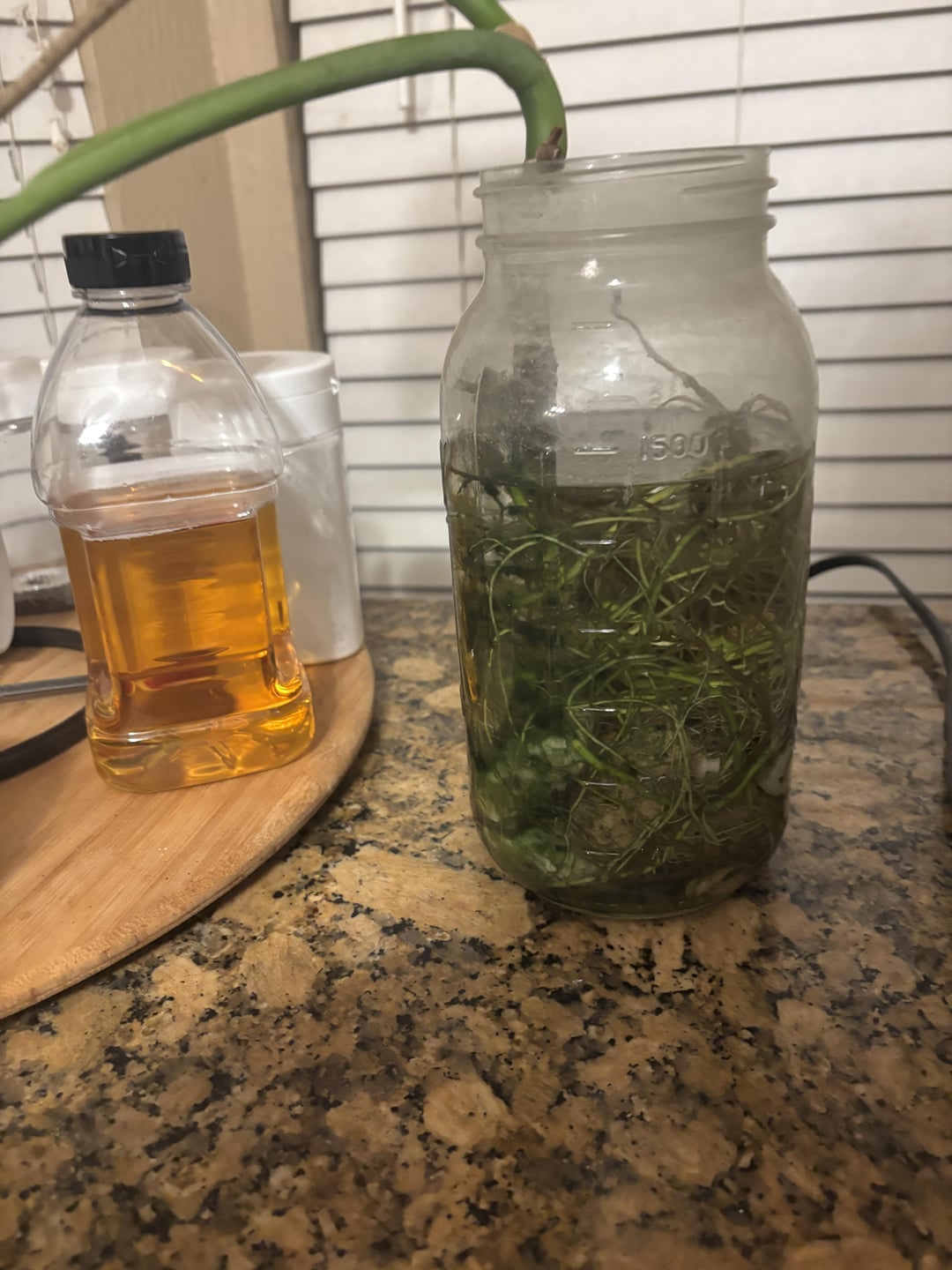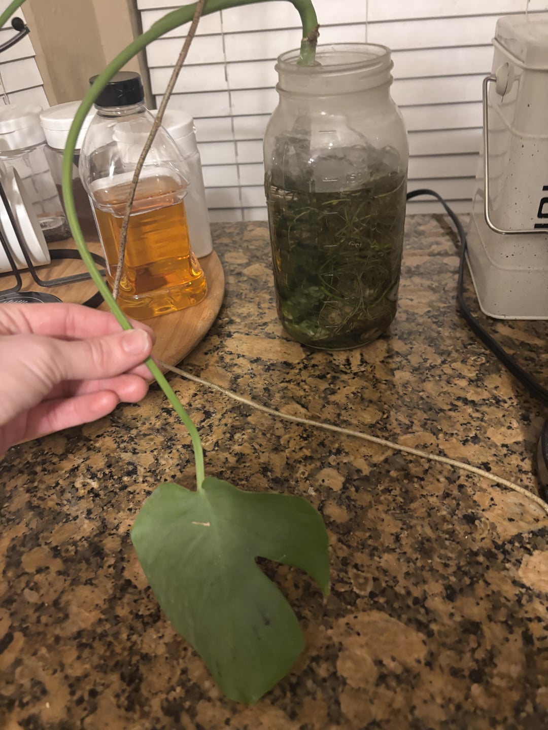 Vor ungefähr zwei Jahren habe ich die ursprüngliche Anlage versehentlich über Wasser überzogen, aber ich habe es geschafft, einen kleinen Ausschnitt zu sparen. Seitdem hat dieser kleine Überlebende (der mit nur einem Blatt begann) zwei weitere Blätter gewachsen und viele Wurzeln entwickelt. Ich bin begeistert von ihrem Fortschritt, aber auch ein wenig nervös – die Lösung der ursprünglichen Pflanze hat mich zum Zögern dazu gebracht, mich zu repotieren.
