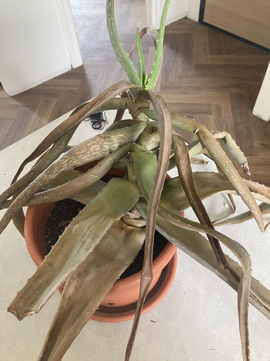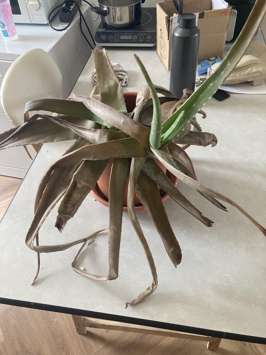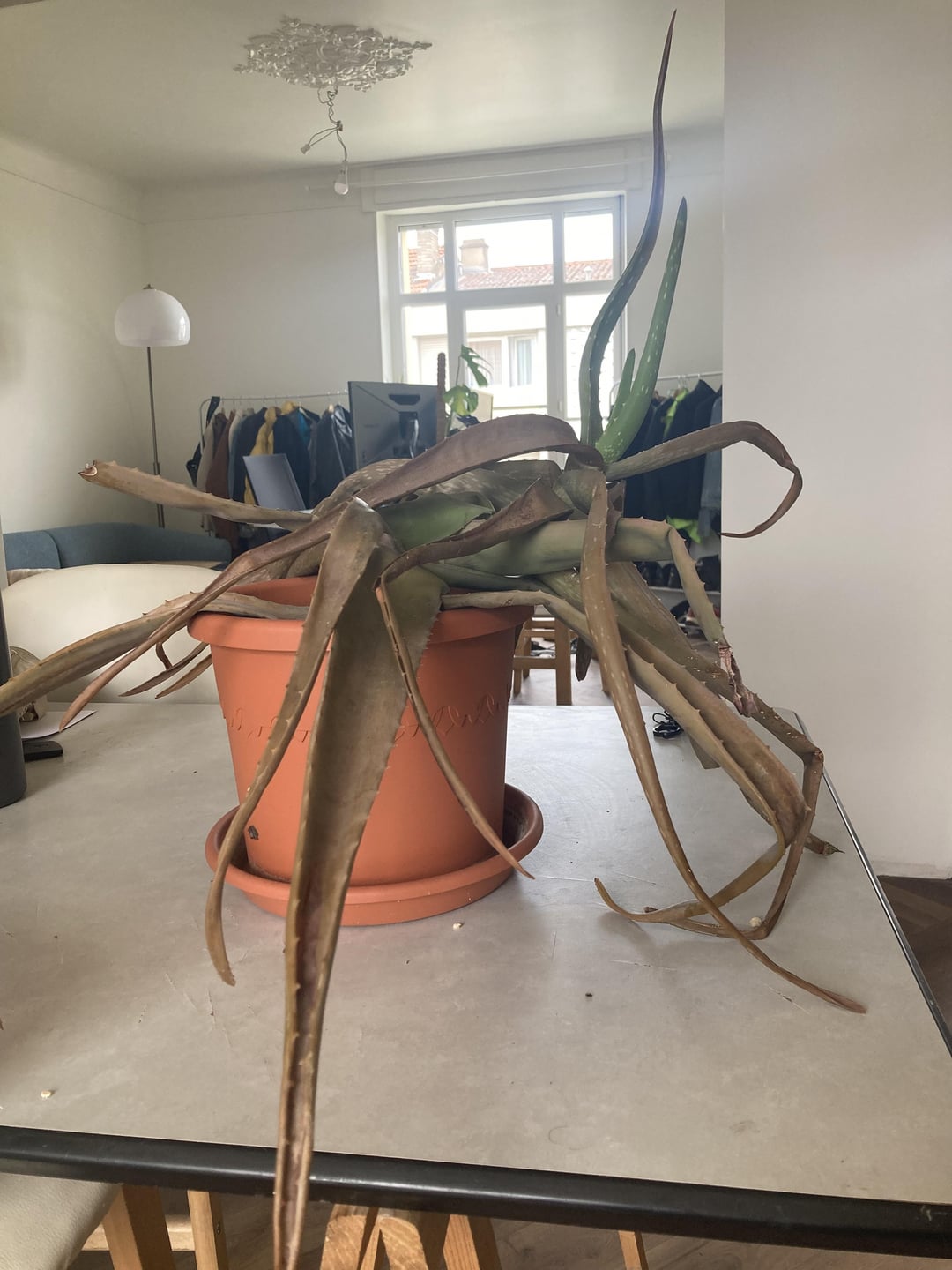 Meine Aloe Vera ist ein wenig traurig, dass er mir lange gefolgt ist, er begann sein Leben in Südfrankreich auf einem westlichen Balkon, auf dem er blühte! Jetzt ist es im Nordosten Frankreichs auf einem nordöstlichen Balkon