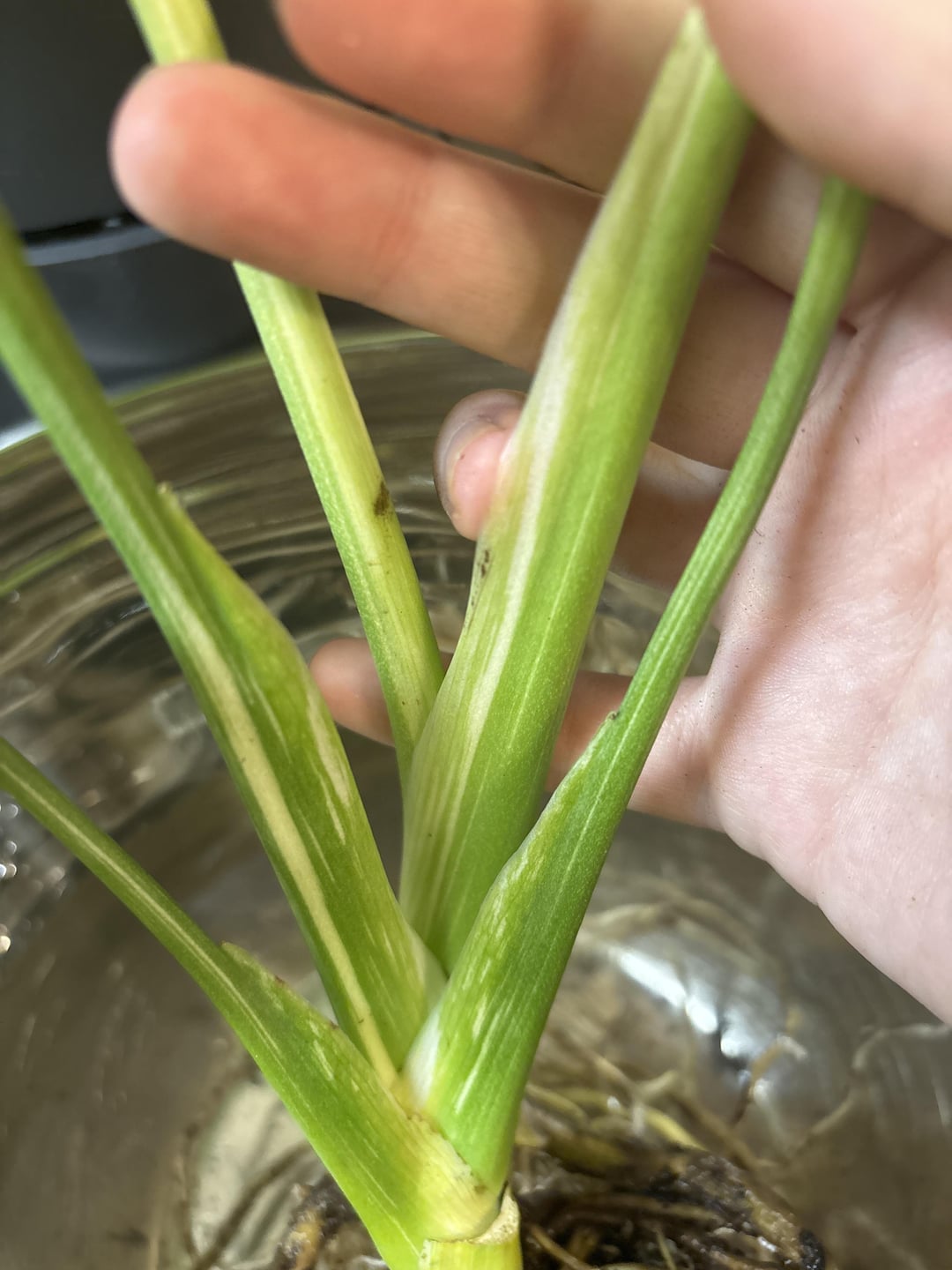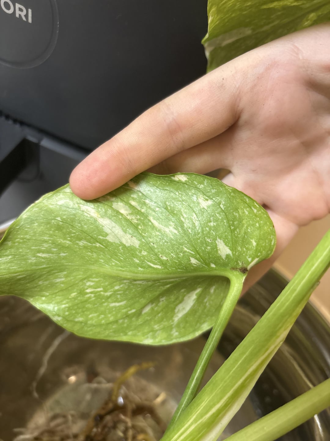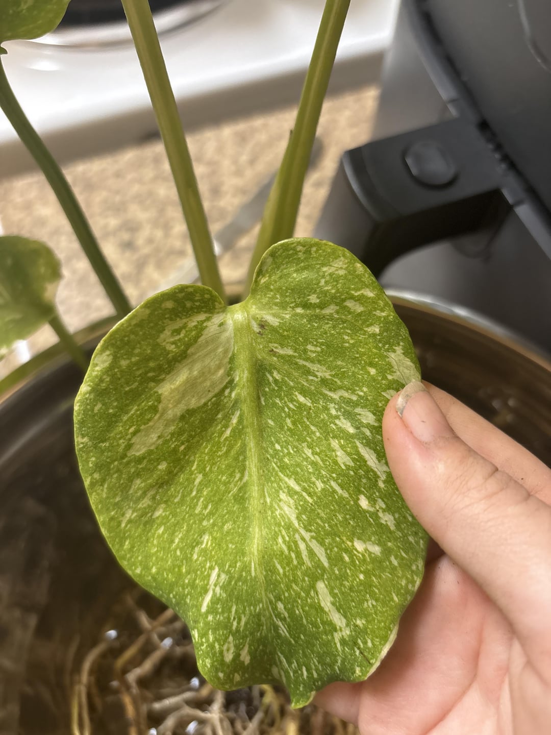 Mein Thai Con Monstera hat diese seltsamen Stellen, die bräunlich aussehen, wenn eine Taschenlampe ihnen hilft, zusammen mit Markierungen am Stiel! Die Wurzeln scheinen in Ordnung zu sein! Sie befindet sich in klobiger Bodenmischung in einem 8 -Zoll -Topf, als ich sie herausnahm, um mir die Wurzeln anzusehen, die sie einen engen Wurzelball hatte, weil ich sie in einer 4 -Zoll -Wurzel bekam, die ich beim Rückschlag nicht gestört habe! Bitte hilf mir!