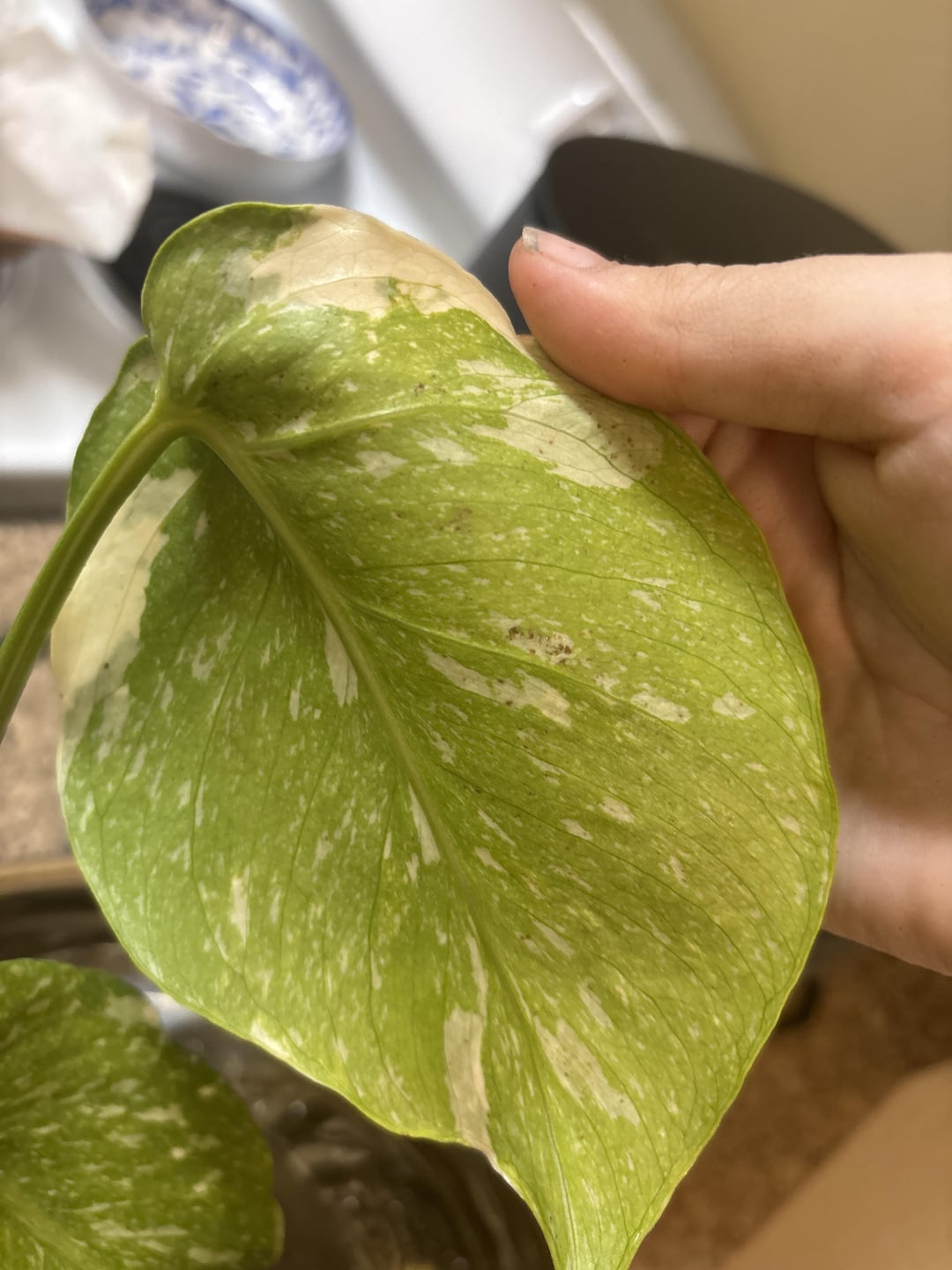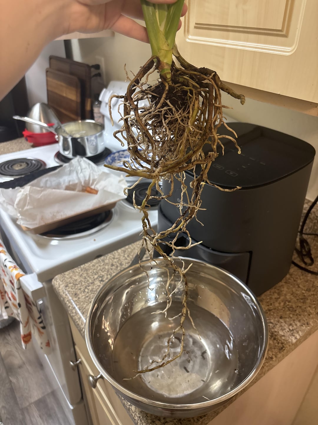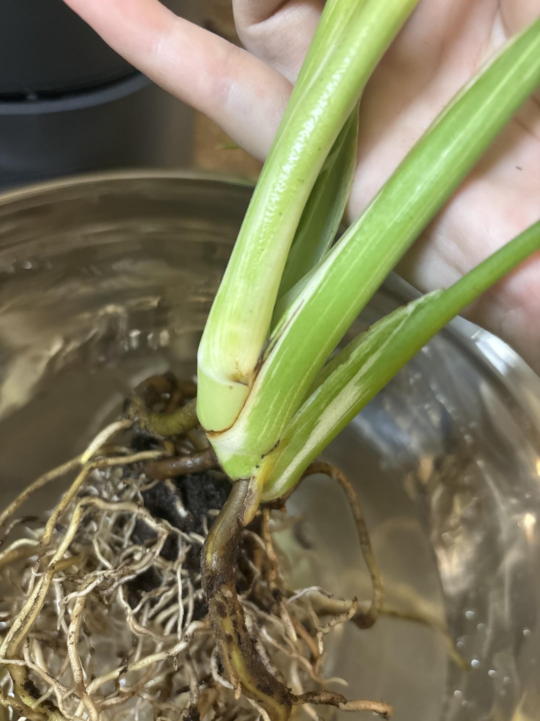 Mein Thai Con Monstera hat diese seltsamen Stellen, die bräunlich aussehen, wenn eine Taschenlampe ihnen hilft, zusammen mit Markierungen am Stiel! Die Wurzeln scheinen in Ordnung zu sein! Sie befindet sich in klobiger Bodenmischung in einem 8 -Zoll -Topf, als ich sie herausnahm, um mir die Wurzeln anzusehen, die sie einen engen Wurzelball hatte, weil ich sie in einer 4 -Zoll -Wurzel bekam, die ich beim Rückschlag nicht gestört habe! Bitte hilf mir!