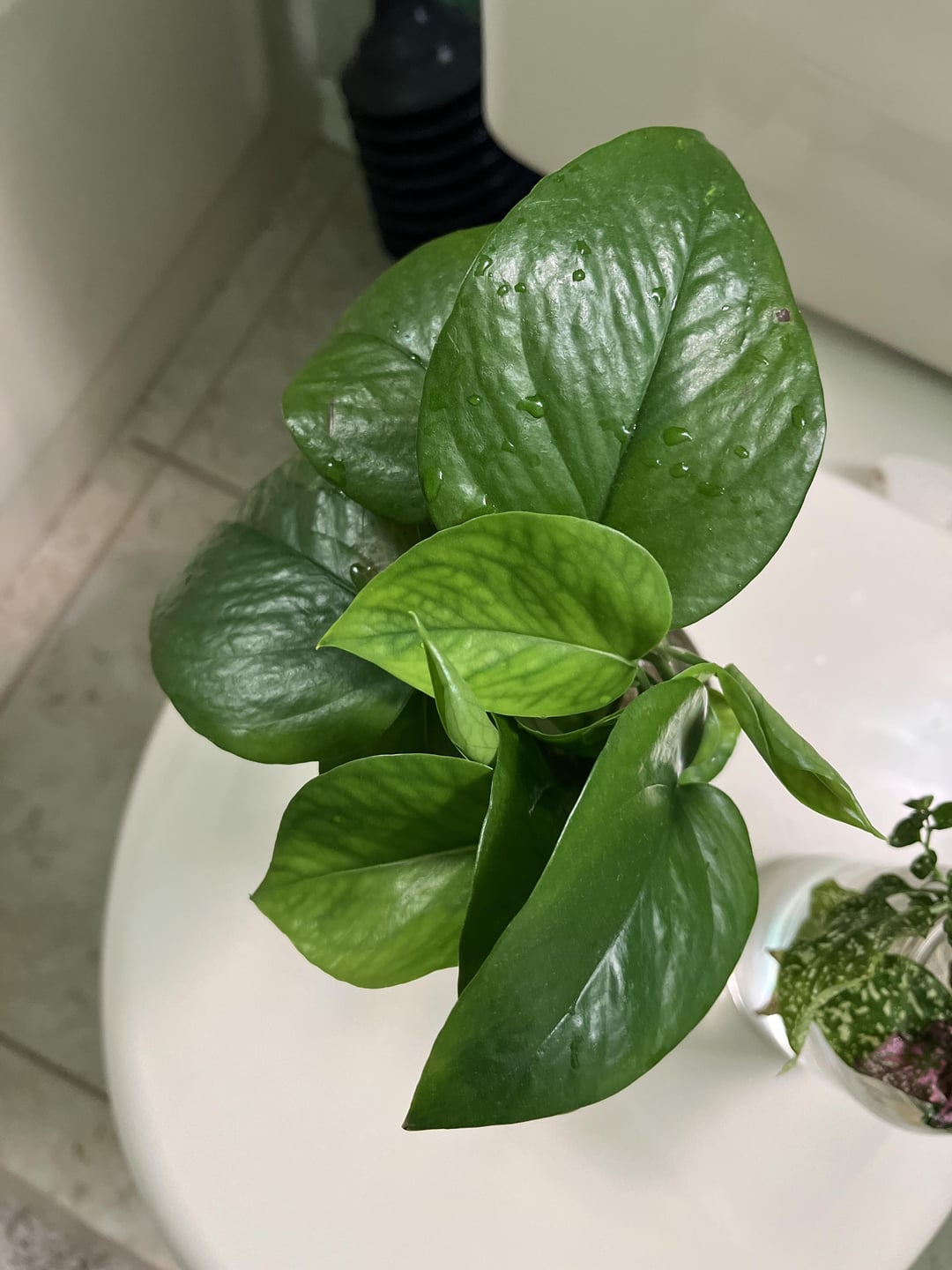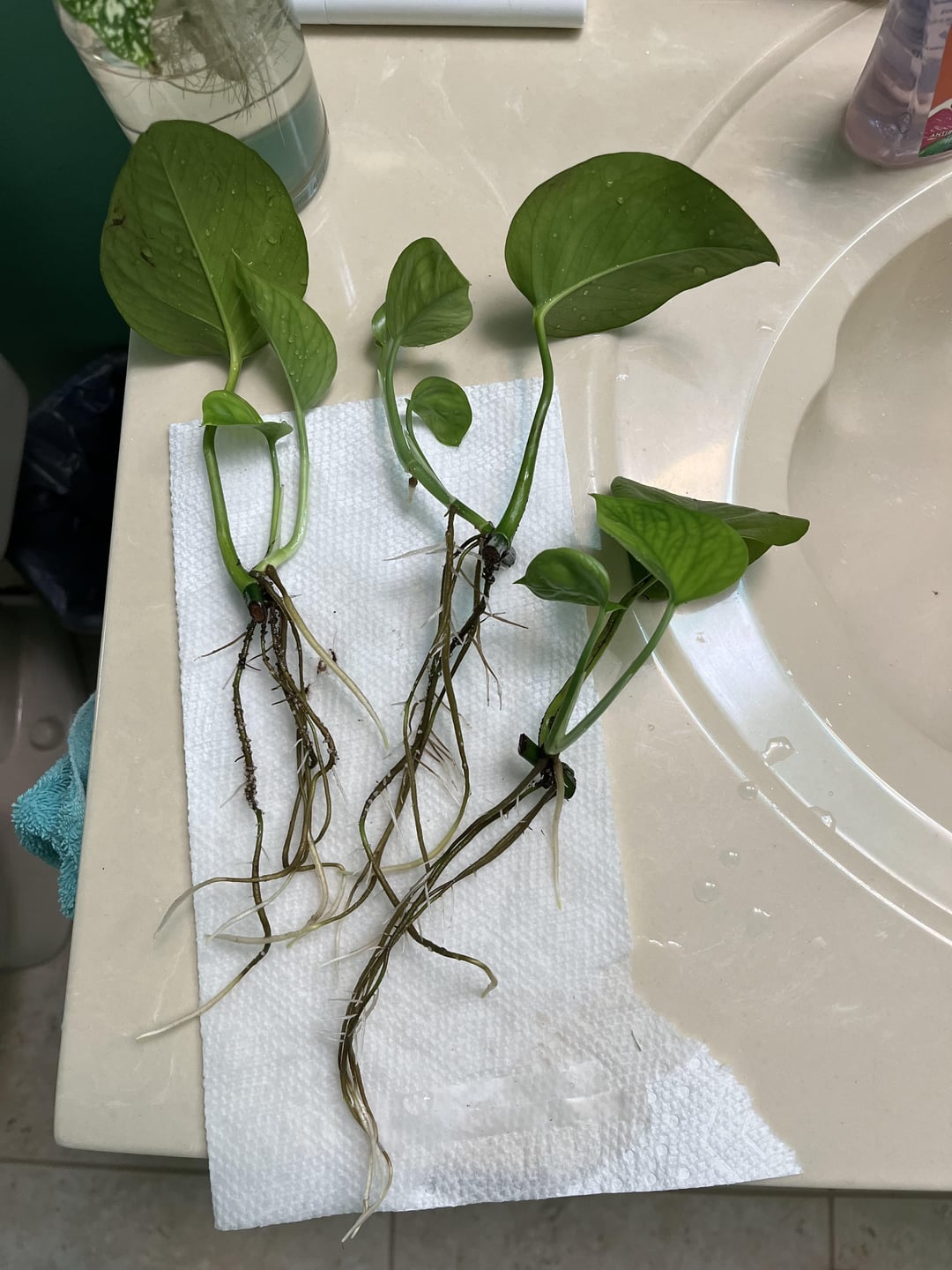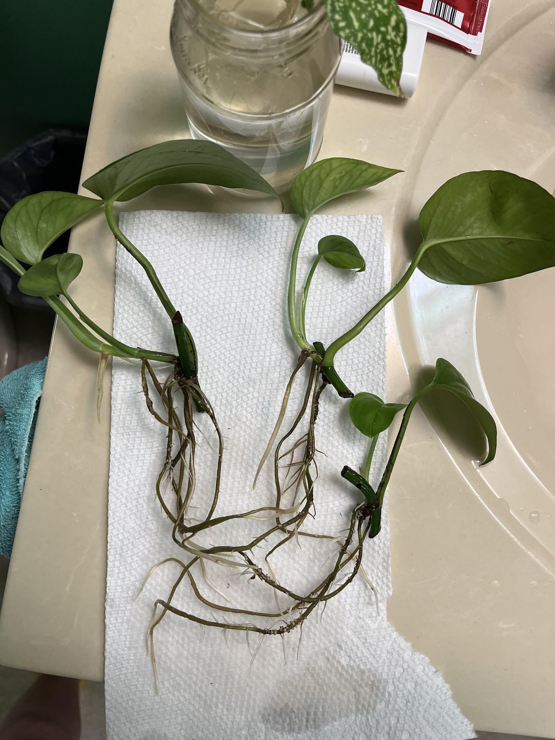 Ich habe diese Stecklinge seit wahrscheinlich über zwei (?) Monaten mit einigen anderen Stecklingen in Wasser gehabt. Ich habe wirklich nicht den Überblick behalten, ich habe nur darauf gewartet, dass sekundäre Wurzeln sich bilden. Ich weiß, dass es nicht notwendig war, ich möchte einfach nicht den Boden für die Pothos ständig feucht halten müssen.