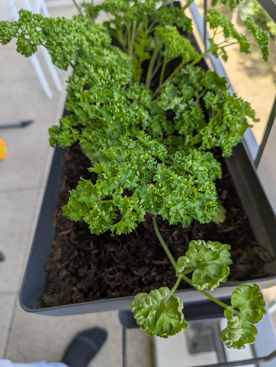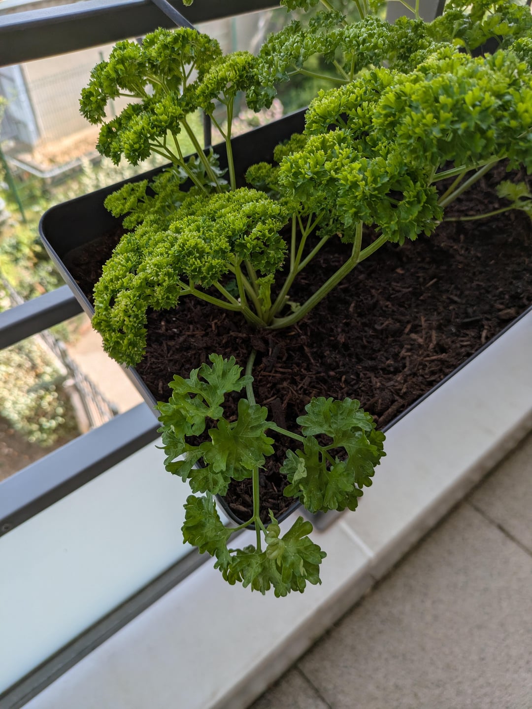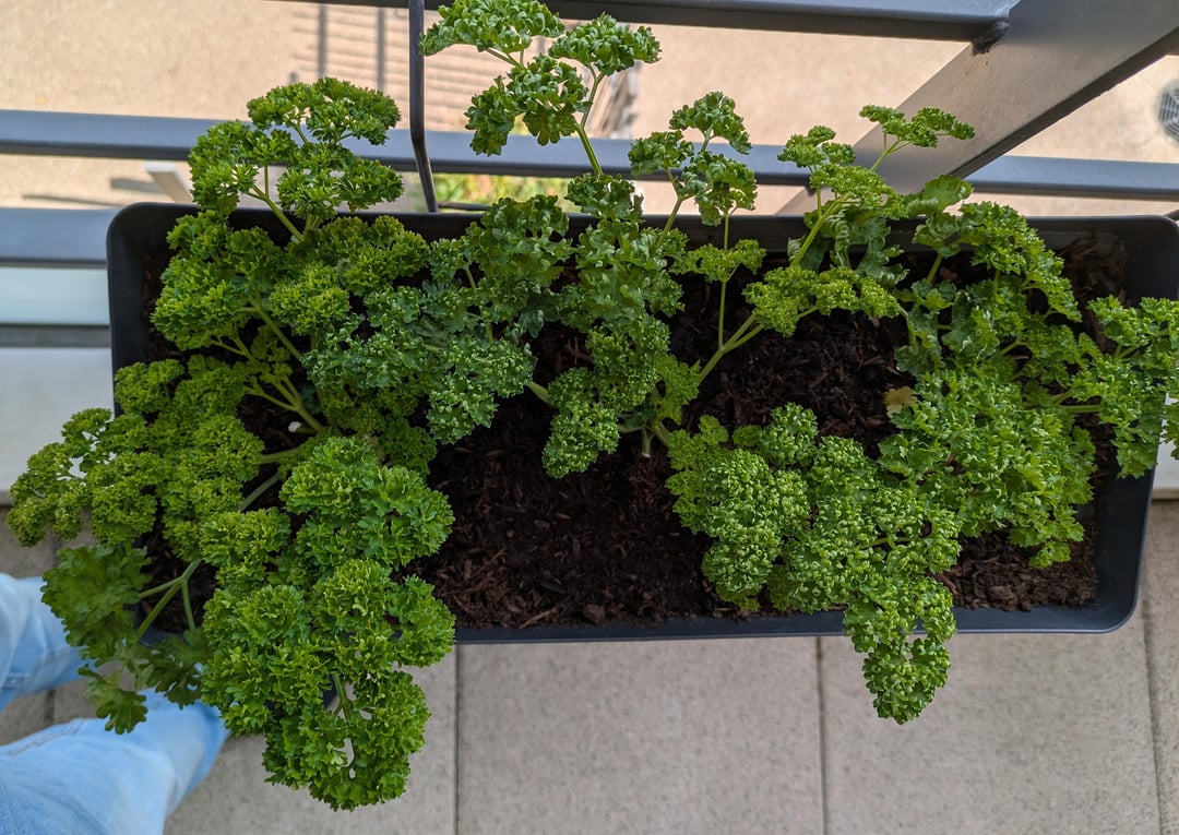 Was denkst du über meine lockige Petersilie? Er ist südländisch mit einem monatlichen Balkon über dem, was er tut, was er von 10 bis 17 Uhr in der Sonne ist. Ich würde sagen.