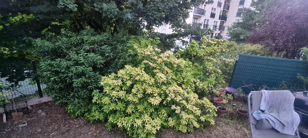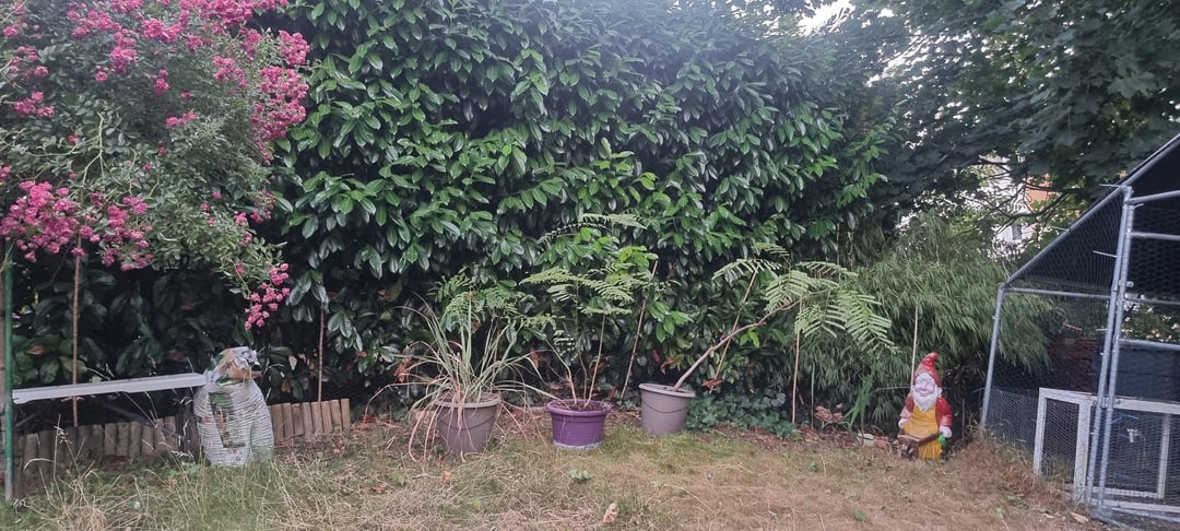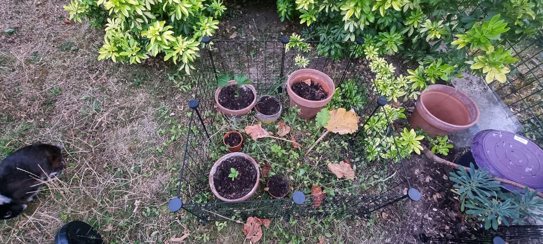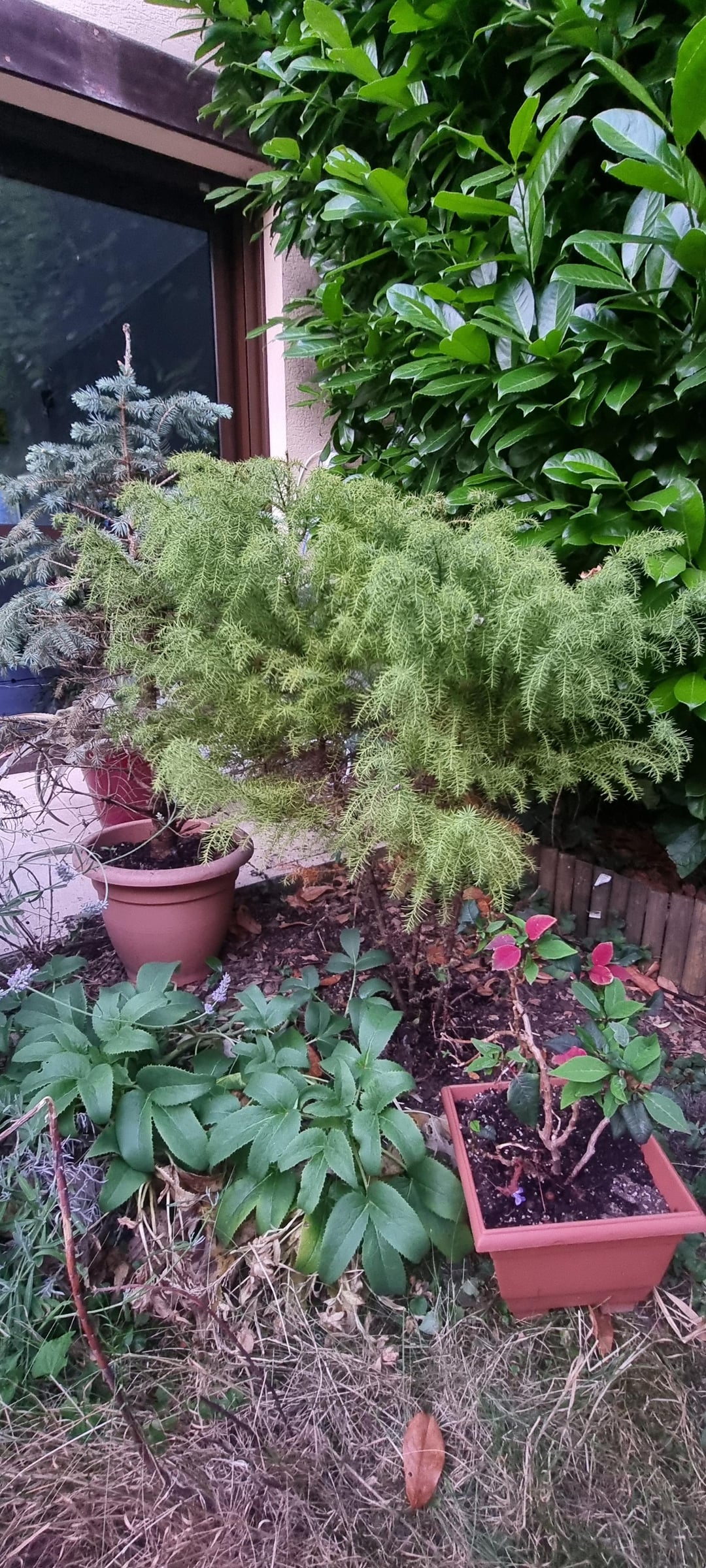 Wir fügten eine Zedern aus Japan hinzu (der arme Mann wurde von dem Täter angegriffen, der auf einigen Fotos vorhanden ist), der Baum ist in einem Topf, aber er ist über 5 Jahre alt, er zieht das Gesicht, macht aber regelmäßig Triebe. Die Bäume in den lila Häfen sind extravagant, deren Guadeloupe -Samen zurückgebracht hatten. Sie haben jeweils 10 und ungefähr 3 Jahre alt, und wir haben eine Zitronengras aus Madagaskar.