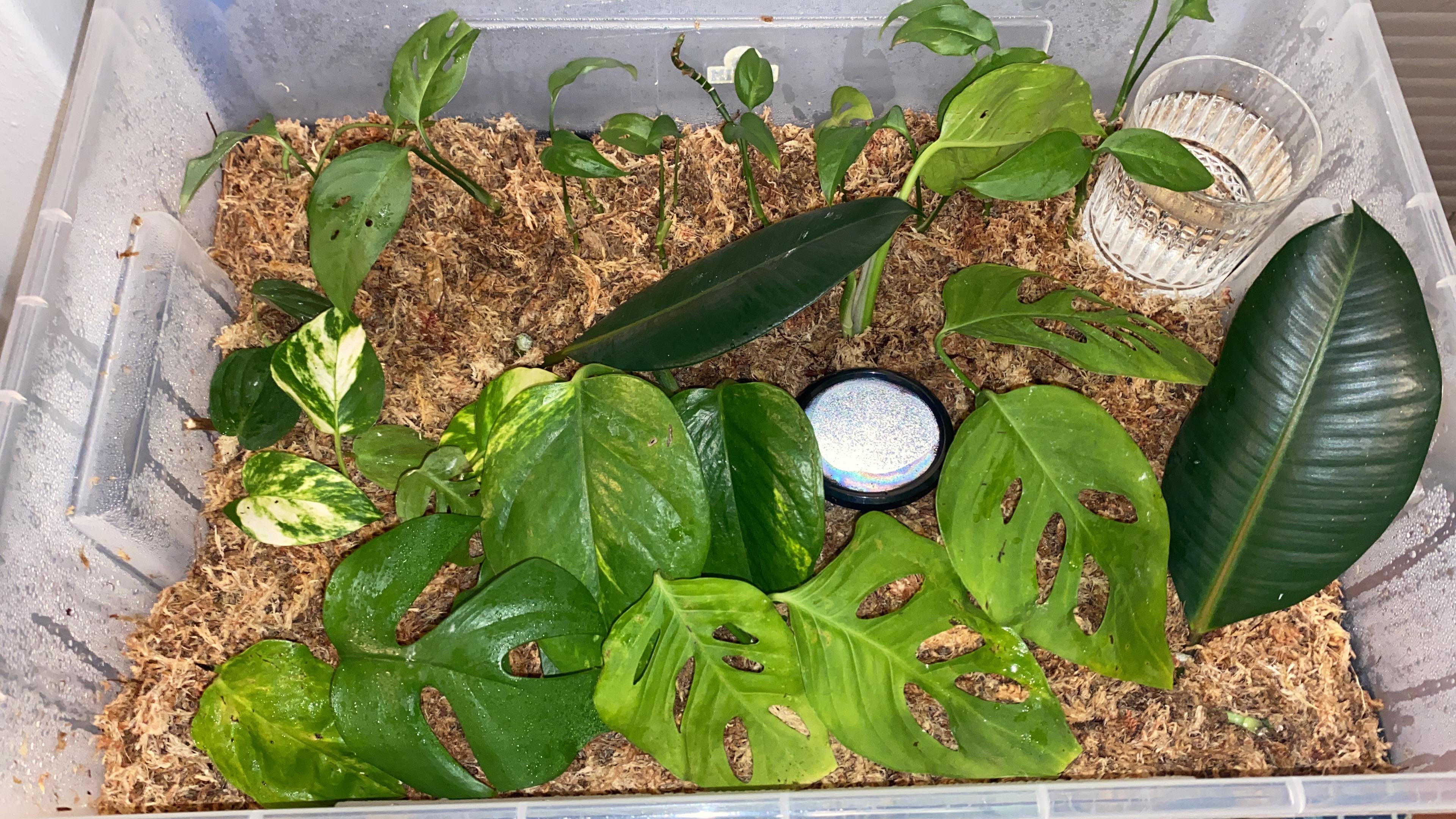 Ich weiß, dass all dies in Wasser propagiert werden könnte, aber es war in letzter Zeit sehr kalt und bleibt etwa unter 18 Grad, so dass nichts Wurzeln ist. Ich bemerkte, dass einige meiner Requisiten anfingen, rosa und schwarze Flecken zu verrotten und zu bilden, also beschloss ich, eine Ausbreitungsbox mit einem Heizkissen darunter und einem isolierten „Stiefel“ zu machen, damit die Schachtel sitzen kann, um zu versuchen, die Hitze zu verteilen. Ich habe die Schachtel, um bei etwa 20 bis 24 Grad Celsius und bei etwa 80%zu bleiben. Ich möchte wissen, ob ich das richtig gemacht habe, ich habe eine Perlitschicht unten und dann eine Schicht Orchideenrinde und dann das Sphagnum -Moos. Ich habe hier zuletzt gepostet und um Hilfe bei Form gefragt, aber es war ein Problem mit meinem Substrat. Sie haben das Moos falsch beschriftet, aber ich habe das behoben, dass das durchnässte und dann herausgedrückt wurde, bis ich nicht mehr Feuchtigkeit herausholen konnte und es in indirektem Licht ist. Ich bemerkte, dass einige der zuvor kranken Adensonii -Propagationen in der oberen Reihe der Box weiter gelb sind. Ich hoffte, dass diese Schachtel sie ein bisschen aufbauen würde. Und ich mache mir auch Sorgen, dass die Schachtel zu nass ist. Ich habe es seit gestern nicht mehr geschafft und es gibt immer noch große Tröpfchen auf dem Deckel, obwohl etwa 14 Löcher in die Schachtel gebohrt wurden. 6 auf dem Deckel und dann 2 auf jeder Seite der Box in der Nähe des Oberteils. Irgendwelche Tipps oder Ratschläge?
