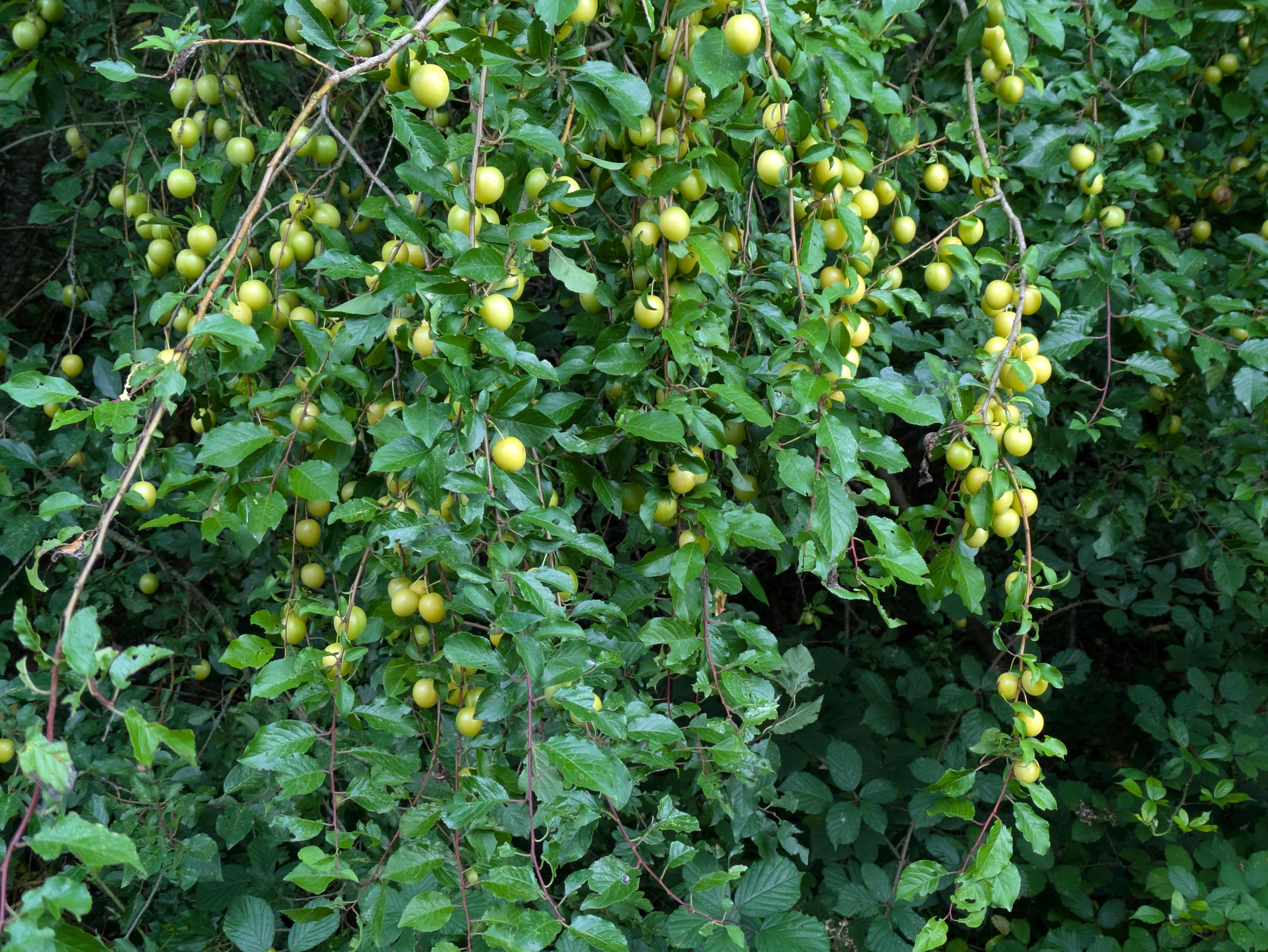 Prunes sauvages. Normallement elles vont jaunir et ensuite tourner vers le rouge (plus vers le bordeau/rouge), désolé, je suis nul avec les couleurs.