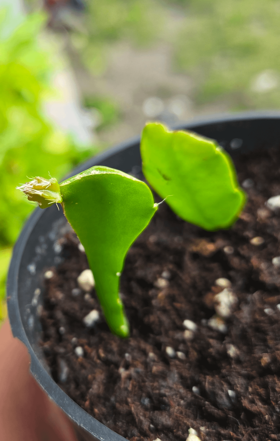Dies ist ein Orchideen -Kaktus -Fragment (Epiphyllum Beavertail), das ich verwurzelt habe. Ich war aufgeregt, das neue Wachstum zu sehen, aber es scheint mir ein bisschen seltsam. Sollen sie nicht flache Blätter haben? Warum wächst es diesen runden kleinen Zweig? Fangen sie alle so an, bevor sie flach werden?