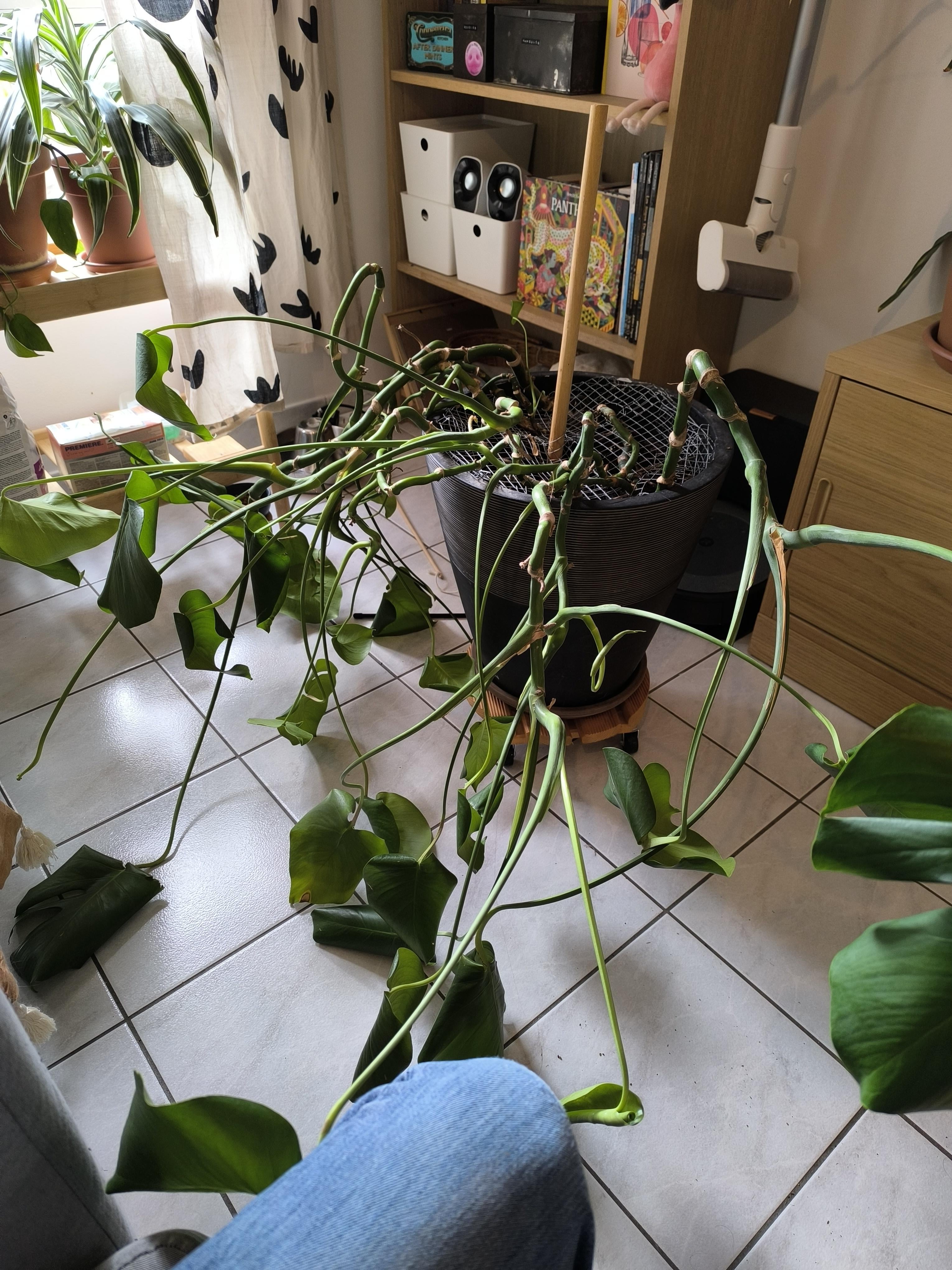 Ich habe seit mehreren Jahren eine Monstera in einem großen Topf und habe mich nie mit ihrem Arrangement befasst, so dass sie in einen Kracher gestoßen ist.