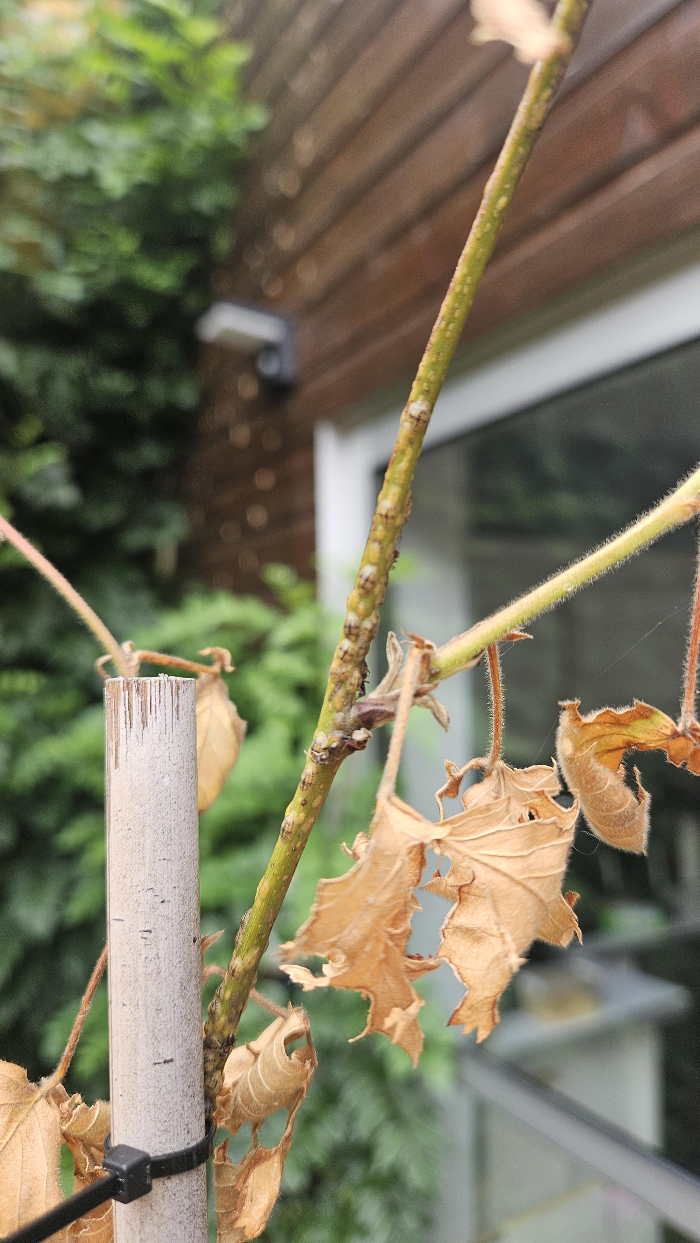 Ich kam heute Morgen aus dem Urlaub zurück und fand meinen Maulbeerbaum ausgetrocknet (es war heiß, ich kann verstehen), aber ich bemerkte auch, dass eine der Stängel ein wenig seltsame Beulen und einige Ameisen hatte. Was ist das? Was soll ich tun?