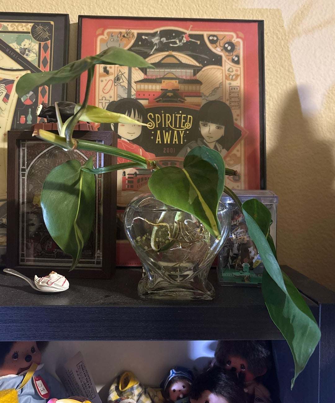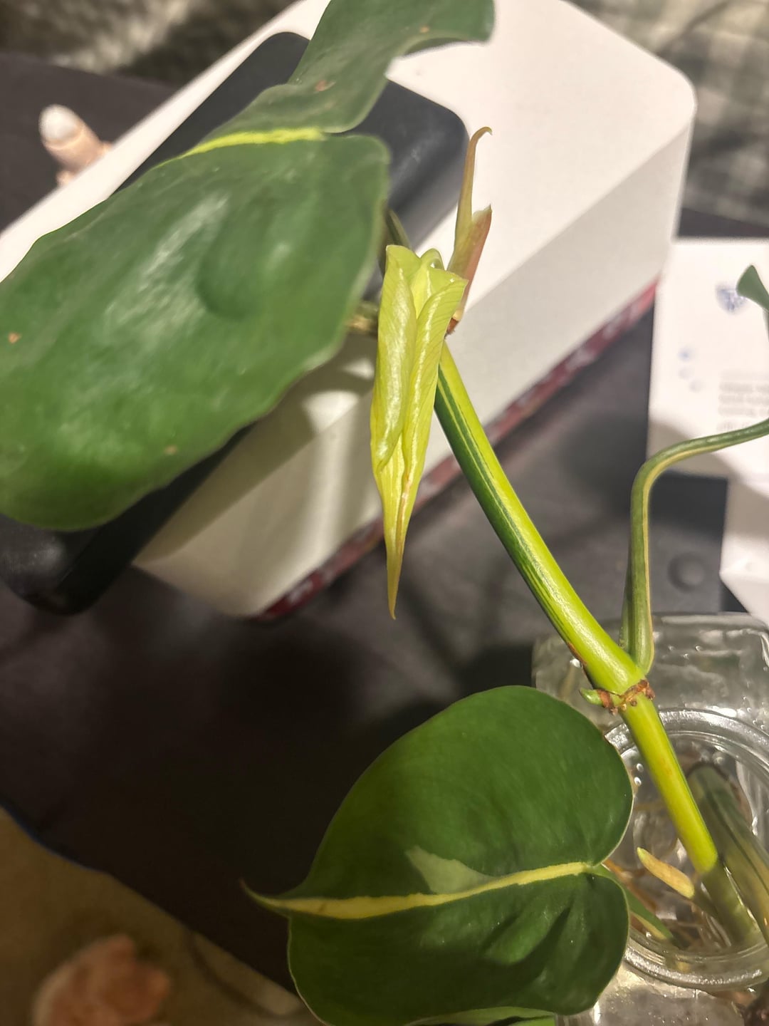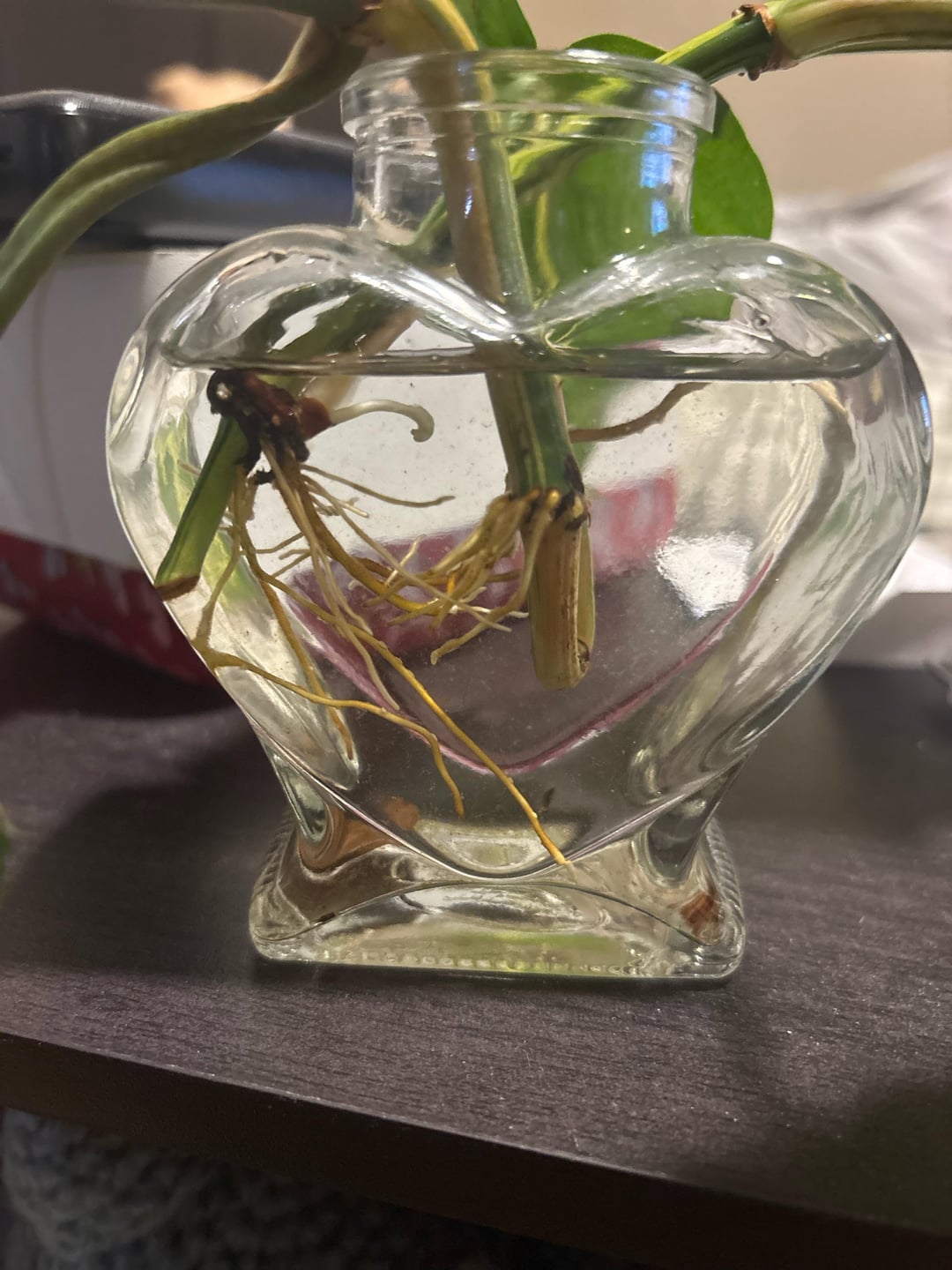 Ich habe diesen schönen Philodendron abgeholt, der den HD -Boden abschneidet, als er den Boden für meine Pothos kaufte, und es ist ungefähr 3 Wochen her! Schauen Sie sich das neue Blatt und die Wurzeln an, die seitdem gewachsen sind! (Der Penny -Hack funktioniert, hat kein Wasser abgeladen, das nur noch abgeholt wird.)