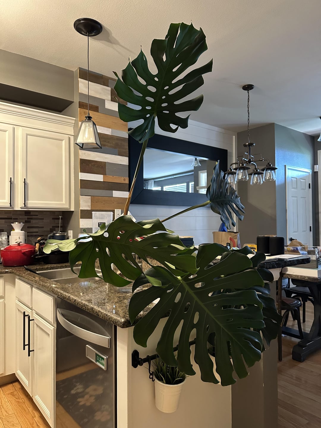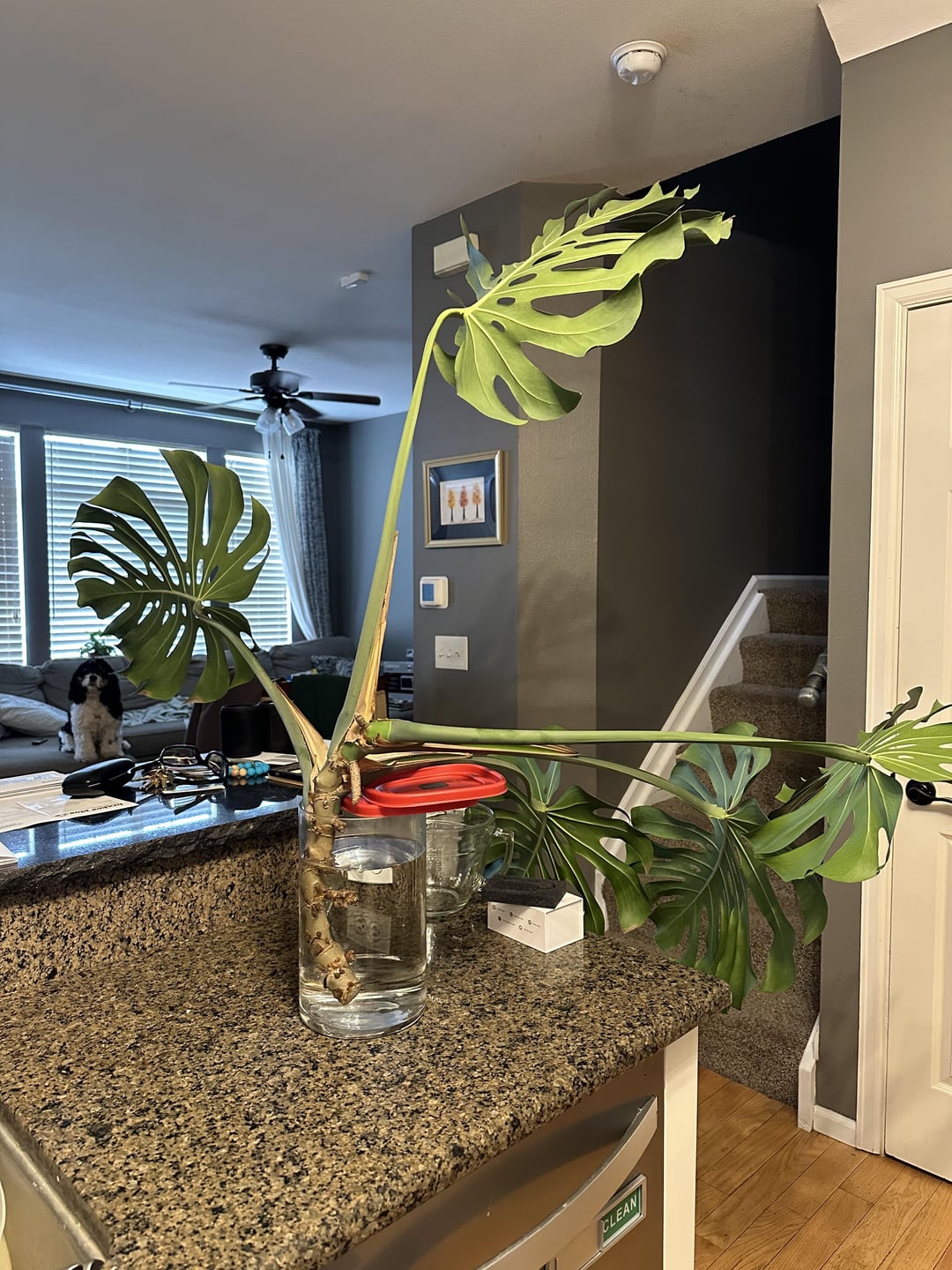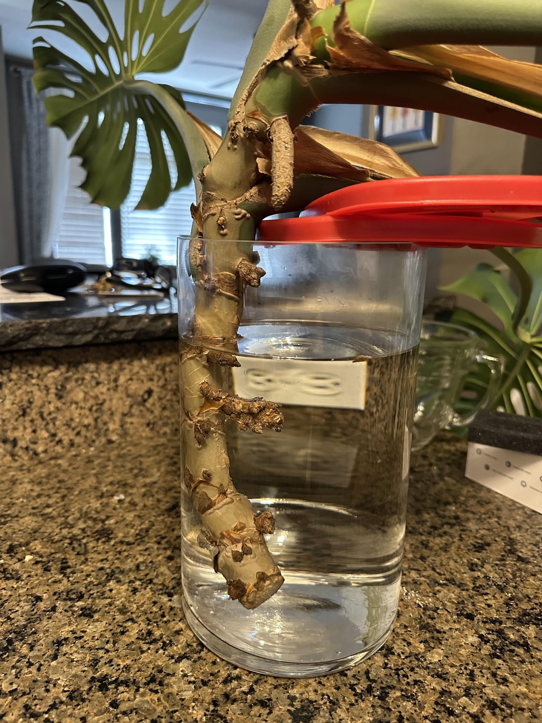 Ich habe diesen Schnitt heute völlig unerwartet bekommen, als ich mit dem Mechaniker scherzte, dass ich eines Tages seine riesige Monstera stehlen würde. Er hat diesen riesigen Stamm abgeschaltet und mir nur 😱 gegeben. Ich habe es im Wasser, aber es ist sehr „vorausschauend“, und derzeit das einzige, was es davon abhält, die gesamte Vase zu wenden, sind die Tupperware-Deckel, die ein paar Blätter unterstützen. Würdest du den Stamm kürzer schneiden oder ihn wie es sind? Morgen werde ich es besser machen, aber für heute Abend halten die Tupperware -Deckel es zusammen