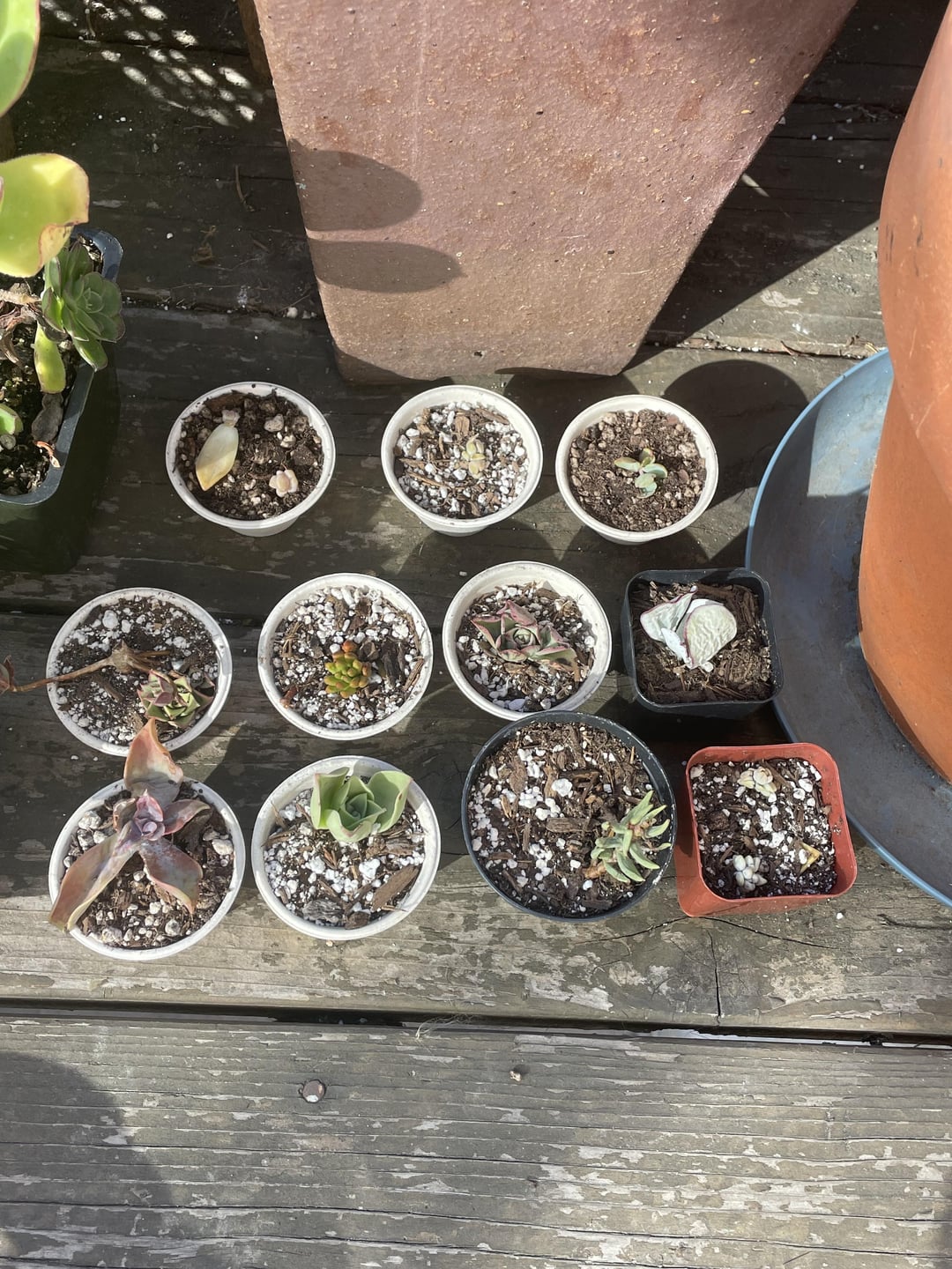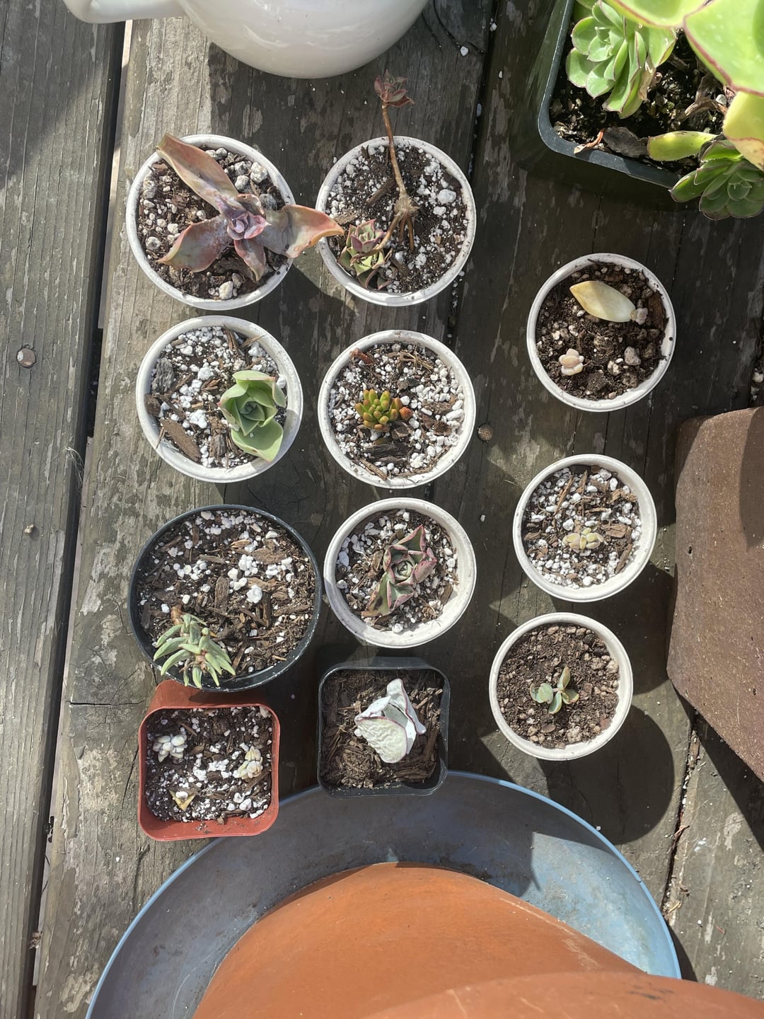 some of these look burned and in need of a good watering. have they been acclimated to the sun at all? for the leaf props and newer small plants i would put them under filtered sunlight until they get a little more mature