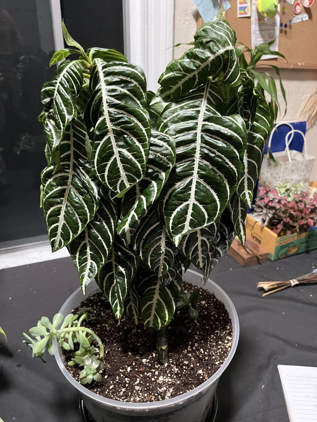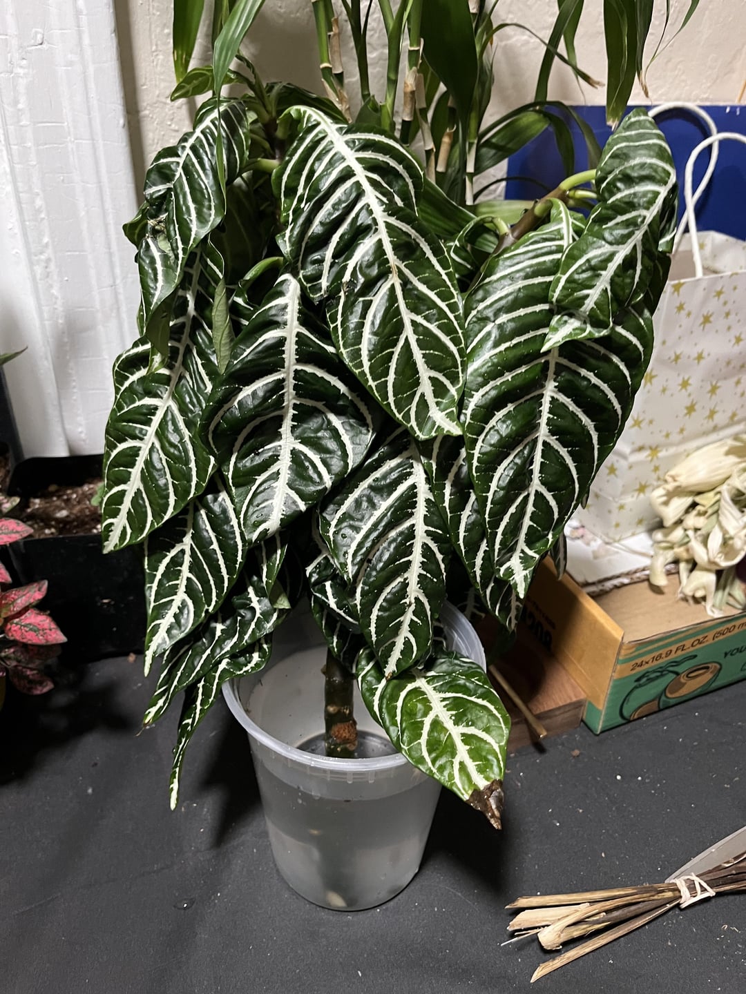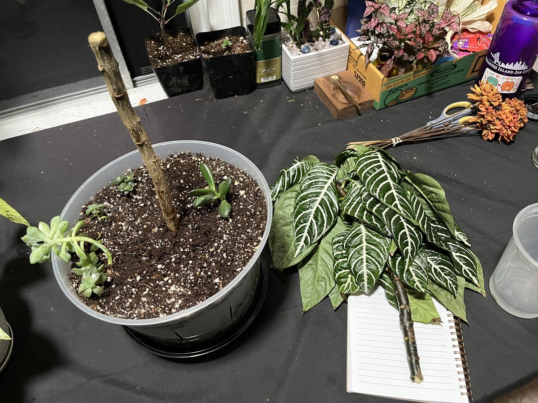 Meine Zebrapflanze hat seit ein paar Monaten erstklassige Kämpfe. Es übertraf seinen Einsatz, so dass ich auf eine Schnurkrawatte zurückgegriffen habe, um sie aufrecht zu halten. Gestern habe ich es auf meinen Tisch gelegt, um den (etwas vernachlässigten) Bewässerungsplan wieder aufzunehmen. Aber mit der Neigung meiner alten Wohnböden und seiner Wolke fiel sie vom Tisch und schnappte sich in zwei Hälften. Nachdem ich es wieder in den Topf bekommen hatte, habe ich die offenen Enden flach geschnitten (aus irgendeinem Grund), also hoffe ich, dass das nichts negativ beeinflusst. Der Stiel hat auch Wasser aus seiner offenen Wunde tropft.