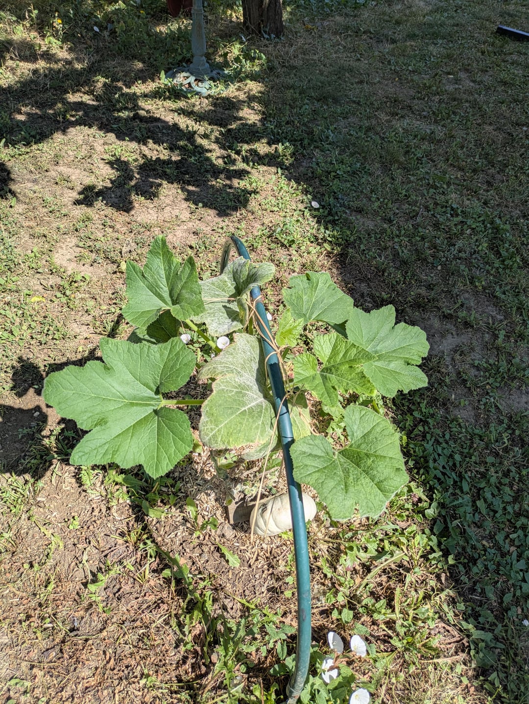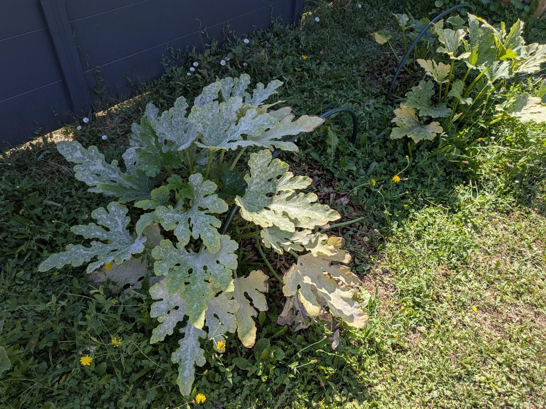 Ich habe den Fehler gemacht, im Regen zu gießen, manchmal mein Pastisson und mein Zucchini, die jetzt alle mit Oidium befallen sind 🙁