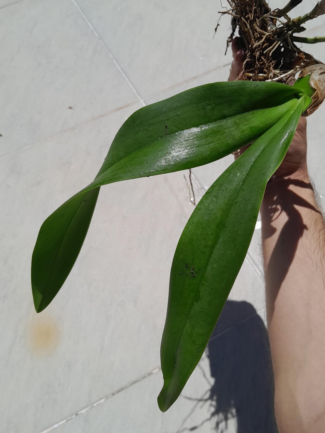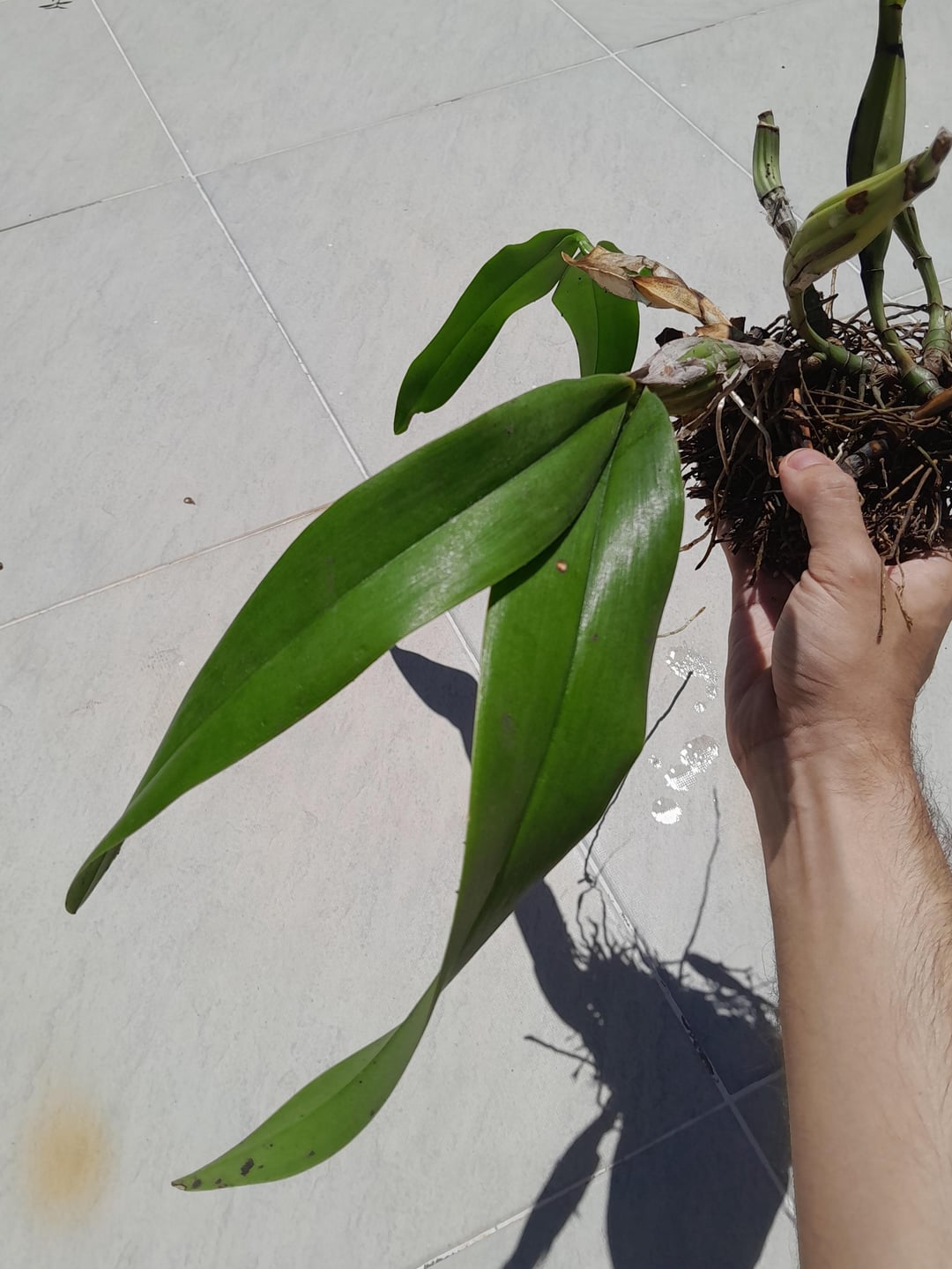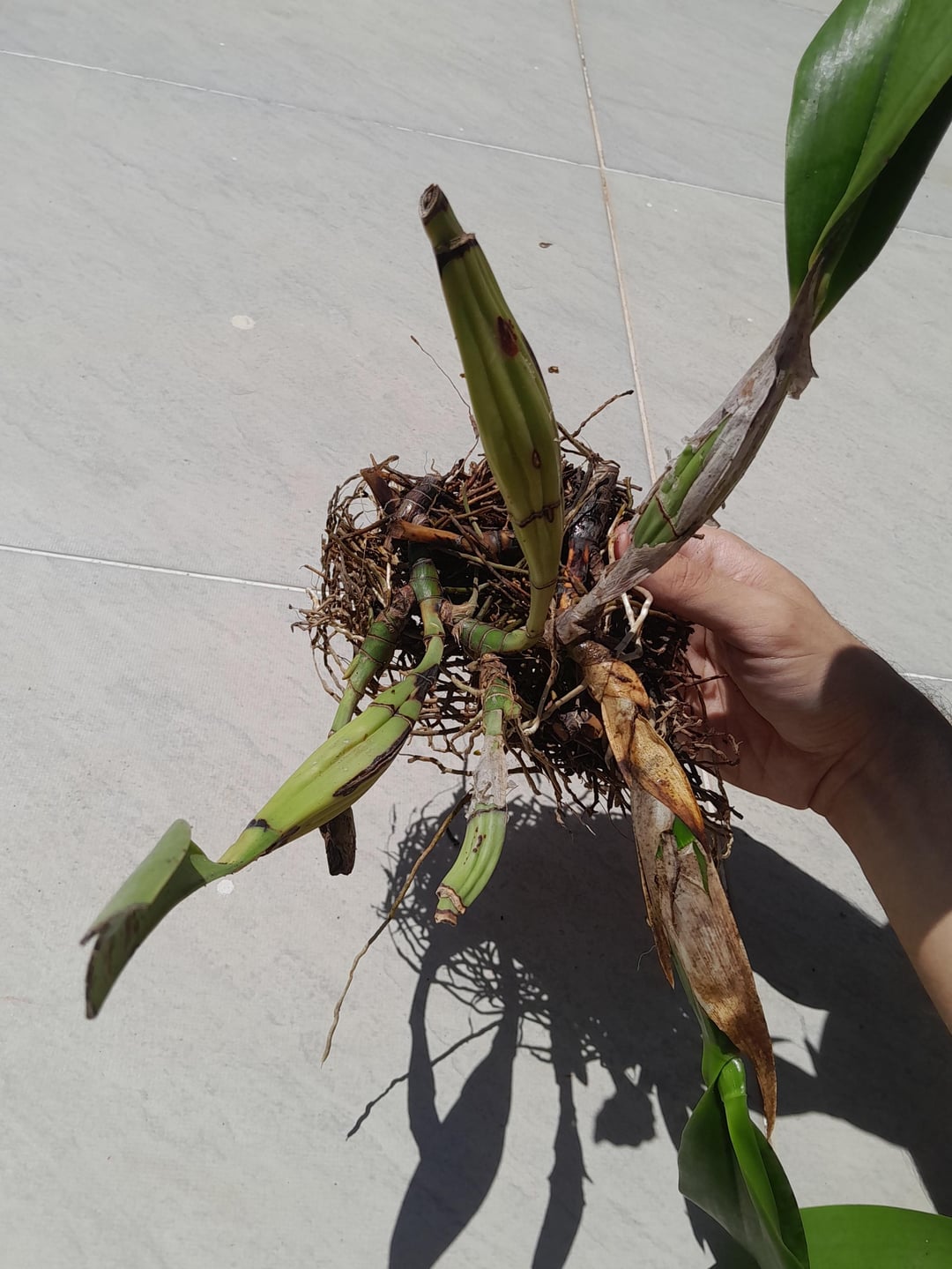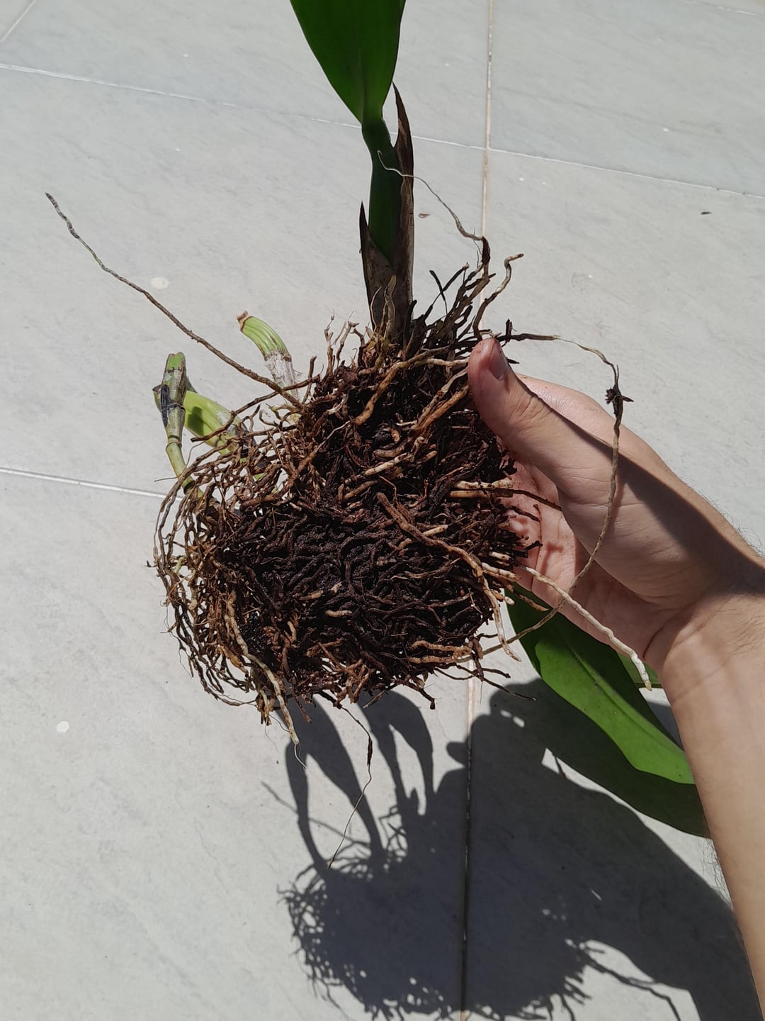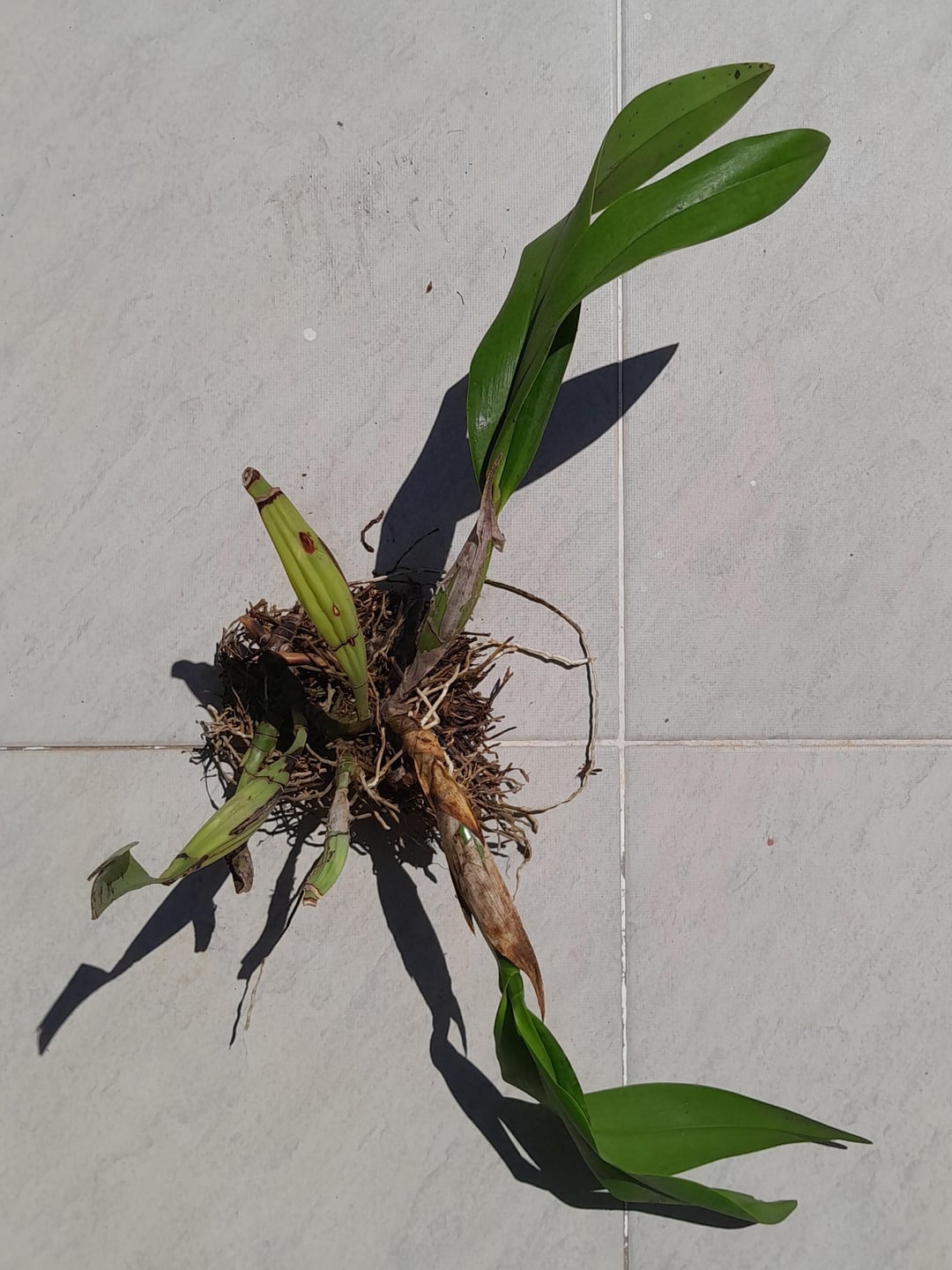 Ich habe diese Orchidee gestern erhalten, die von einem Ort entnommen wurde, der abgerissen wird. Jetzt muss ich es hier zu Hause ein neues Leben einräumen. Bildsuchungen haben nicht geholfen. Google sagte bereits, es sei ein Cattleya, dann ein Dendrobium, dann ein Onkidium …