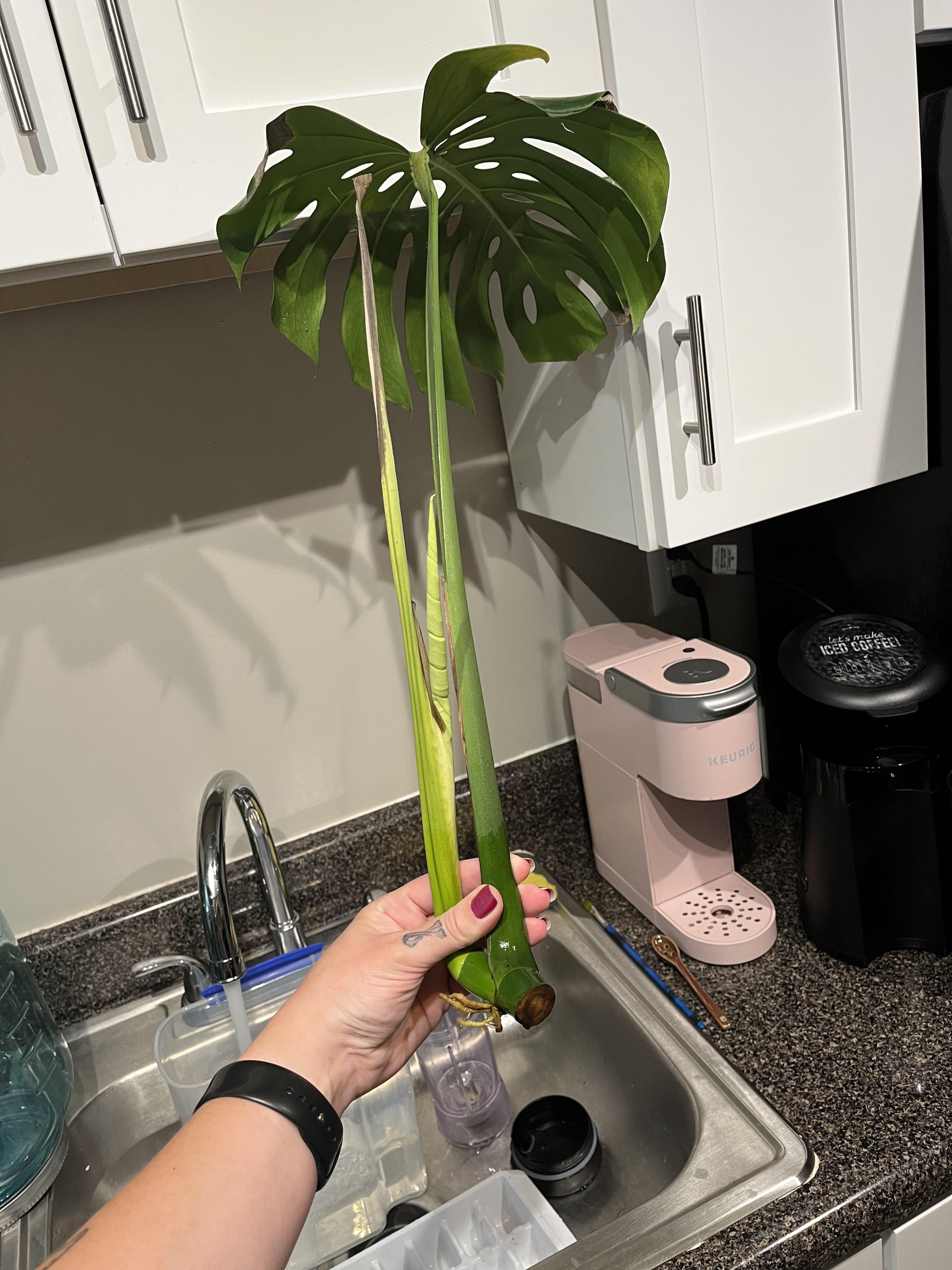 Ich habe diesen Freund seit ungefähr zwei oder drei Monaten verbreitet. Ich merkte am Anfang nicht, dass sie kein Haufen Sonnenlicht brauchen, also wurde einer der Blätter verbrannt und fiel ab. Nun, jetzt von diesem Stiel haben wir ein neues Blatt !! Ich bin so aufgeregt. Ein Teil von mir will sie pflanzen, aber ich glaube nicht, dass sie noch genug Wurzeln hat. Was denkst du?