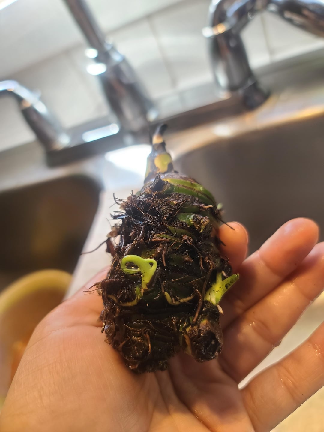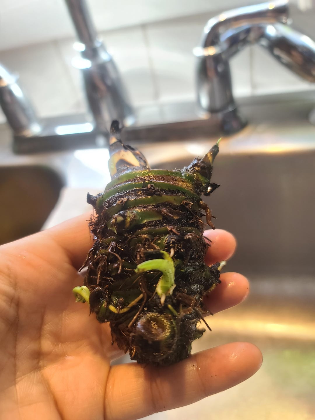 Peace Lily hatte Wurzelfäule, also grub ich sie geschnitten und legte dies in Wasser, weil es so grün war, dass sie denke, dass sie leben wollte. Jetzt hat sie diese Babys und ich bin mir nicht sicher, ob ich in den Boden umziehen oder weiter warten soll. Danke schön!!!