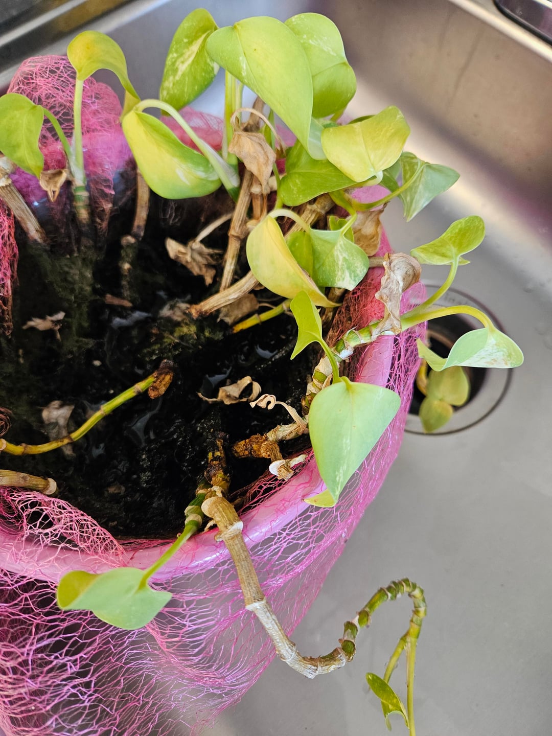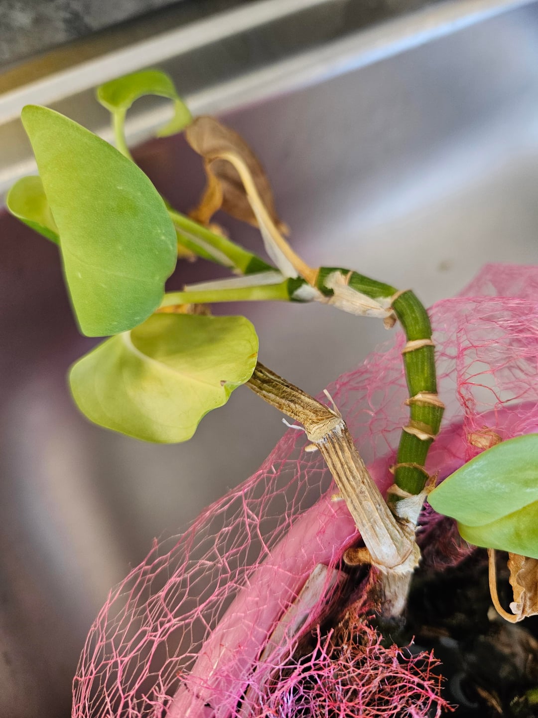 Der Boden stinkt und sieht schrecklich aus, und ich möchte die grünen Stücke wirklich frei schneiden und sie durchführen, indem ich sie motiviere. Kann es von den grünen Knoten ausbreitet? Die Knoten sind dicker als ich es gewohnt bin. Ich gehe davon aus, dass dies eine Art Pothos ist …