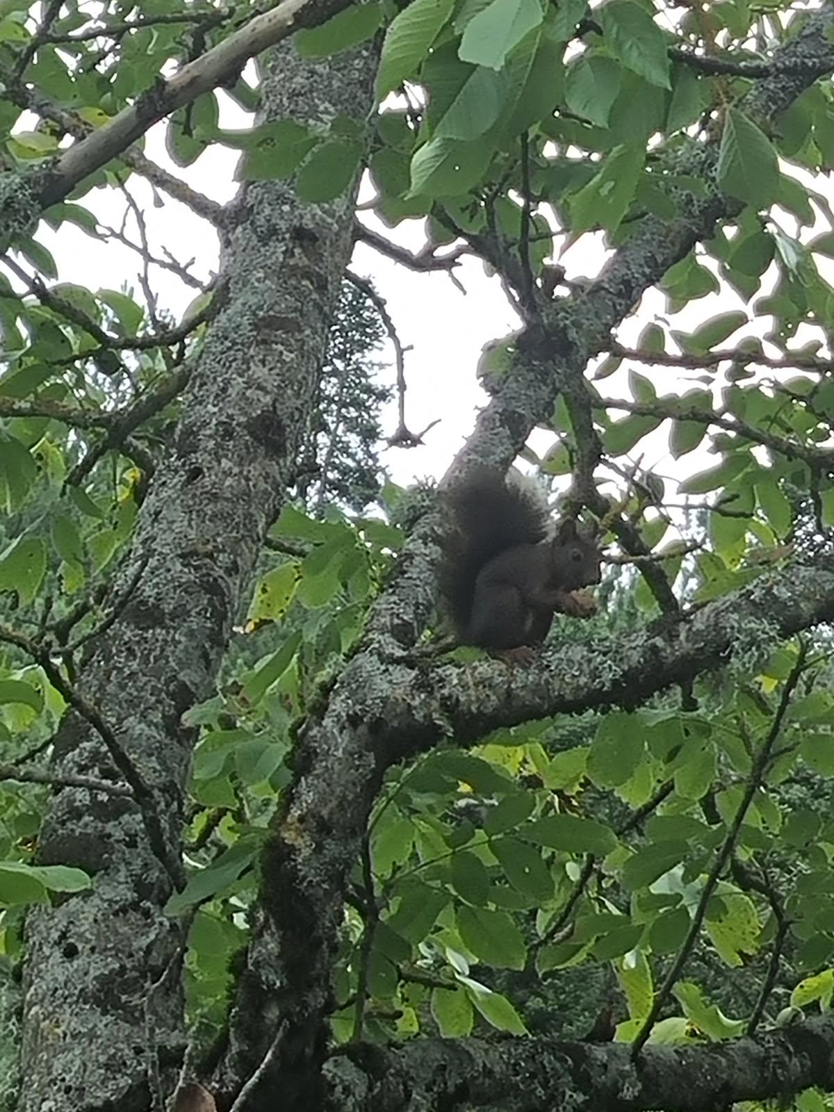 Ich habe es geschafft, ein Foto von diesem charmanten Eichhörnchen zu machen, das im Garten lebt. Sie sind ein Duo, beide schwarz, und ich frage mich plötzlich, ob es sich um rote Eichhörnchen handelt.