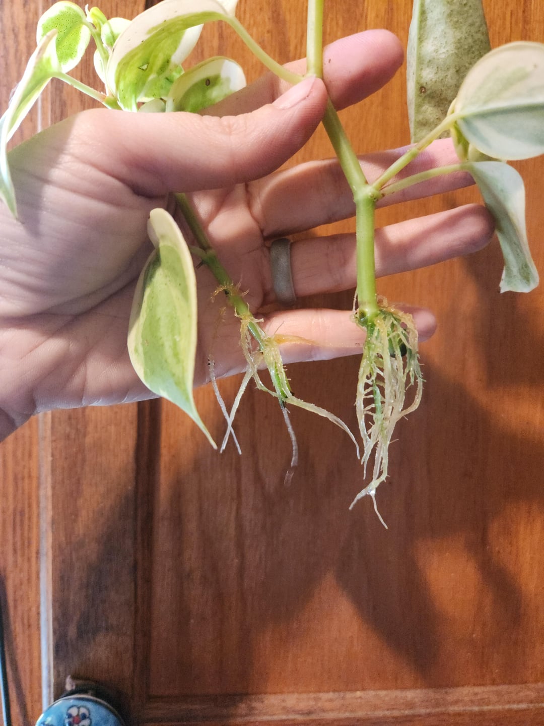 Pothos (entweder n’joy oder Perlen und Jade, es gab dort keine Pothos, also konnte ich nicht sicher sein, woher es kam) das war ein völlig dehydrierter kleiner Strang unter einem Walmart -Tisch, der mit Füßen getreten aussah. Ich hatte nicht viel Hoffnung, aber ich habe es in zwei Hälften geschnitten und es in Wasser gesteckt und es hat mir neue Blätter gegeben !!! Es wird jetzt heute aufgetopft!