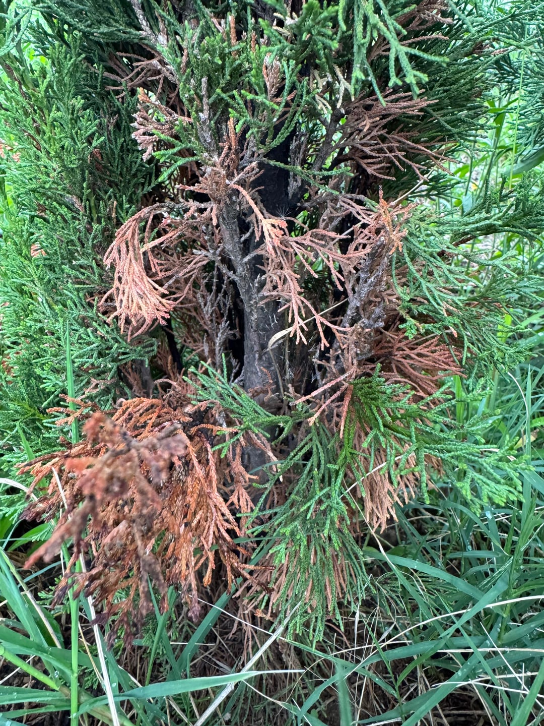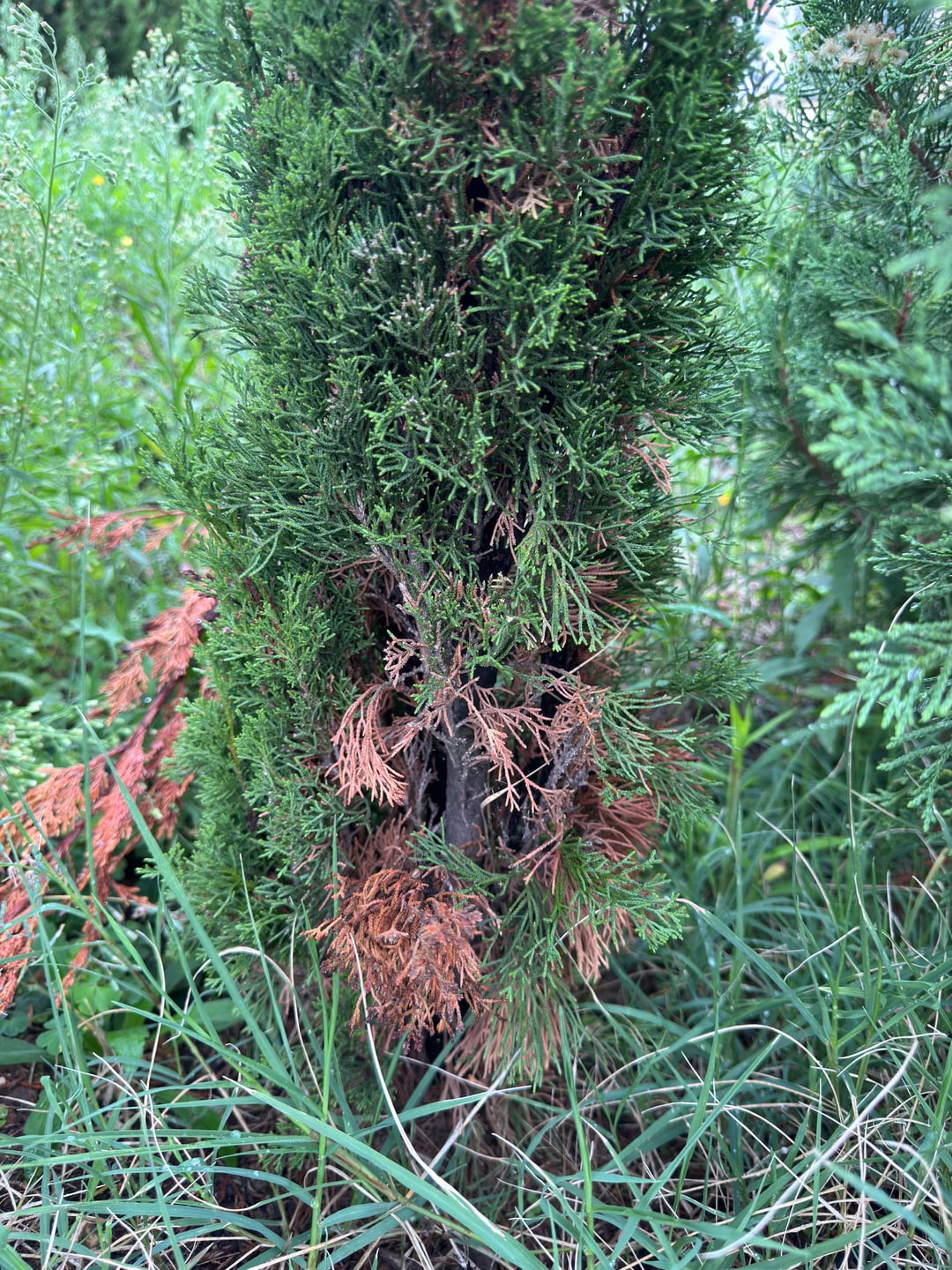 Ich bin besorgt über meine Thuyas -Hecke. Zwei Bäume sind schon tot und ich musste sie wegreißen. Der, den Sie auf den Fotos sehen, wurde im letzten Frühjahr gepflanzt und beginnt bereits scharf innen und an der Basis zu bräunen.