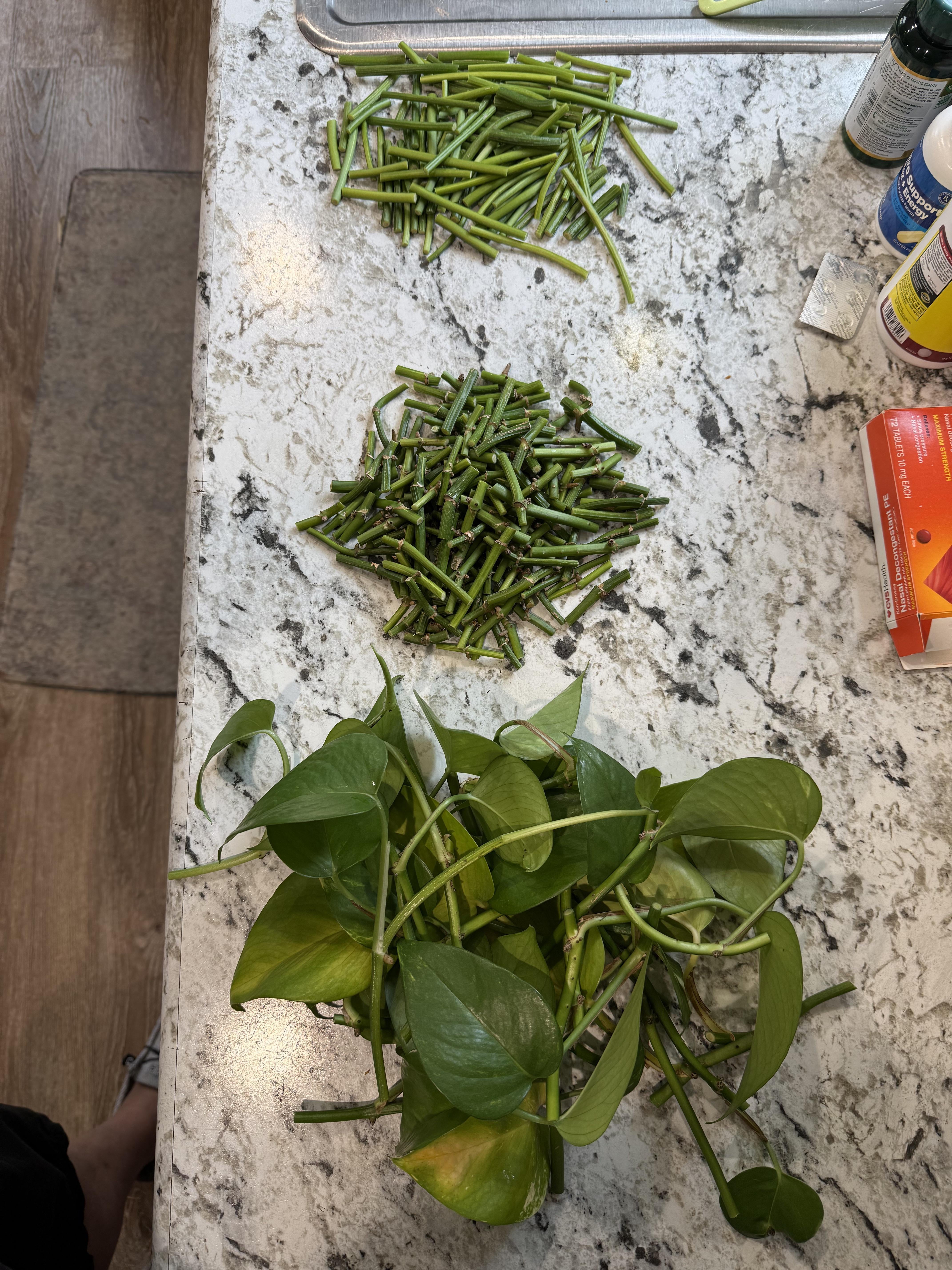 Hat neulich einen Pothos vor einem Nachlassverkauf gespart. 3 Stapel, Obermüll, nur mittlere Knoten, untere Einzelblatt mit einem Knoten. Aus dem Bild sind einige Enden mit mehreren Blättern.