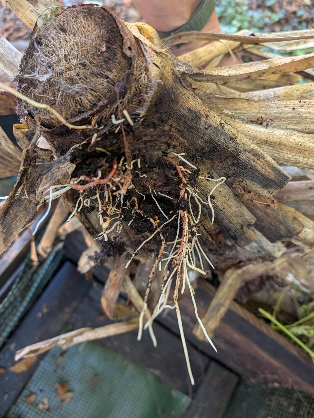 Ich hatte ein Yukka, das Genre, das draußen wächst, aber es war krank, weil zu viel im Schatten. In diesem Frühjahr habe ich es verdaut und mit Teilen des Kofferraums Steckdosen gemacht, die gut dauerten. Der Rest der Pflanze steckte ich sie in eine Ecke aus dem Boden, damit die Blätter ungefähr zwei Monate trocknen. Im Juli warf ich den getrockneten Yukka auf meinen kleinen Komposter, um außer Sichtweite zu sein. Was war meine Überraschung heute, als ich all diese Wurzeln sah, die seitdem gewachsen waren. Also sauerte ich den Koffer