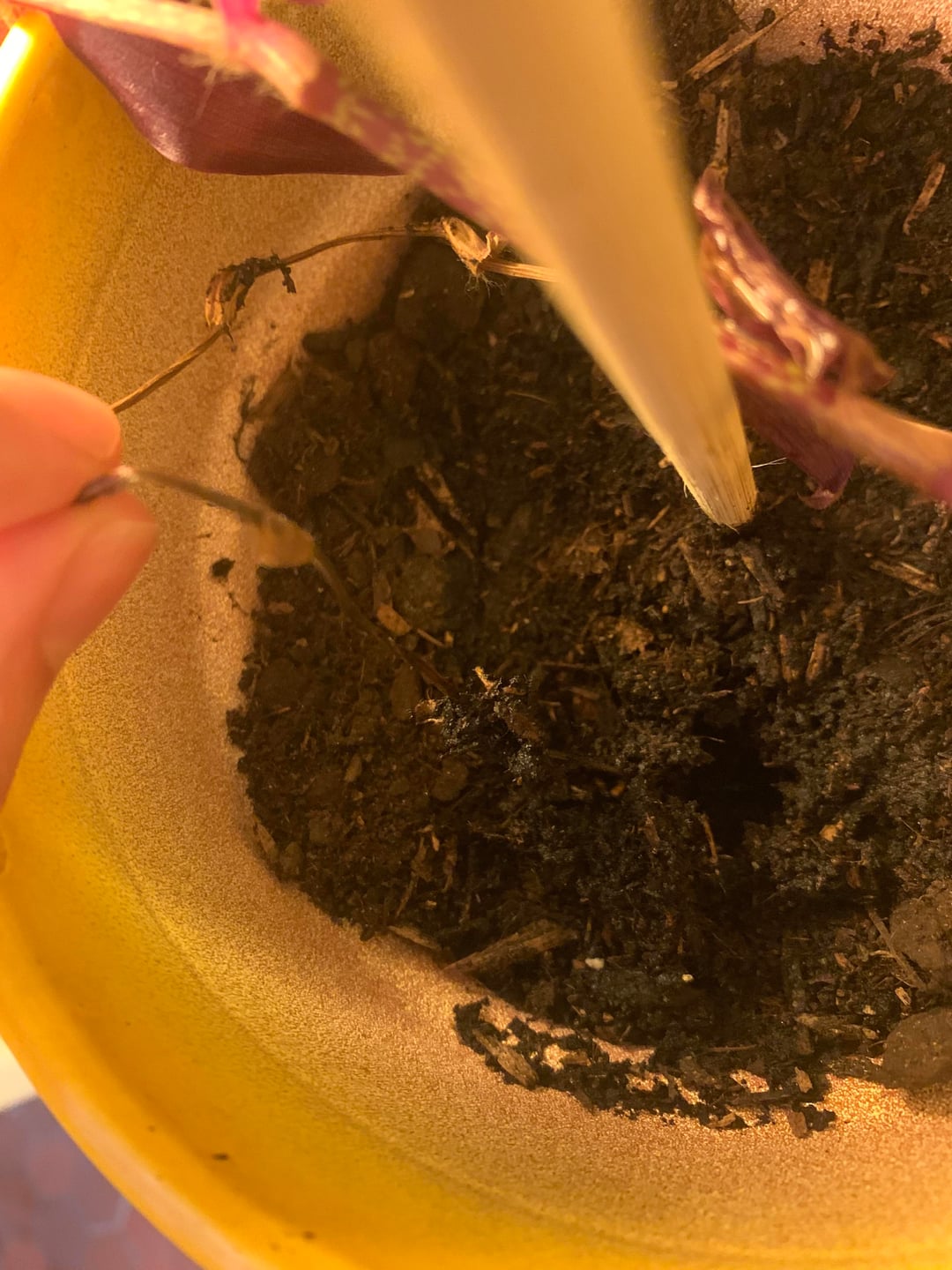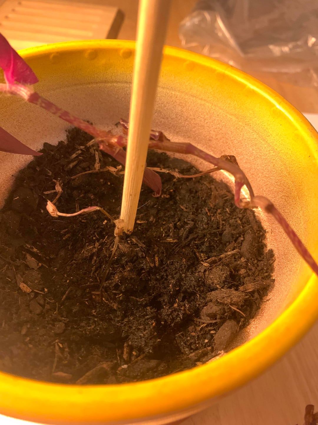 Auch wenn die Blätter hübsch sind, bleibe ich weiterhin fieberhaft, wenn die Stange sie verbindet. In der Tat sind die Zweige ziemlich dick, aber nach ihrer Trennung. Der Hauptstamm/der Hauptwurzel, der in die Erde geht, scheint sehr dünn und ehrlich gesagt nicht sehr versunken in der Erde. Ich legte das Baguette, um zu verhindern, dass die zu dicken Äste auf ihrer Basis zu schwer wiegen.