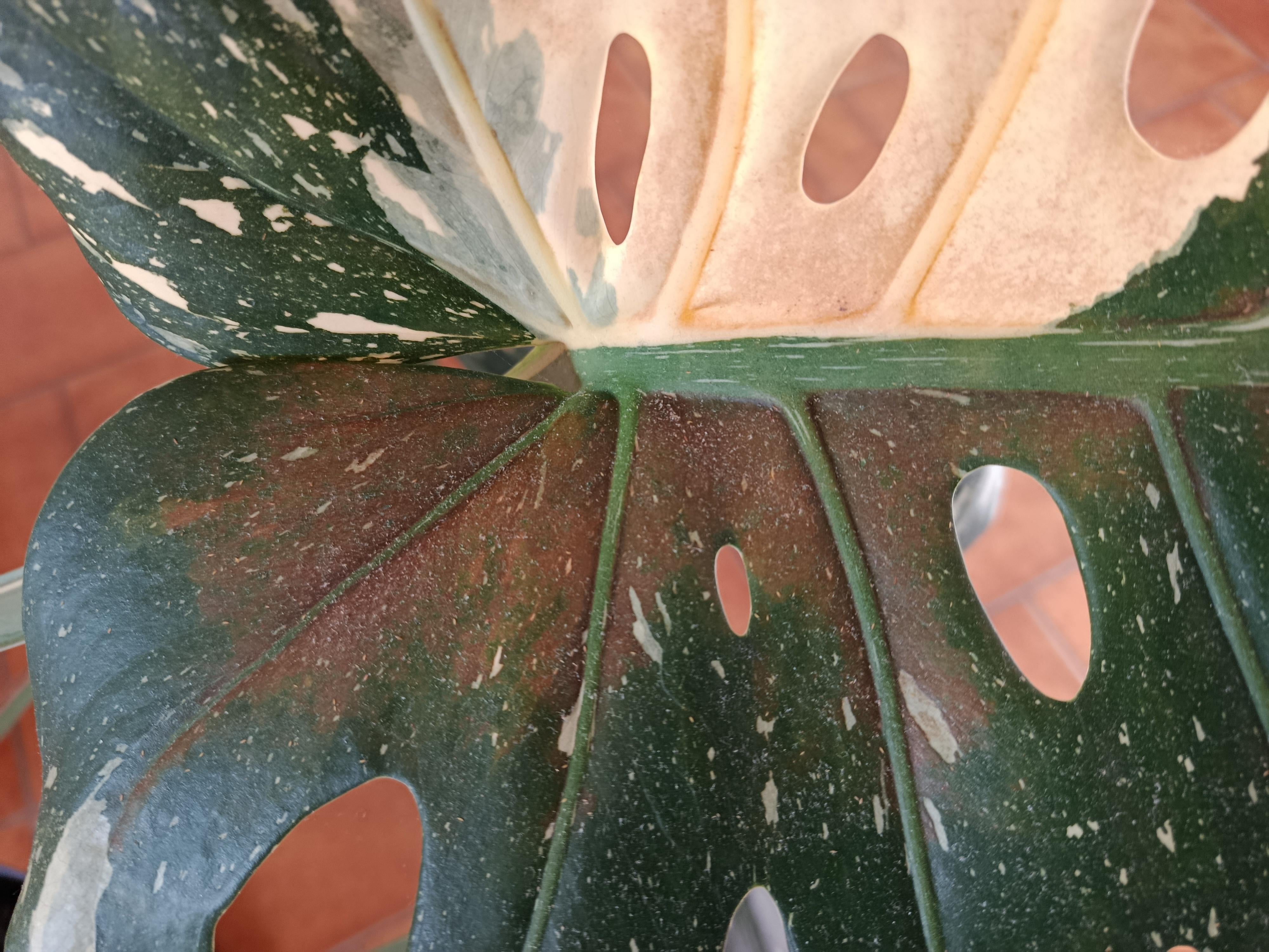 Seit einigen Monaten hat meine Monstera seine weißen Teile, die braun werden, insbesondere in der Mitte des Blattes wie auf dem Foto orange. Ich gieße es jedoch genug (ohne es zu ertrinken) und gebe ihm von Zeit zu Zeit einen Qualitätsdünger (ohne Überdosis). Die Blätter werden nacheinander so und ich verstehe nicht warum.