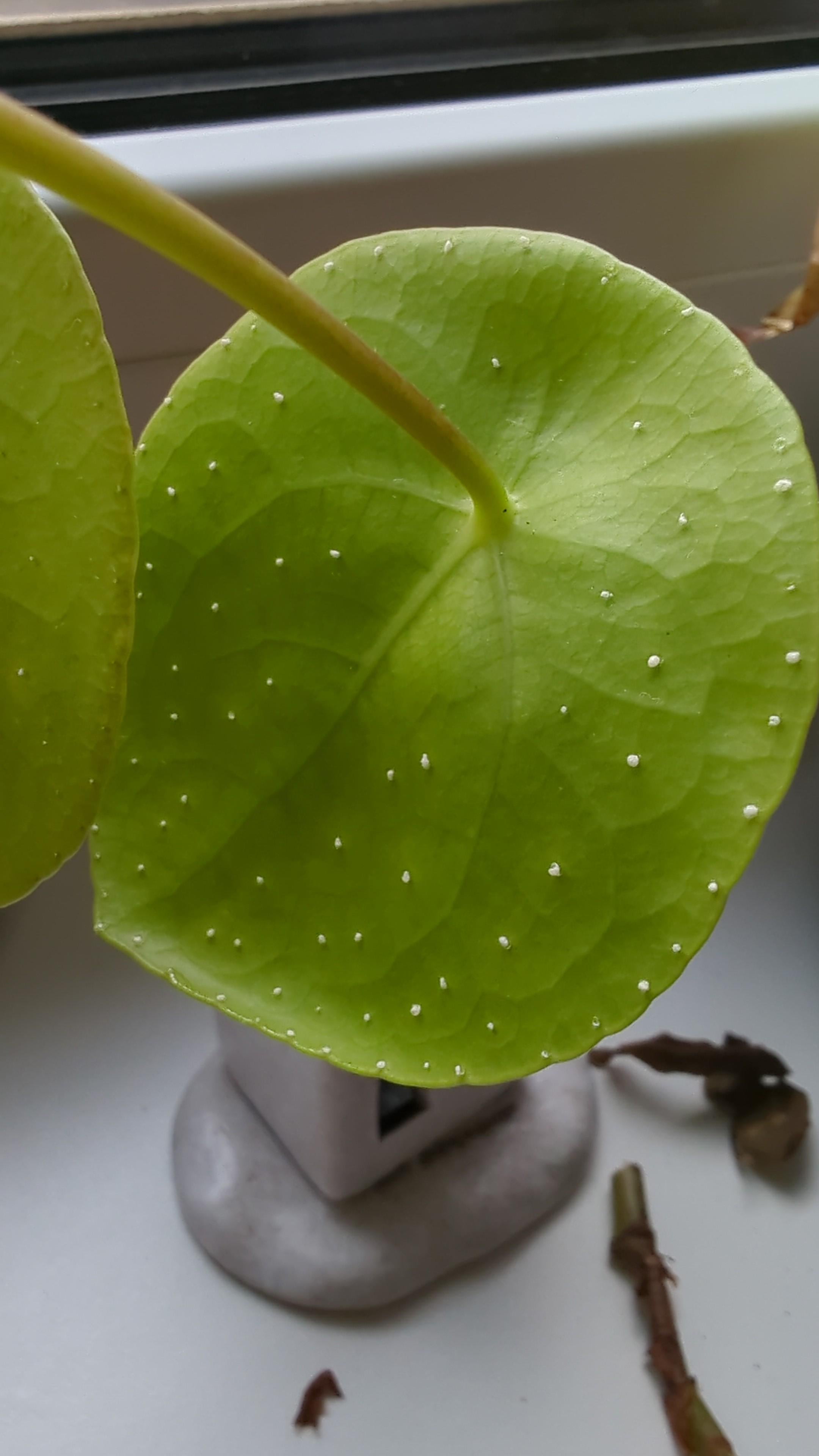 müssten Mineralien von verdunstetem Wasser sein. Pileas scheiden überschüssige Flüssigkeit aus Poren in den Blättern aus und die Mineralien aus dem Wasser bleiben zurück.