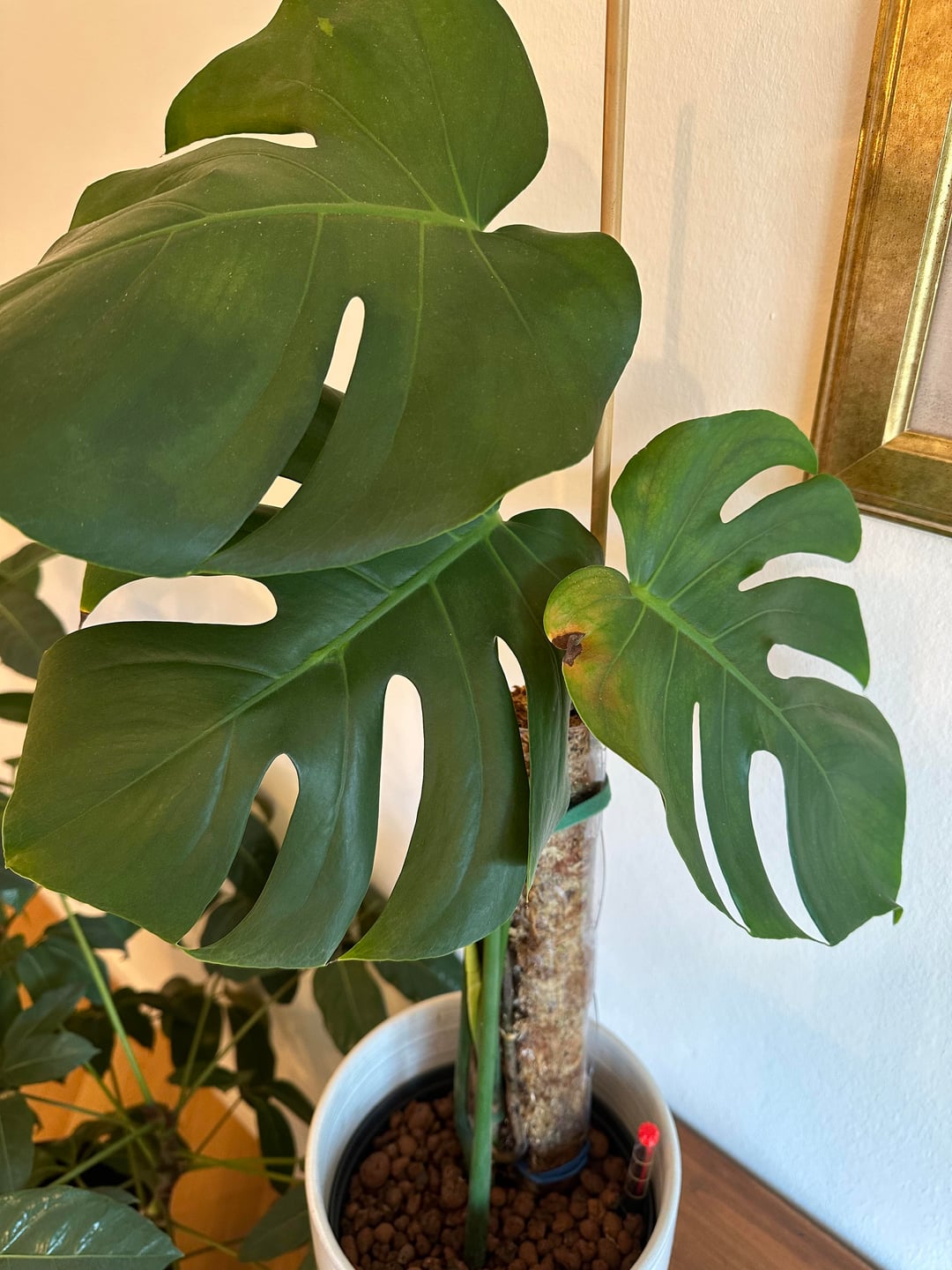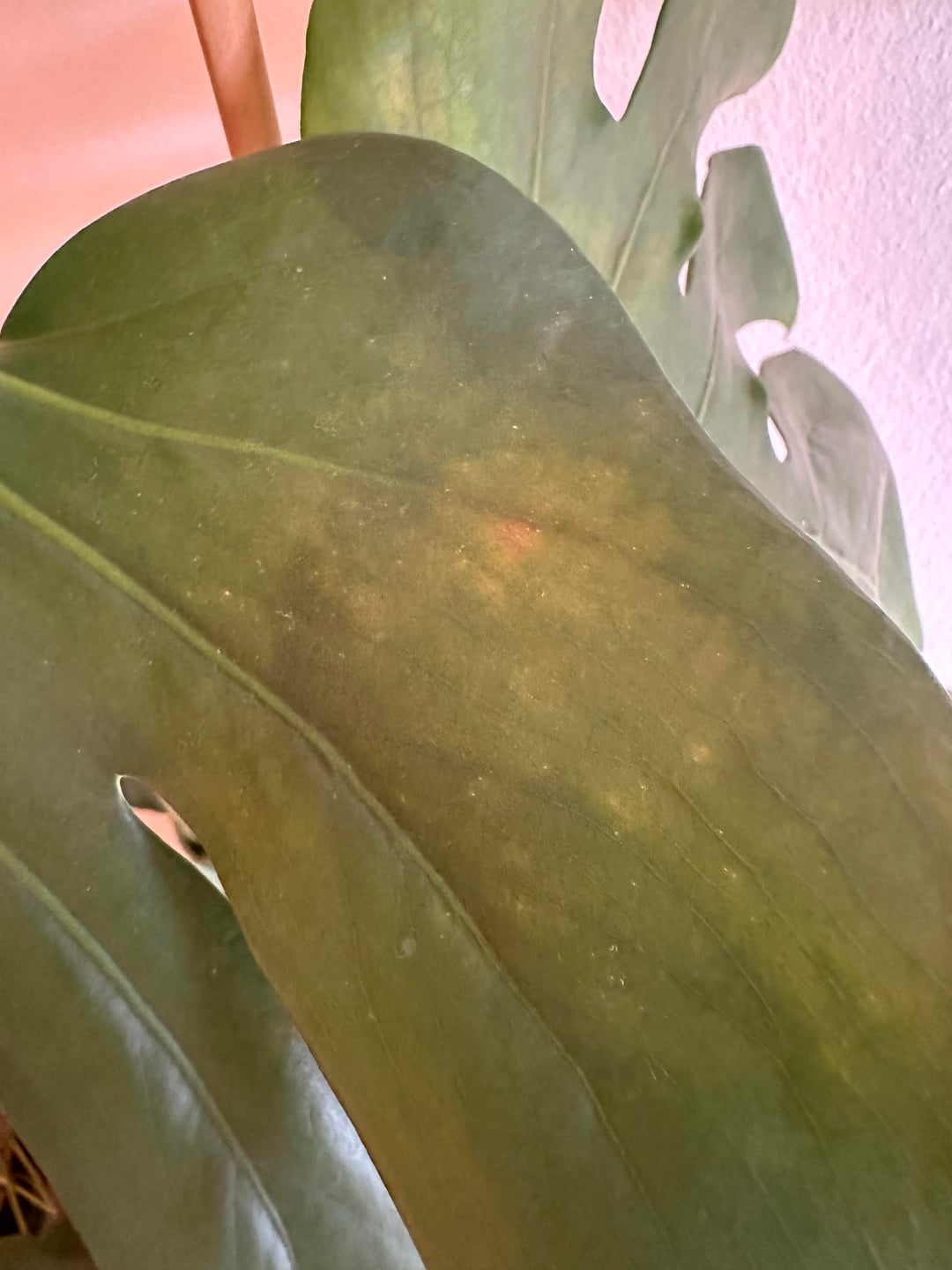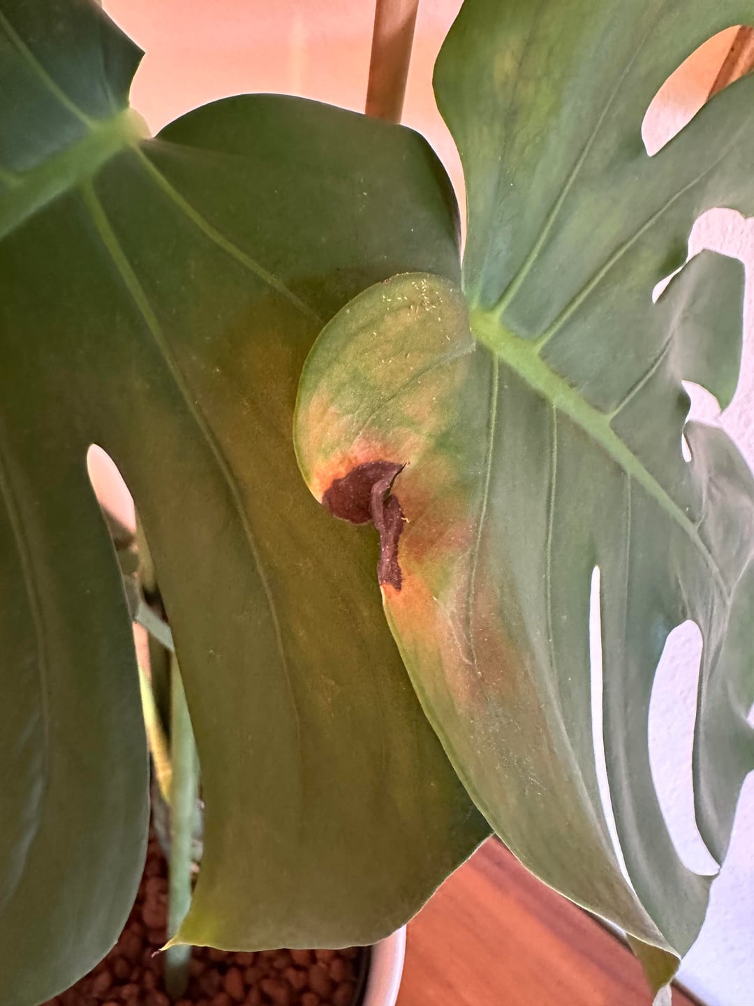 Meine Monstera (ehemaliger Ableger, steht in Hydokultur) hat seit geraumer Zeit diese Verfärbung am Blatt, bzw. an einem weiteren Blatt – welches die befallene Stelle berührt – weitere leichte Blattverfärbungen.