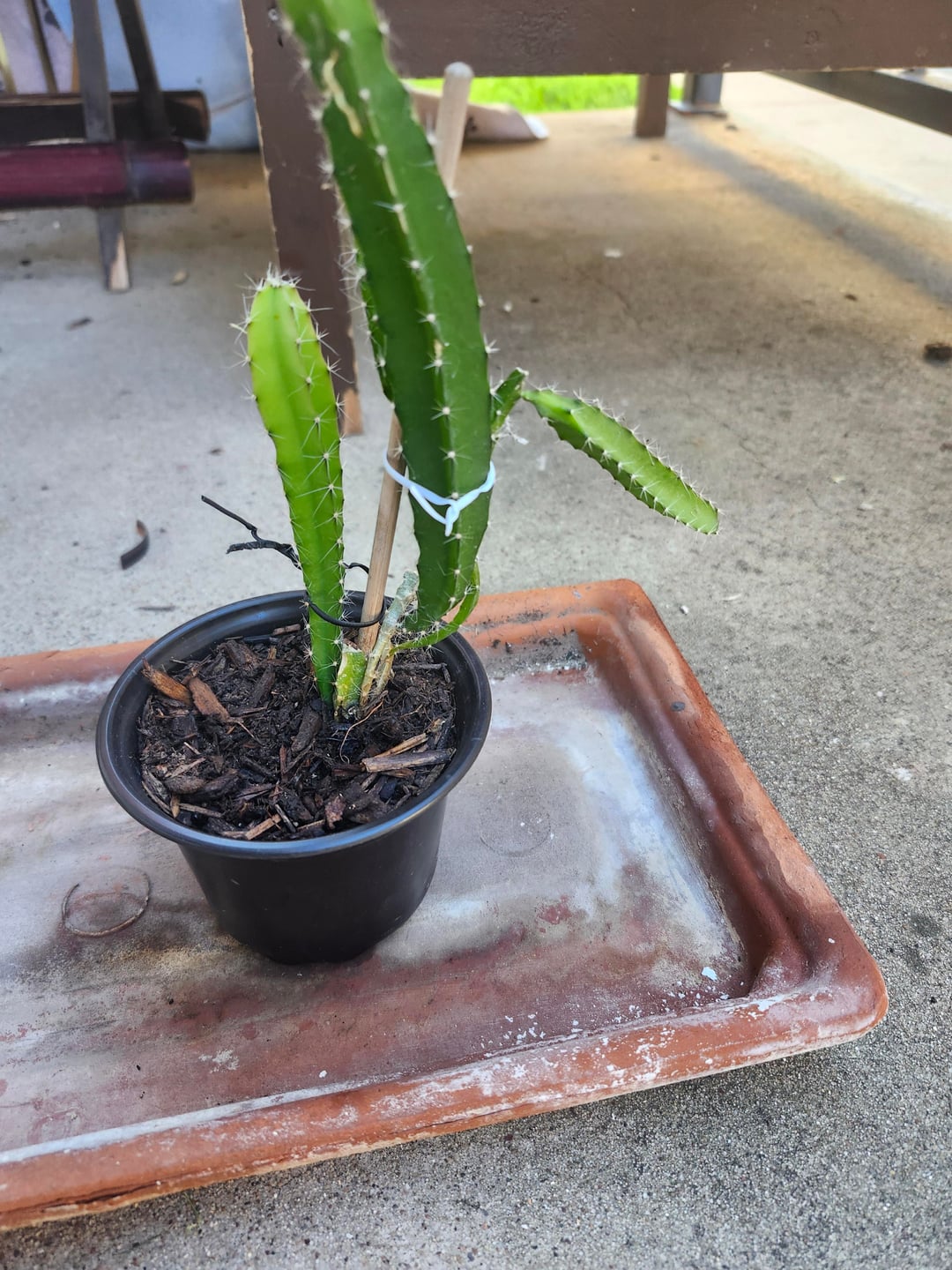 Ich habe mir letzte Woche diesen Drachenfruchtkaktus gekauft und bei genauerem Hinsehen denke ich, dass er sich in drei oder vier Pflanzen vermehren lässt. Mir wurde gesagt, dass dieser Steckling ein Jahr alt sei, aber ich denke, er sollte größer sein.
