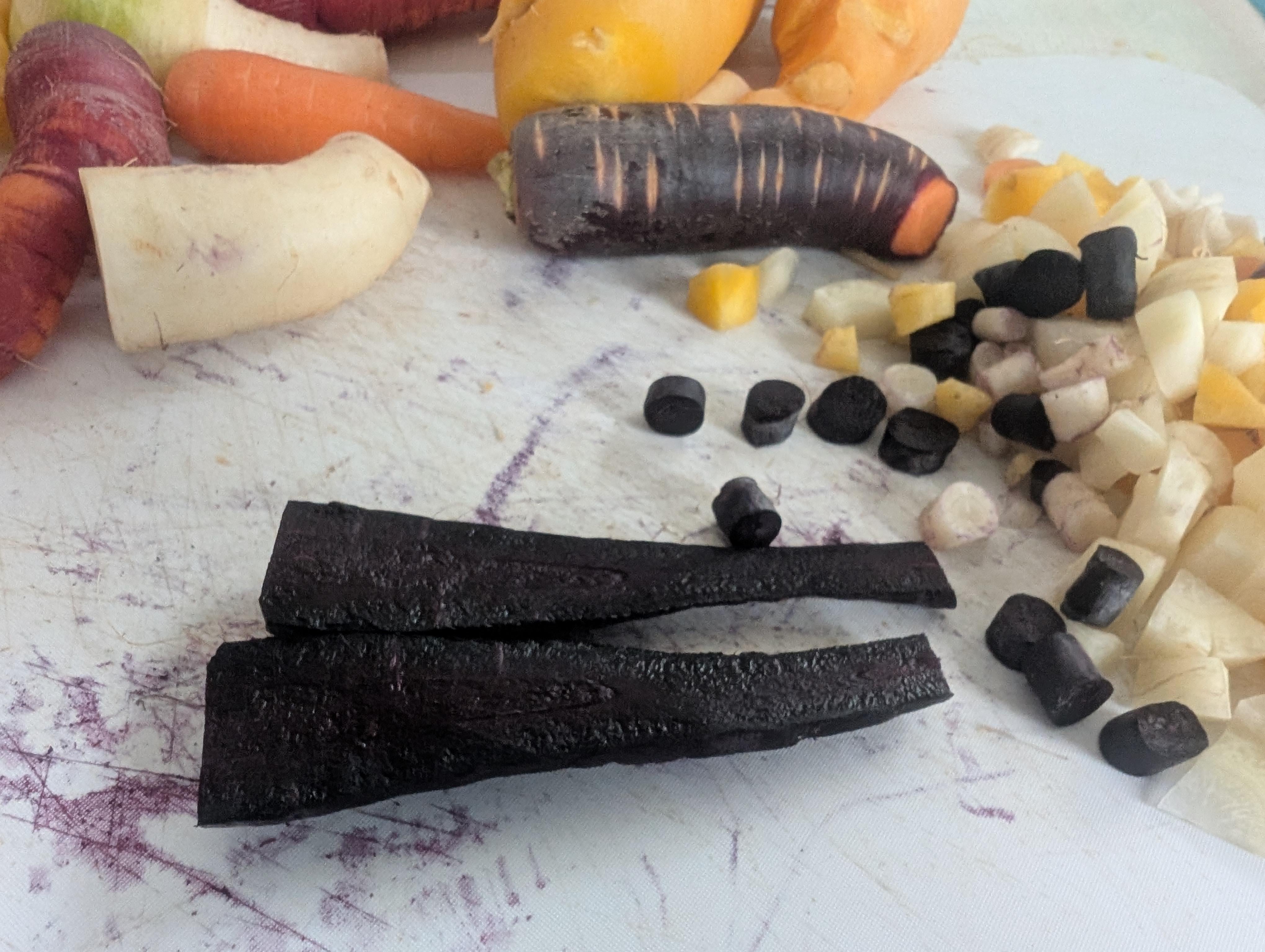 Wir bauen unser Gemüse an und es ist das erste Mal seit sechs Jahren, dass ich eine komplett violette Karotte sehe. Normalerweise sind sie außen violett und innen orange (wie die große Rückseite). Von: Izdunord