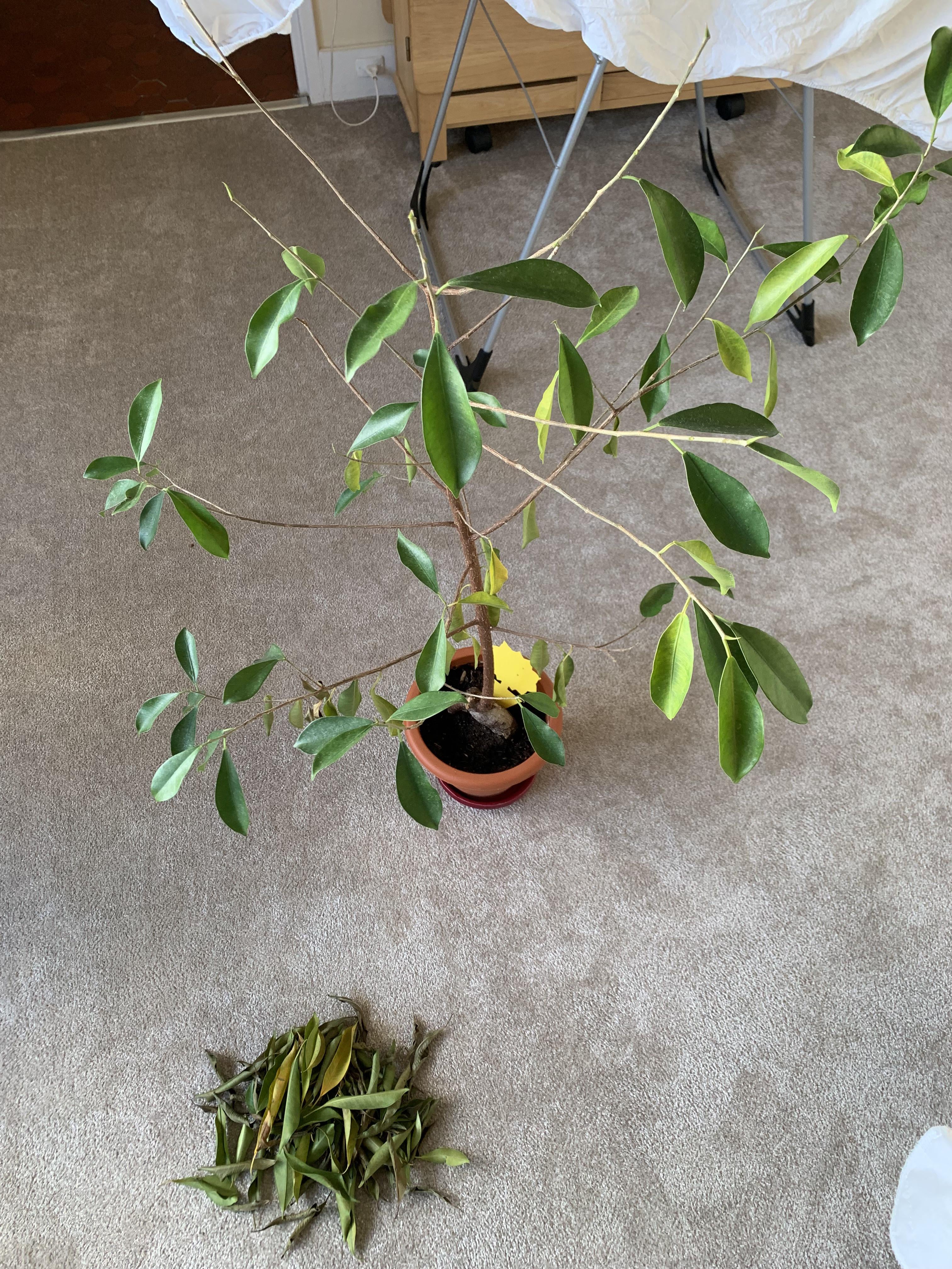 Vor einer Woche, als ich in den Urlaub fuhr, ging es ihm nicht besonders gut. Er verlor viele Blätter und der Boden war voller Mücken. Vor meiner Abreise habe ich Mücken, den gelben Aufkleber und Nematoden behandelt. Nach einer Woche ohne Wasser ist das Ergebnis, 3/4 der Blätter sind abgefallen, aber immerhin keine Mücken mehr. So ist heute die Hälfte seiner Zweige blattlos und die Hälfte der Blätter fällt nach unten und wird gelb. Wie kann ich es speichern? Soll ich es mehr gießen, den Standort ändern, die Zweige ohne Blätter abschneiden? Ich gieße es einmal pro Woche, indem ich die Erde bewässere, und entferne dann nach 15 Minuten das überschüssige Wasser in den Topf darunter. Er befindet sich in einem beheizten Innenraum, 1 m vom Fenster entfernt.