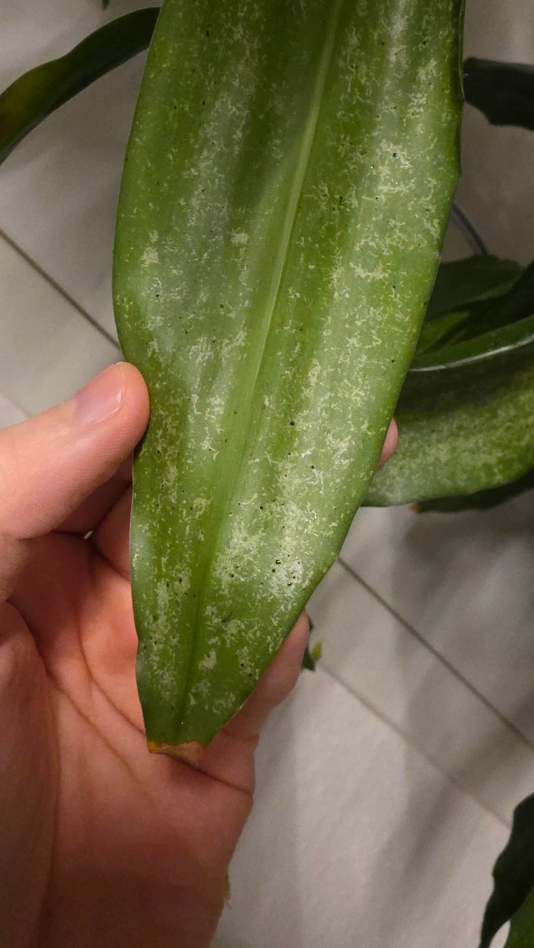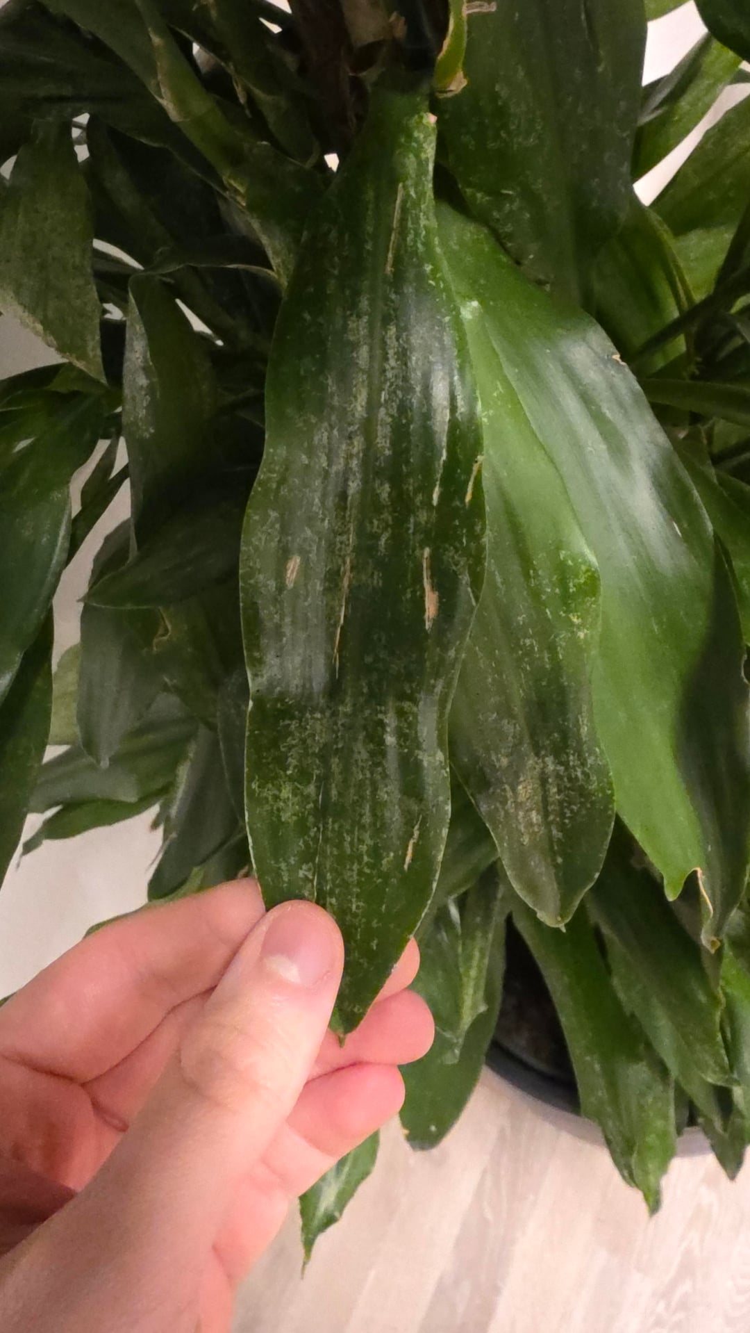 Ich habe diese wunderschöne (ca 1,60m große) Pflanze diesen Sommer gekauft. Es handelt sich laut Händler um einen Duftenden Drachenbaum. Die Pflanze steht im Eingangsbereich meiner Wohnung welcher seitdem die kalten Monate begonnen haben auch mal auf 17° runter kühlt. Seitdem wirkt er etwas schwächer bzw haben sich vor kurzen schwarzen Punkte entwickelt(Thripse? Finde aber keine Insekten), welche auf den Bildern zu sehen sind. Außerdem haben sich manche Blätter etwas "weiß"? gefärbt. Handelt es sich um einen Pilzbefall? Sollte ich die gesamte Pflanze abduschen? Helfen Pestizide oder Anti-Pilz Mittel?