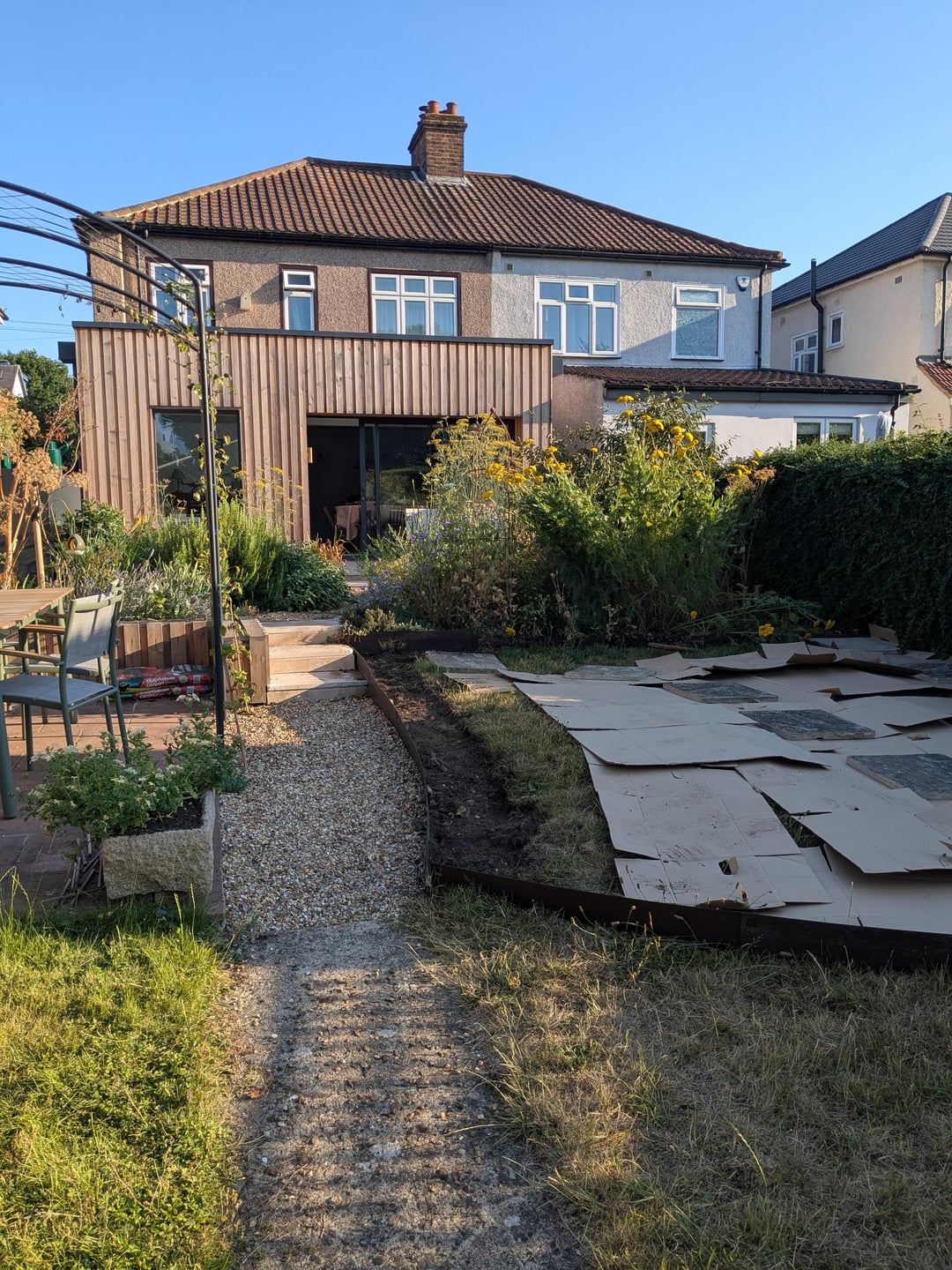 Das letzte Bild zeigt die neueste Erweiterung des Hauptbetts. Um den Pflanzraum zu schaffen, lege ich lediglich Pappe (die ich bei Freecycle bekomme) über den Rasen und füge eine Schicht Kompost hinzu (kaufe dir dafür einen großen Beutel, da das viel wirtschaftlicher ist). und dann in den Kompost pflanzen, wobei ich durch die Pappe und den Rasen schneide, wo ich tiefer gehen muss, um Sträucher zu pflanzen. Nach einer Saison ist der Rasen unter der Pappe verschwunden.